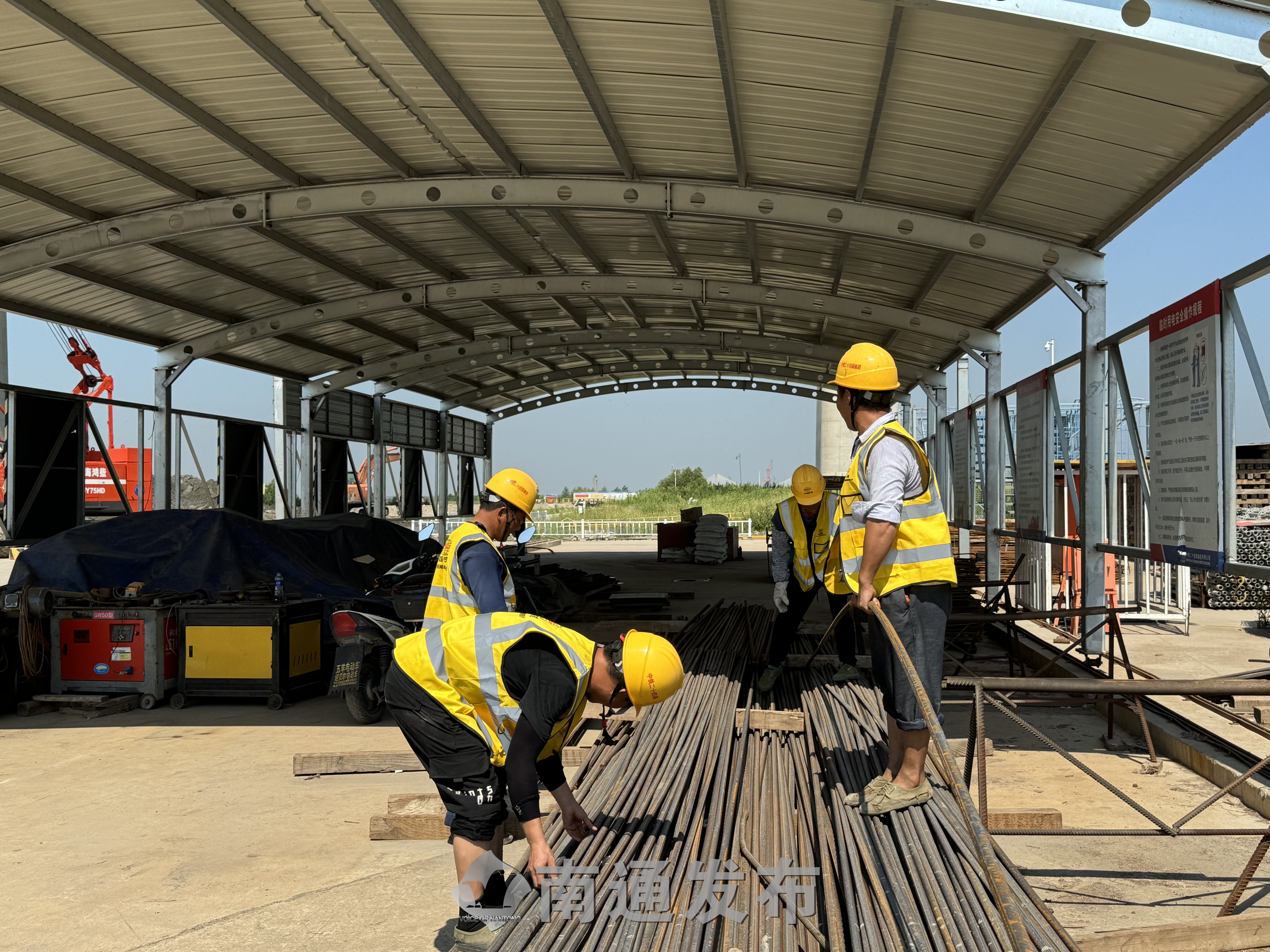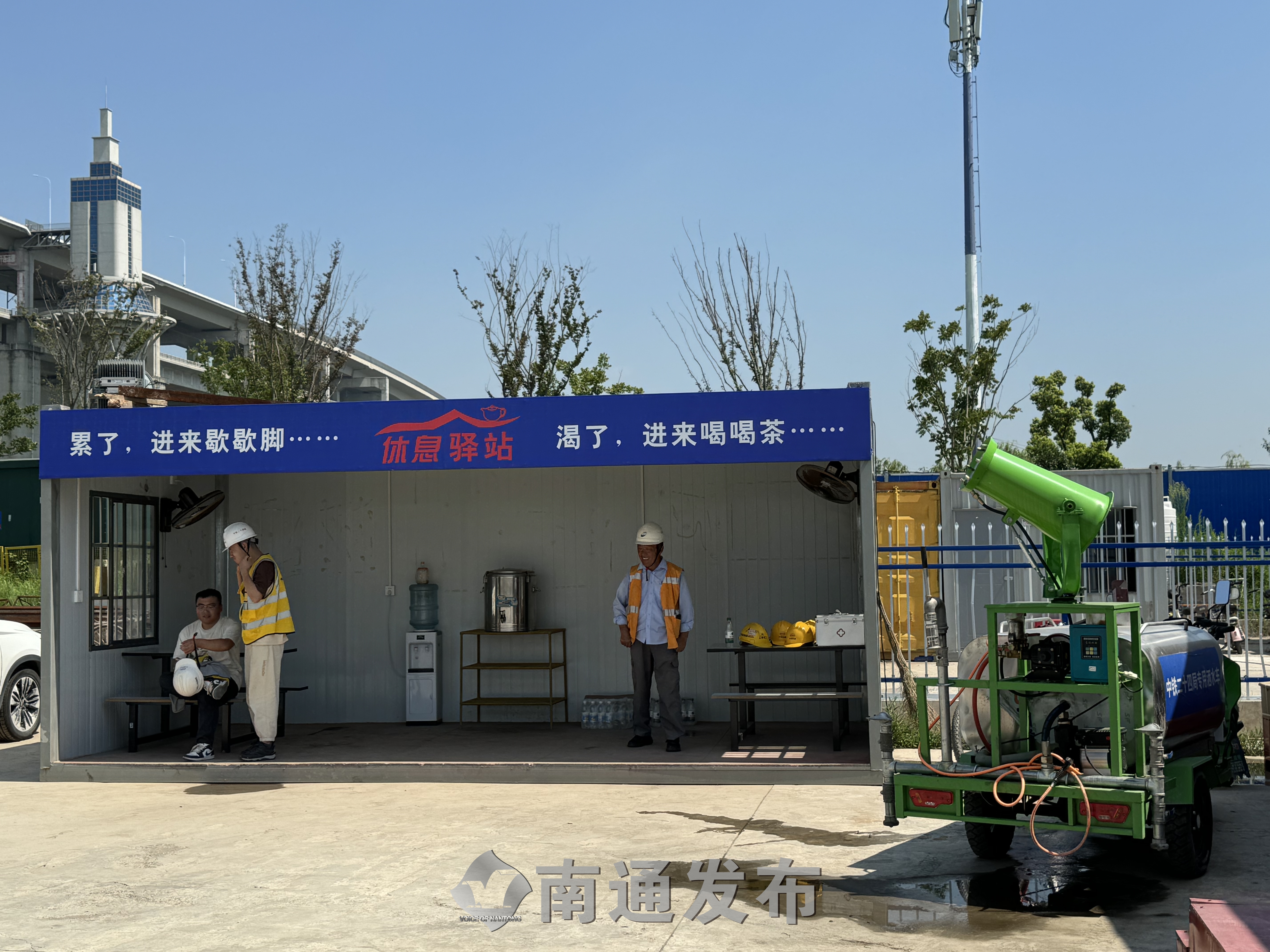 盛夏高温,施工人员的皮肤被晒得黝黑,身上的衣服也是湿了干、干了又湿。为确保施工安全,项目部第一时间采取防暑降温措施,为一线工人搭建了休息驿站,放置凉茶、矿泉水、医药箱等物品供取用。同时,合理安排作业时间,避开10:00至16:00的高温时段,防止因高温中暑发生意外,确保工程在安全的情况下按序时进度稳步推进。