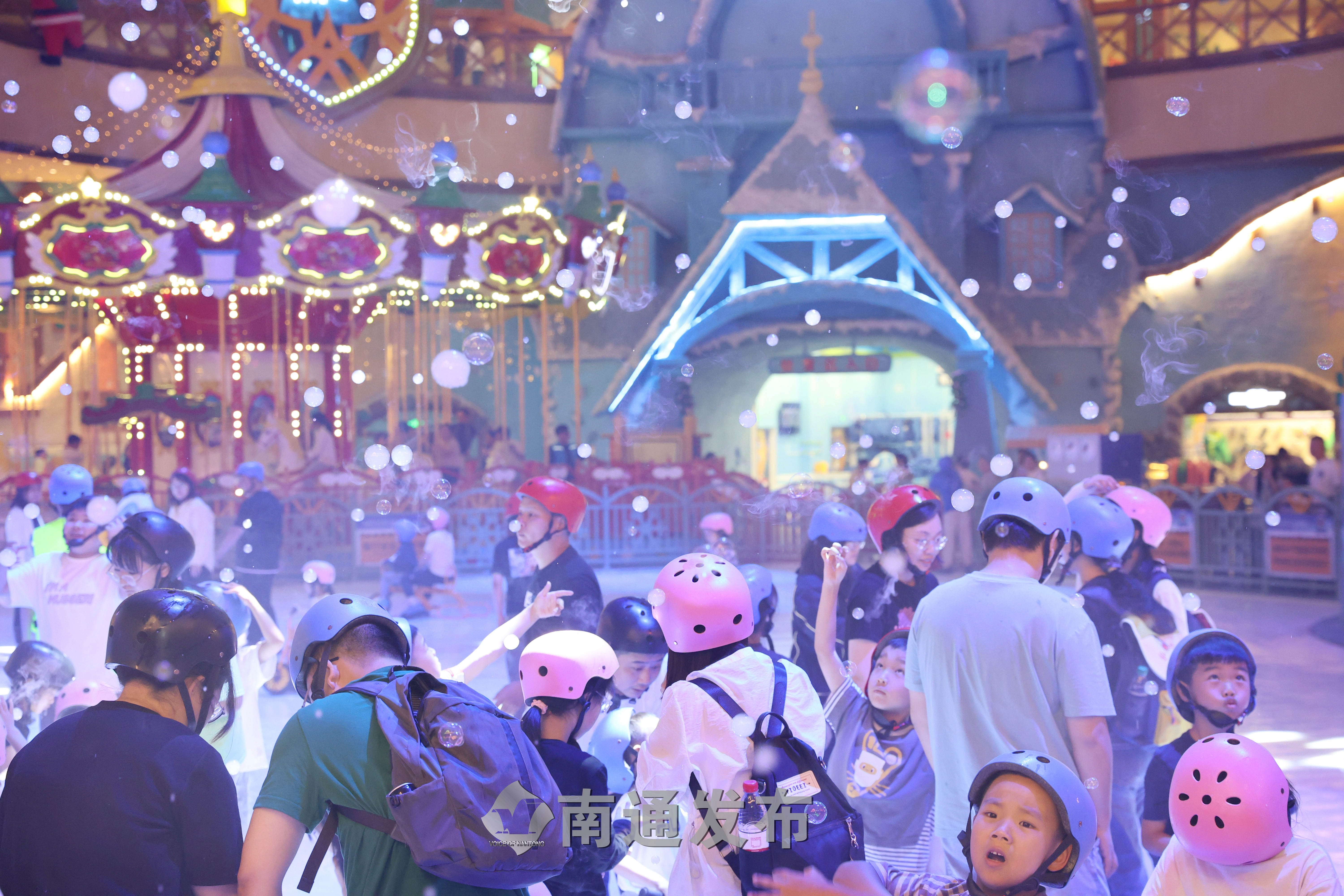 2024年8月4日,众多游客在位于崇川区幸福街道的森迪冰雪乐园赏冰玩雪、消暑休闲。这座梦幻般的冰雪王国迎来了暑期以来的最大客流高峰,单日入园人数突破8500人次大关,刷新了冰雪乐园历史纪录,在炎炎夏日中掀起了强劲的“冰雪热”。