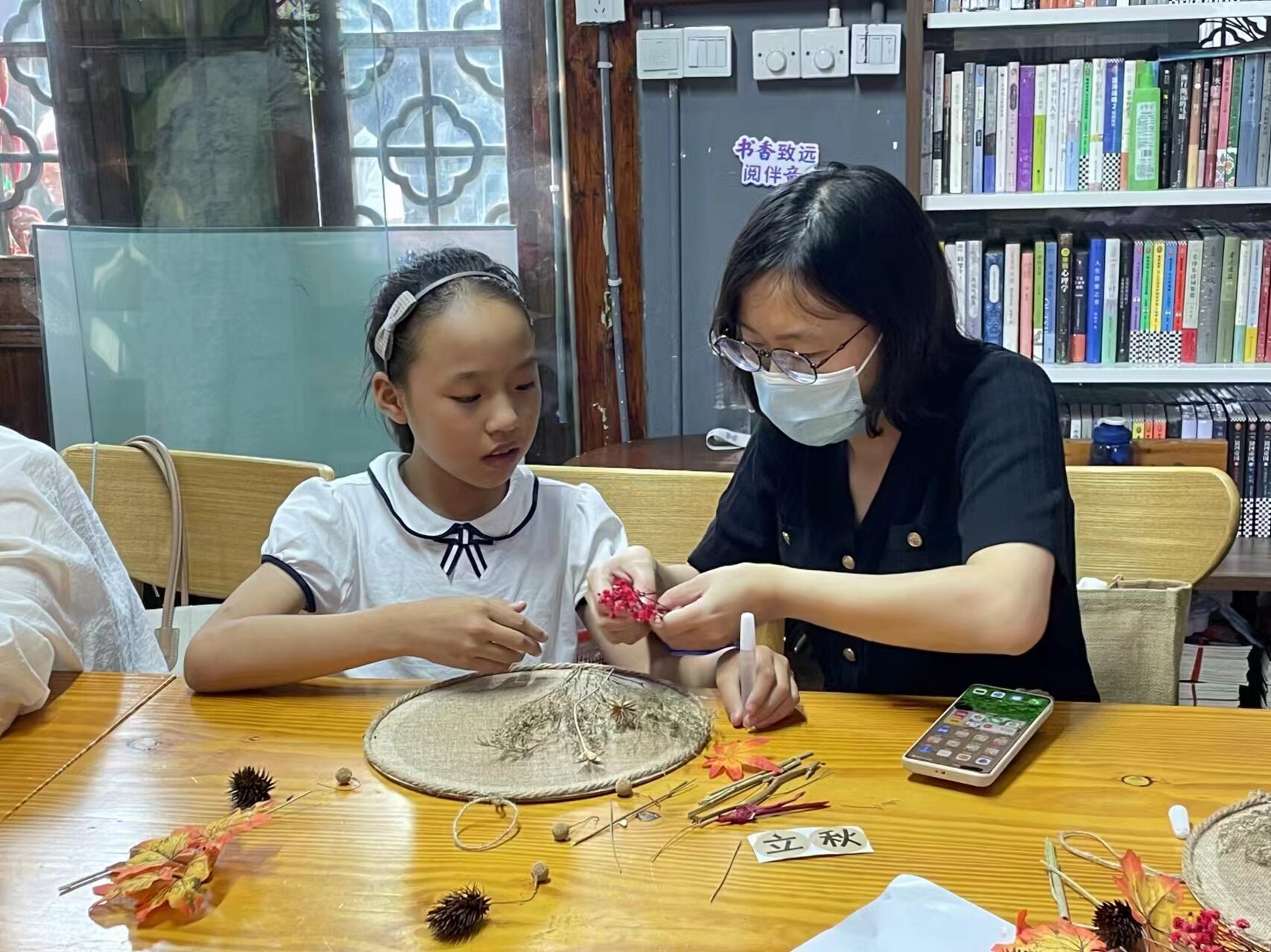 来自无锡太湖学院的返乡大学生褚乐怡通过PPT,讲解立秋习俗,让孩子们和家长们了解立秋的特殊意义。在老干部洪正福的耐心引导下,孩子们和家长们纷纷动手制作立秋主题装饰画。将心中对秋天的想象化作一幅幅生动的画作。