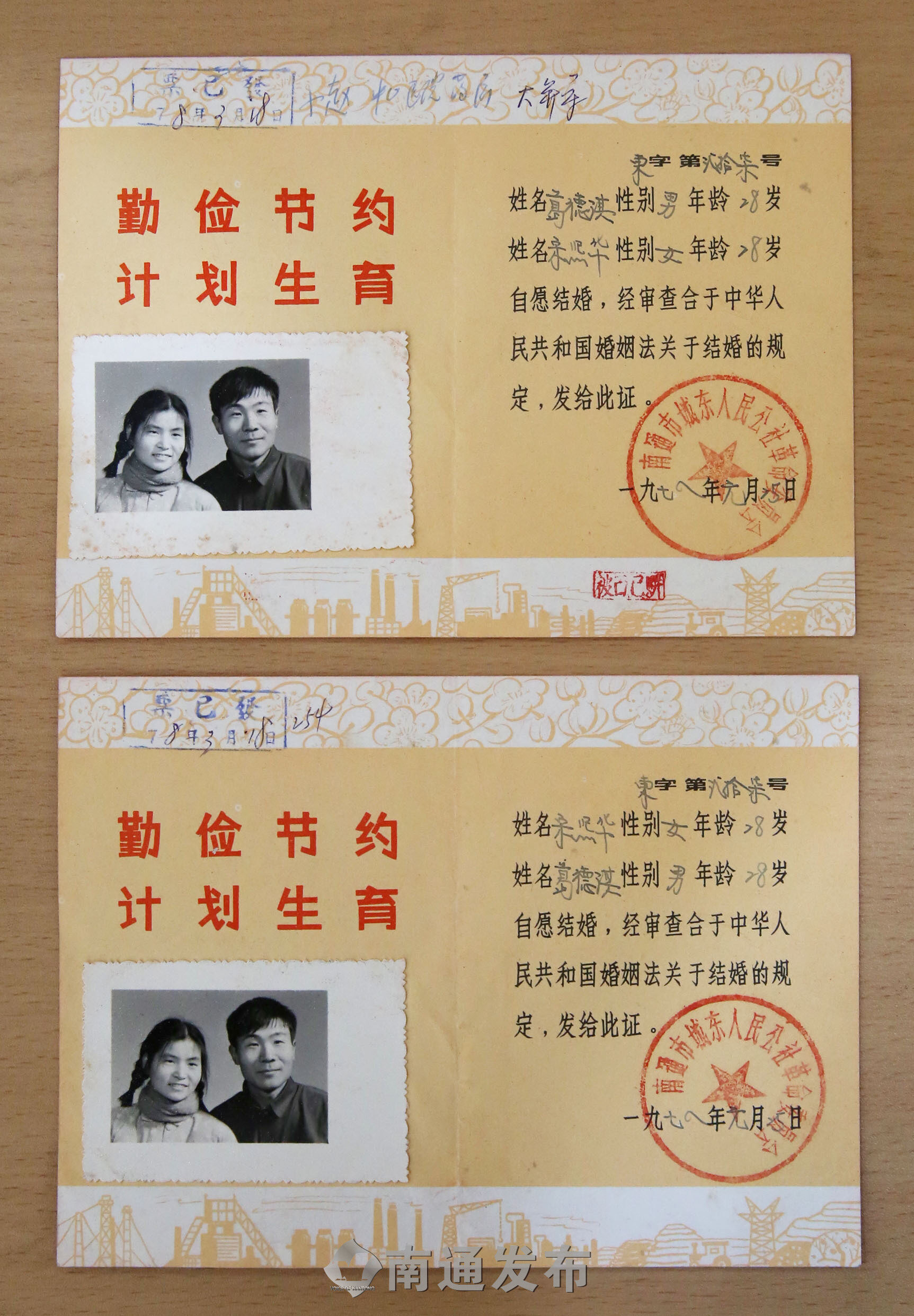 74岁的葛德淇、宋熙华夫妻珍藏着46年前领到的结婚证,领证日期是1978年1月25日,“勤俭节约、计划生育”标语印在结婚证上。“我和老伴是初中、高中同班同学,但那时男女同学之间几乎没有交流,同窗多年甚至不熟悉对方。”葛德淇说,还是工作以后在妻子婶婶牵线下才开始与她谈恋爱,三年后,两人携手走进婚姻殿堂。