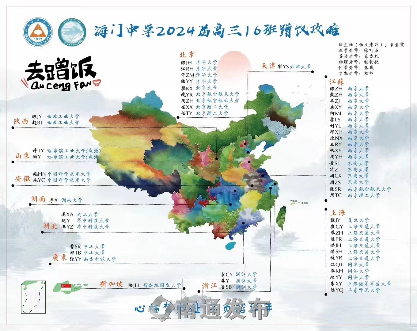 最近,江苏省海门中学2024届高三(16)班“蹭饭图”新鲜出炉刷爆朋友圈!“全班57名同学全部考取重点大学,其中录取C9高校共31人。”45岁的张春蕾,展示儿子班级“蹭饭图”时充满了自豪感,“他考取‘国防七子’之一的西北工业大学,专业是软件工程。”