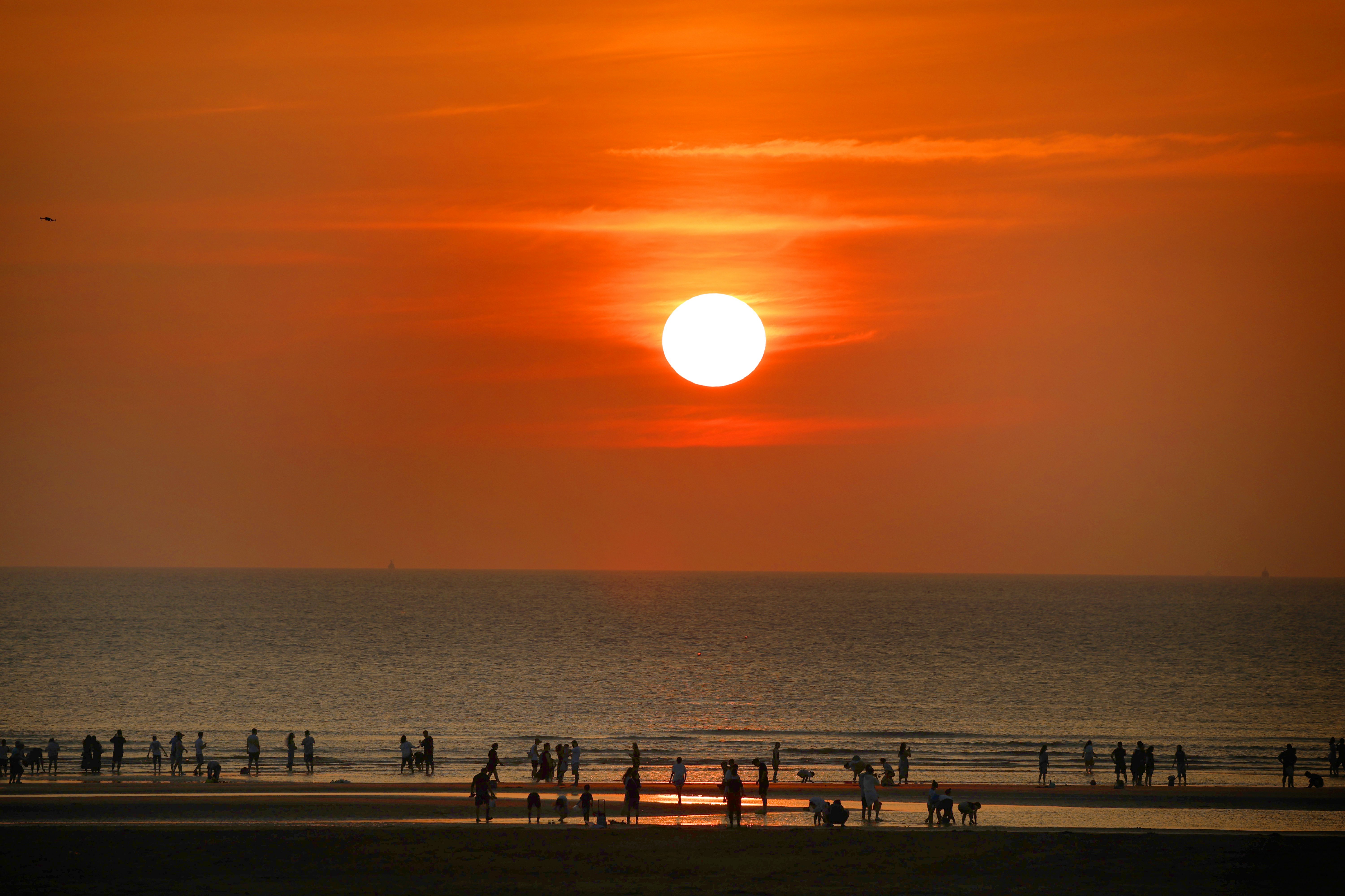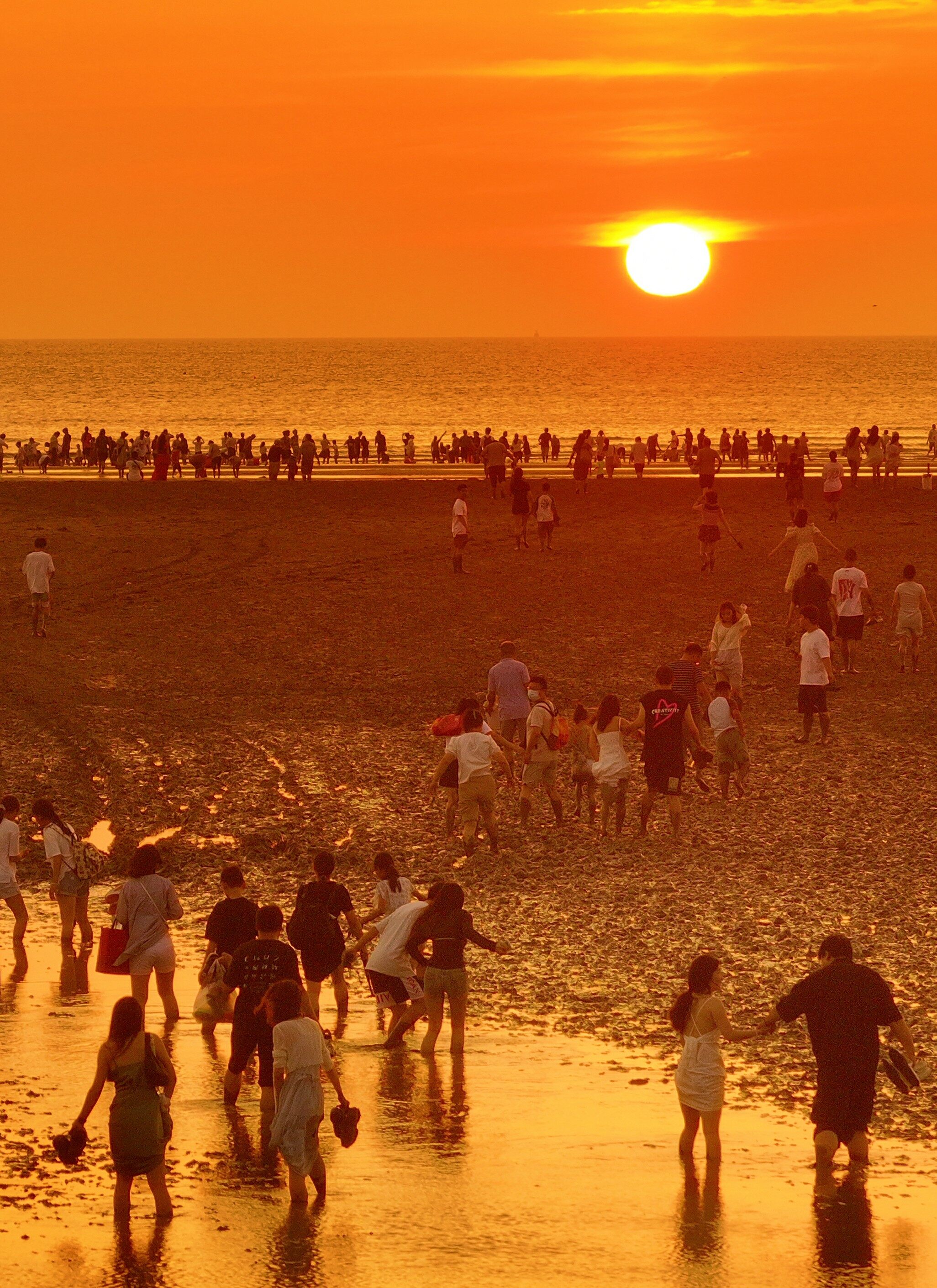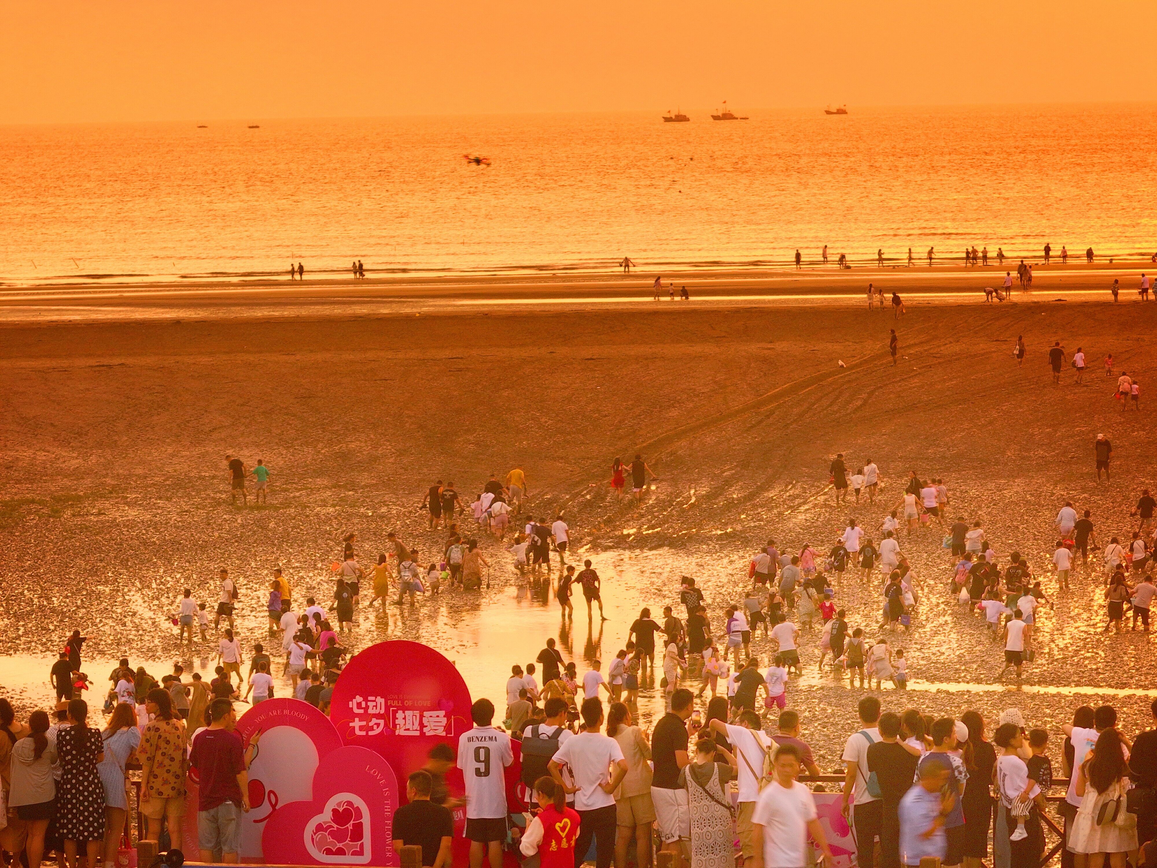 2024年8月10日在启东圆陀角拍摄的日出时分黄金海滩美丽景色。当日是中国传统节日“七夕”,6000多名游客在这里欣赏“七夕”海上日出。