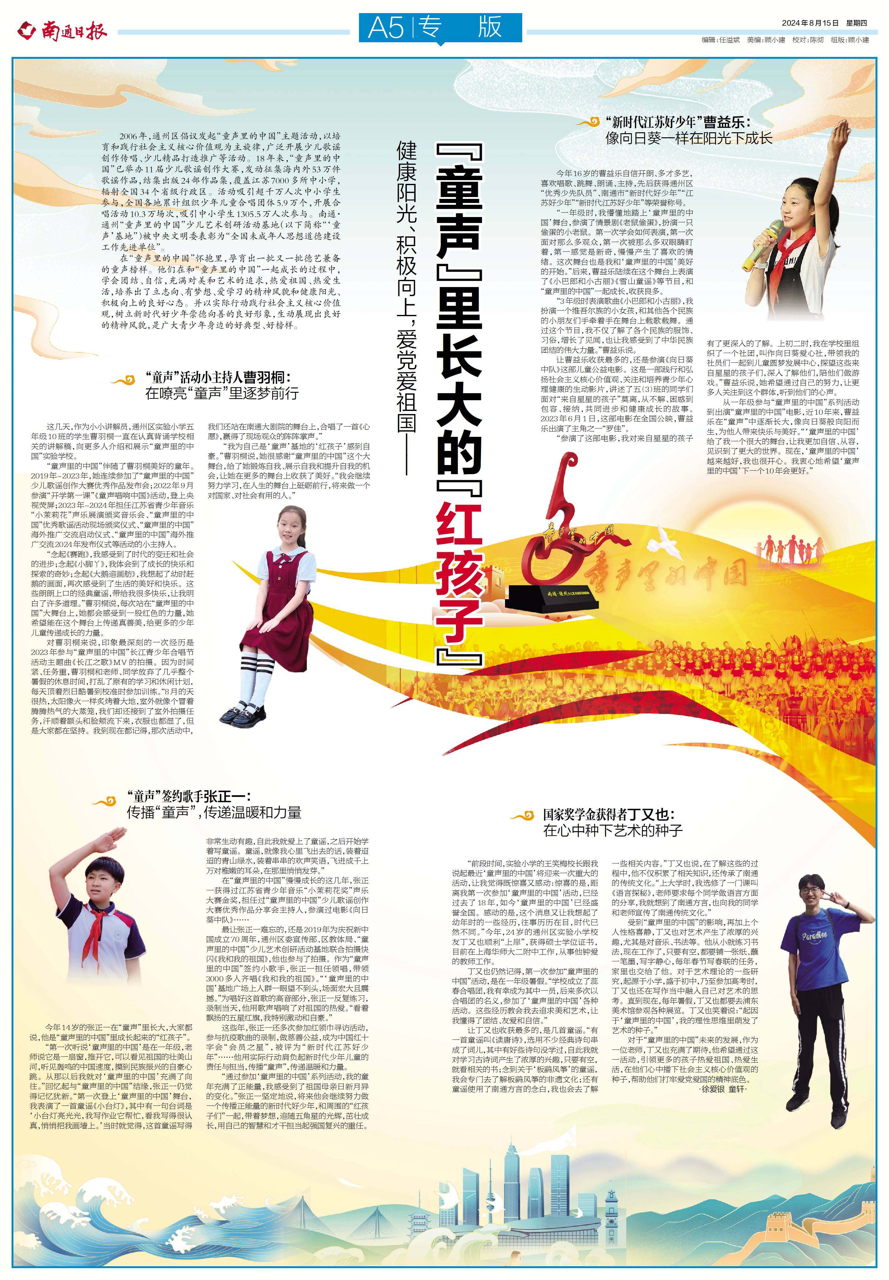 “我为自己是‘童声’基地的‘红孩子’感到自豪。”曹羽桐说,她很感谢“童声里的中国”这个大舞台,给了她锻炼自我、展示自我和提升自我的机会,让她在更多的舞台上收获了美好。“我会继续努力学习,在人生的舞台上砥砺前行,将来做一个对国家、对社会有用的人。”