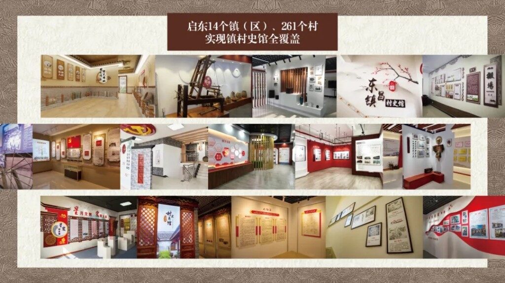 启东打造出一个个特色鲜明的“一镇一品”“一村一品”镇村史馆。吕四港镇吕滨村、海晏村等沿海村落重点打造仙渔文化专线;海复镇滨海村、均里村、搬场村依托张謇创办实业和教育遗存打造垦牧文化专线;王鲍镇九令村、更生村,合作镇洋桥村、臣义村等革命老区的村落推出红色文化专线……2021年底,启东市14个镇(区)、261个村实现镇村史馆全覆盖。