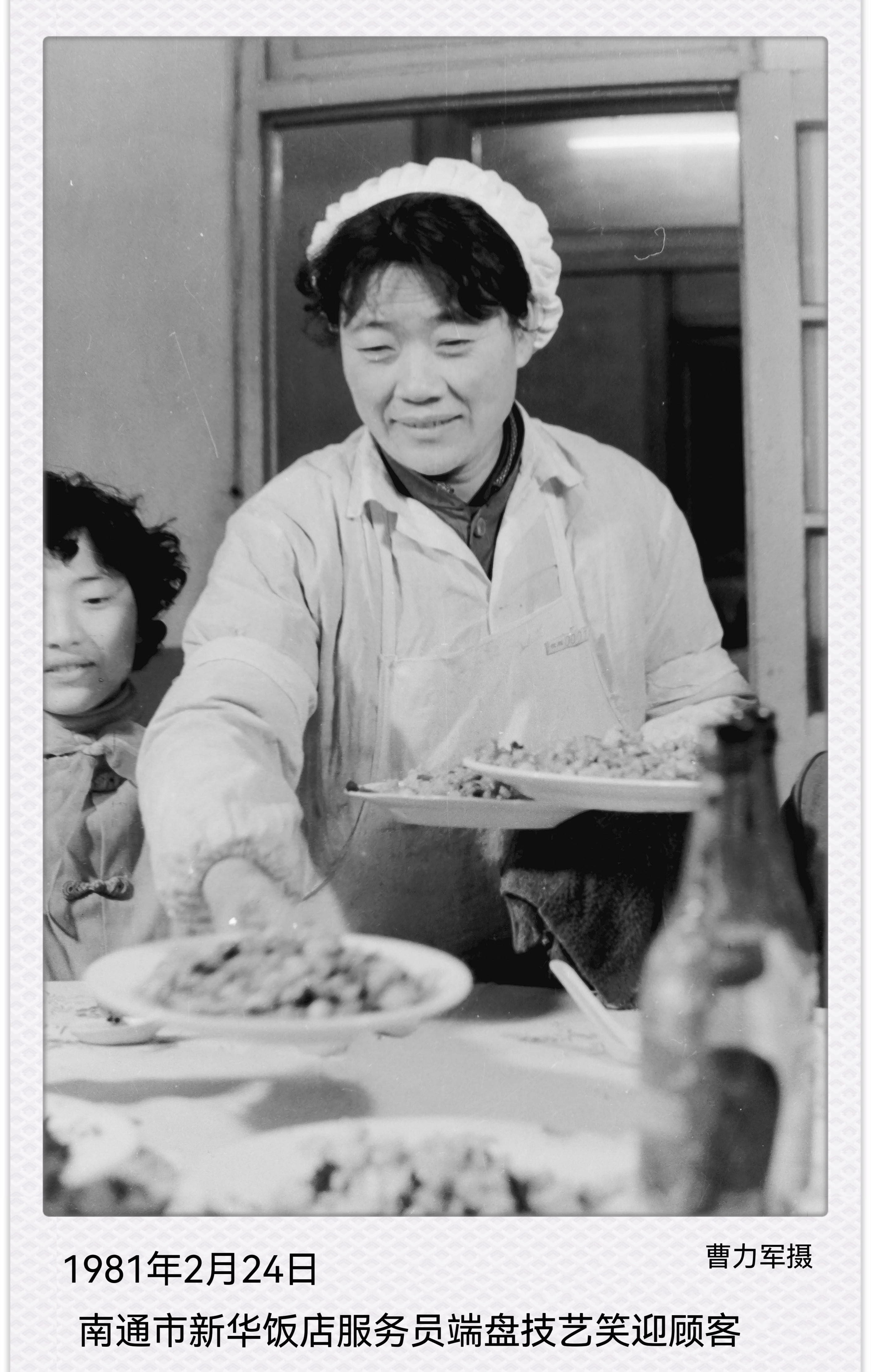 当年在新华饭店,曹力军拍摄了一位服务员端盘子为顾客上菜的画面。画面中,这位服务员笑容可掬,左手叠托着两盘菜,右手将一盘菜送上桌。这幅竖幅照片抓拍生动,人物表情自然生动。“当时是春节过后,一家人在新华饭店聚会,气氛欢乐而祥和。”曹力军说,遗憾的是,这位服务员的姓名,当时没有记录下来。