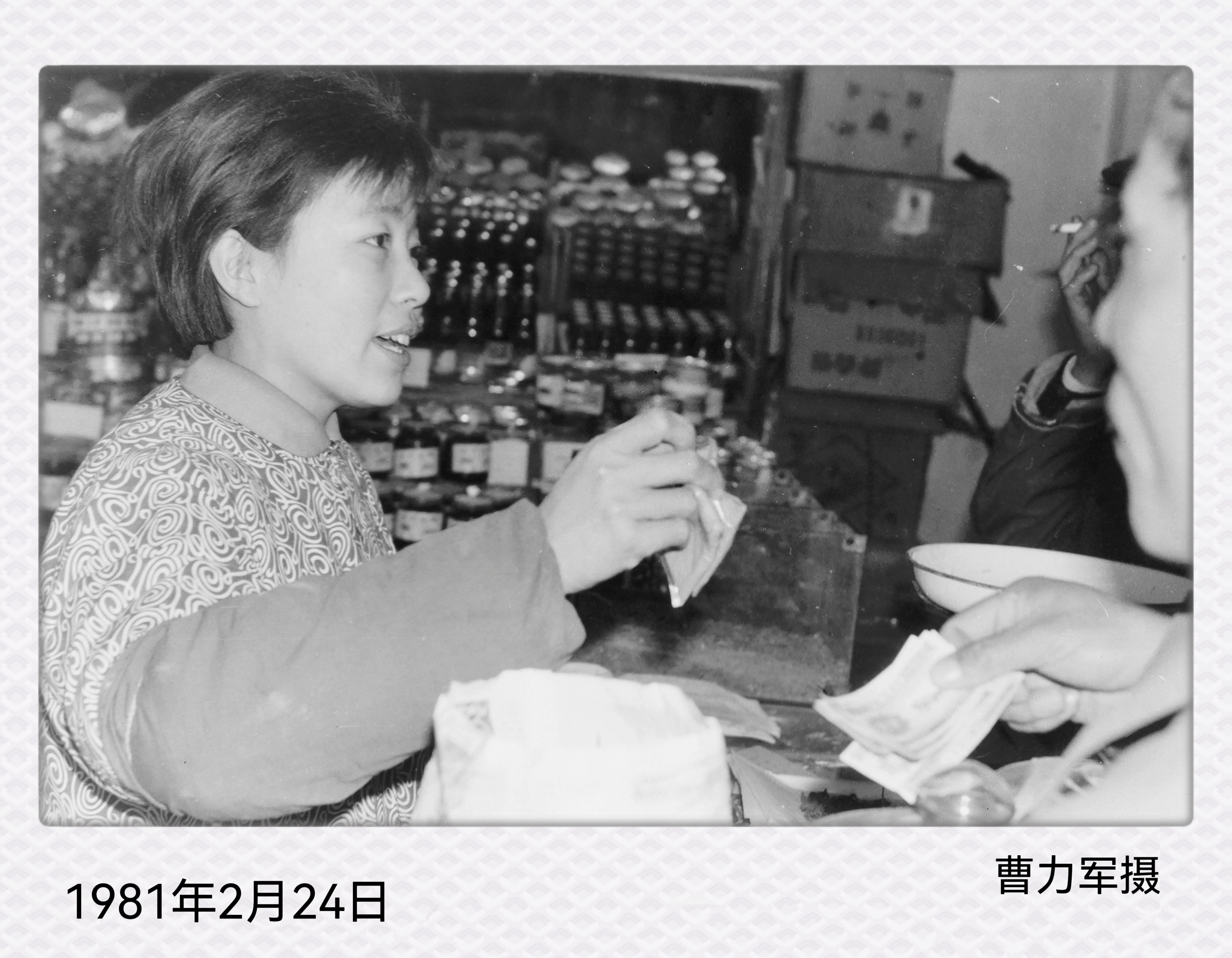 20世纪80年代初,当年的曹力军虽然年龄不大,但学习摄影多年,摄影技术已经十分娴熟。曹力军回忆,南北货商店共三间房,在西面一间房拍摄,他用苏联生产的基辅相机抓拍姚经蓉为顾客热情服务的场景,“那天,我还专门带了一盏碘钨灯照明。多年后,看照片效果还是很好的,画面中的瓶子都是亮闪闪的。”