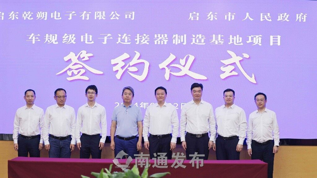 9月22日,乾朔车规级电子连接器制造基地项目签约仪式在启东市行政中心举行。启东乾朔电子有限公司董事长王涧鸣、总经理王佳文等参加签约仪式。