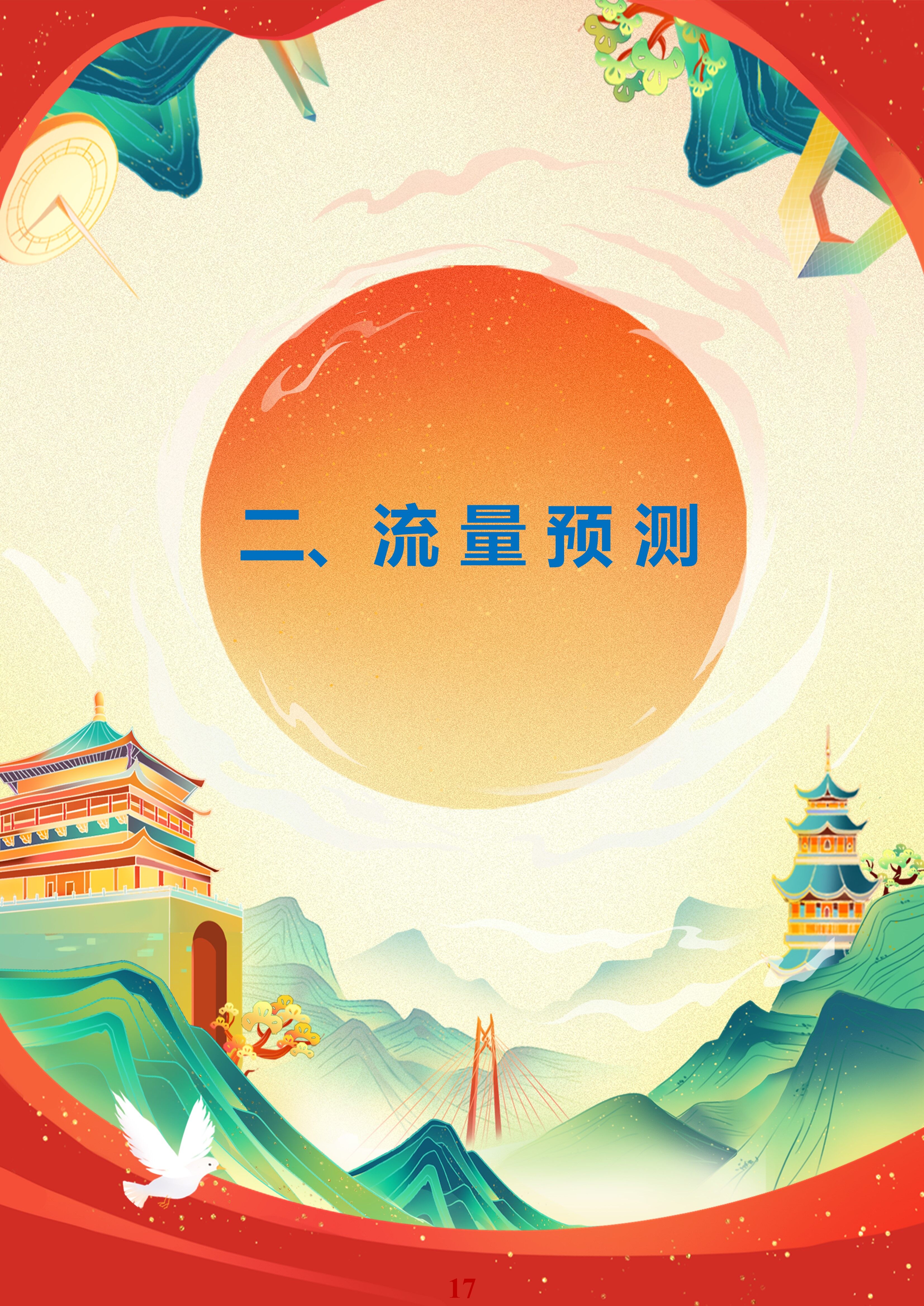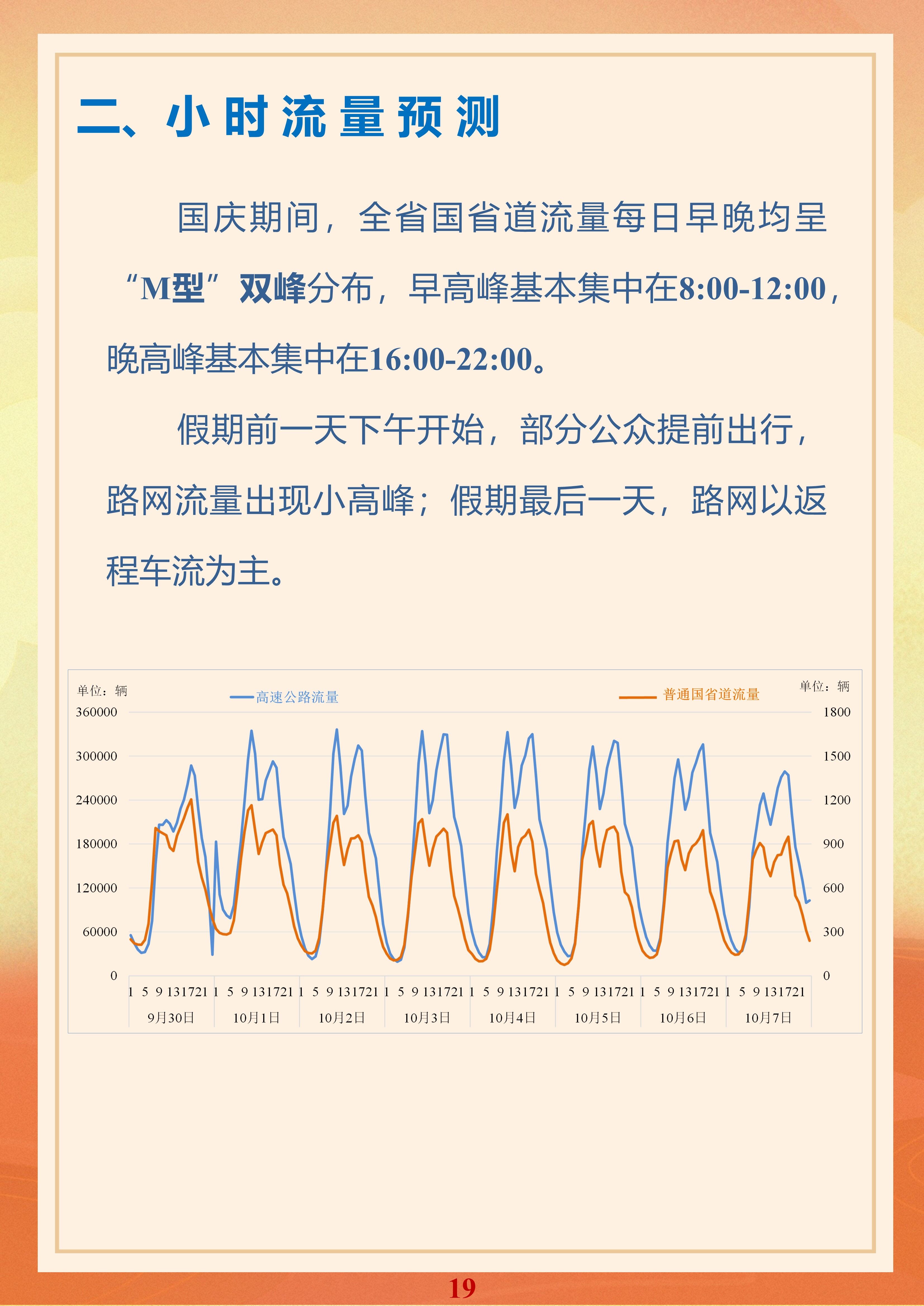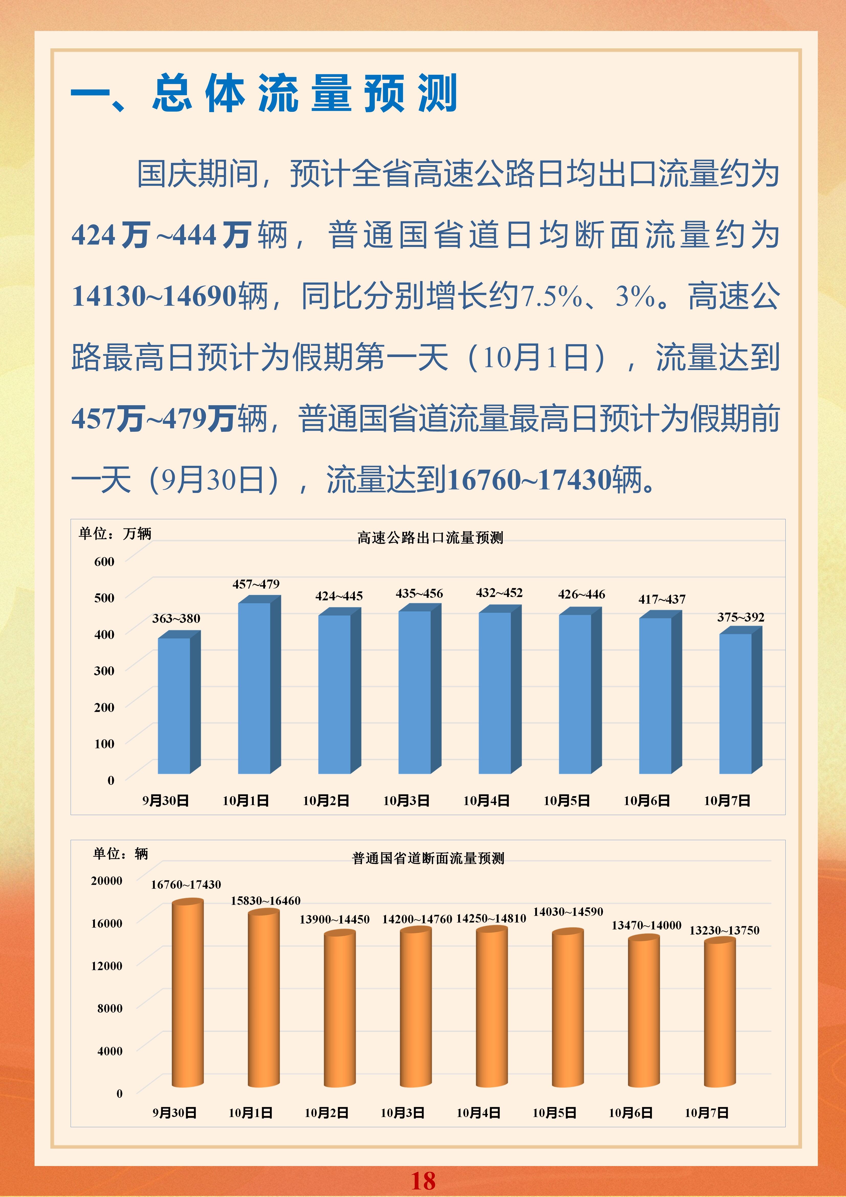 流量预测:预计全省高速公路日均出口流量424万-444万辆,普通国省道日均断面流量约为14130-14690辆,同比分别增长约7.5%、3%。高速公路、普通国省道流量最高日预计均为假期前一天(10月1日),流量分别达到457万-479万辆、16760-17430辆。