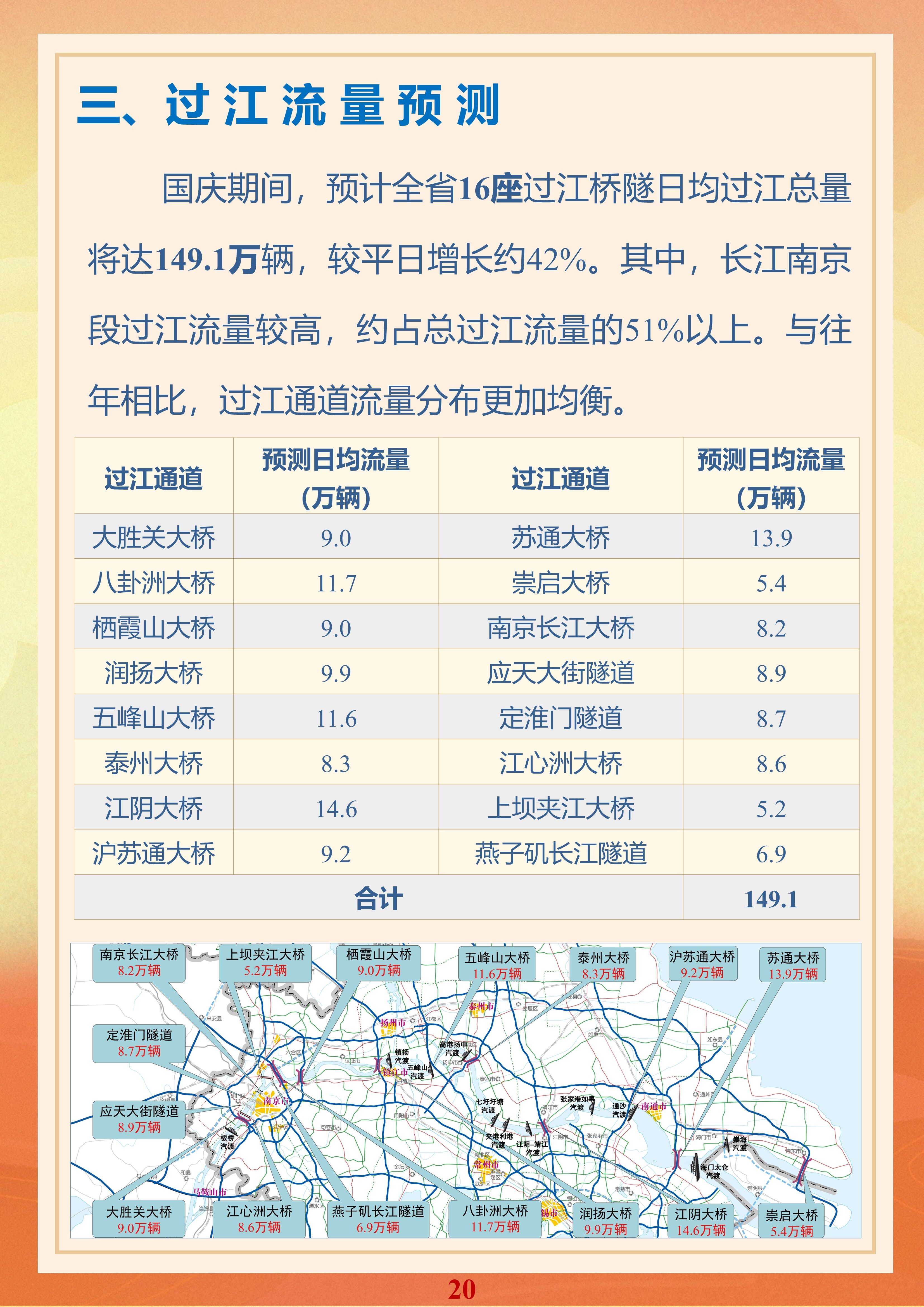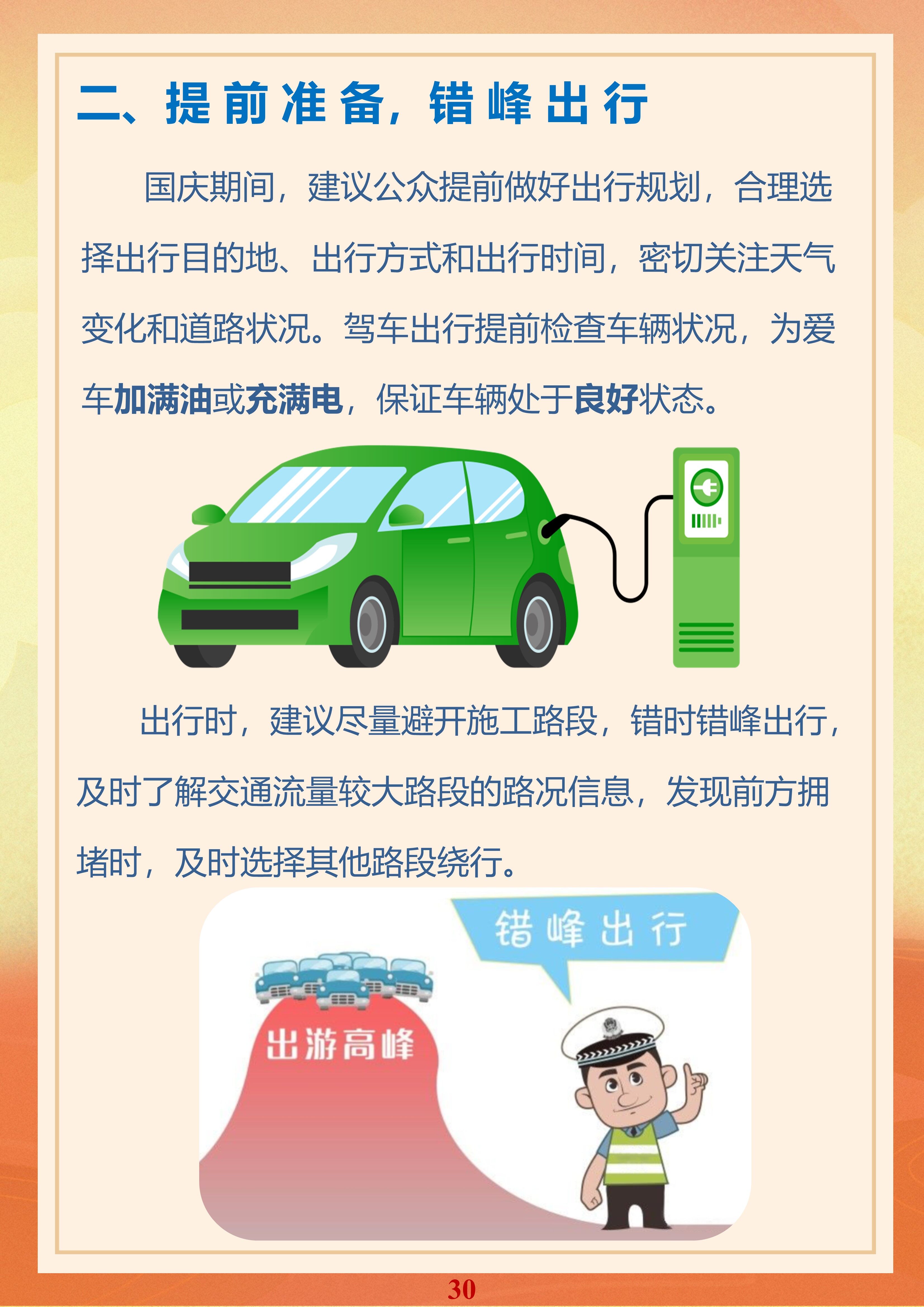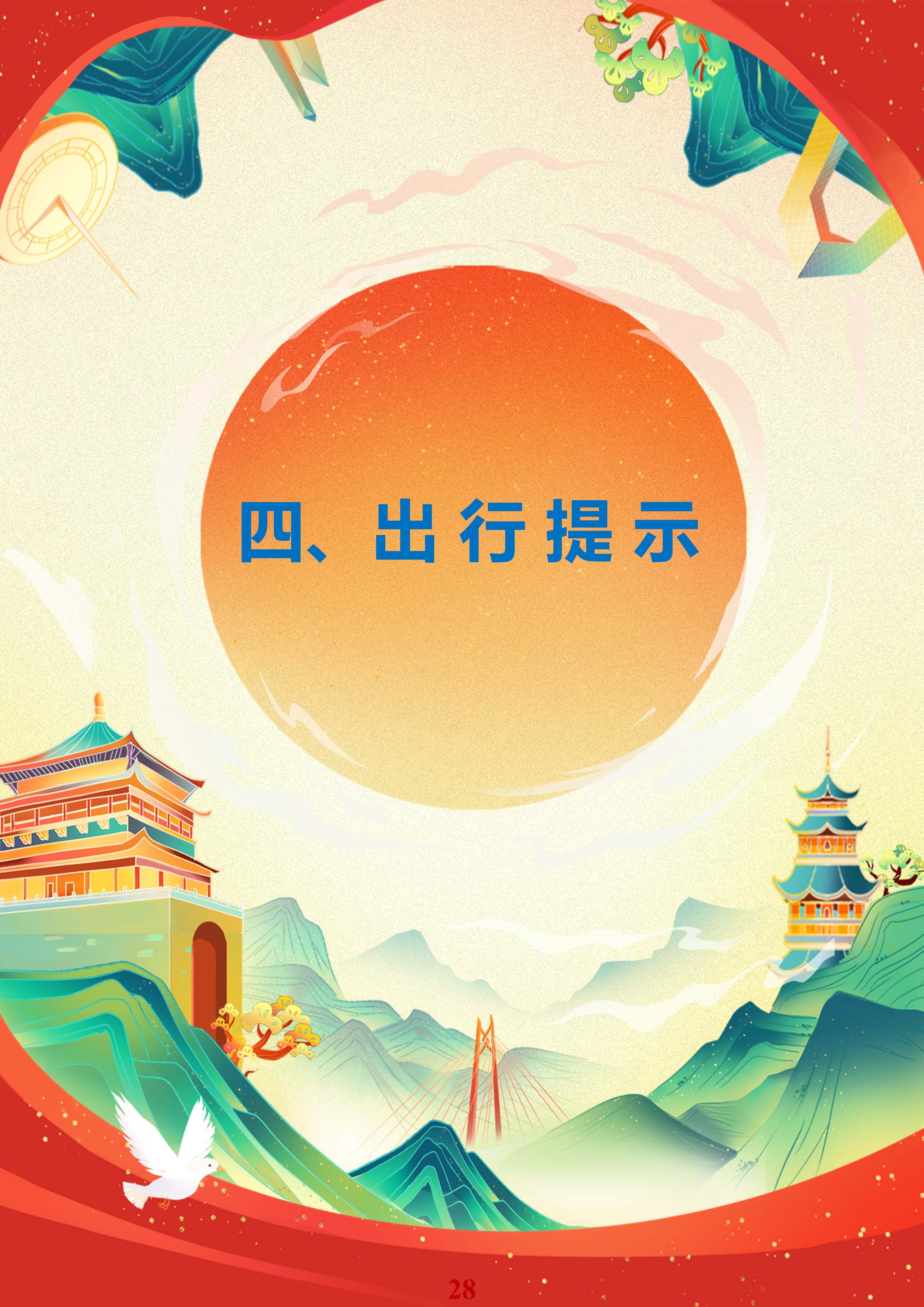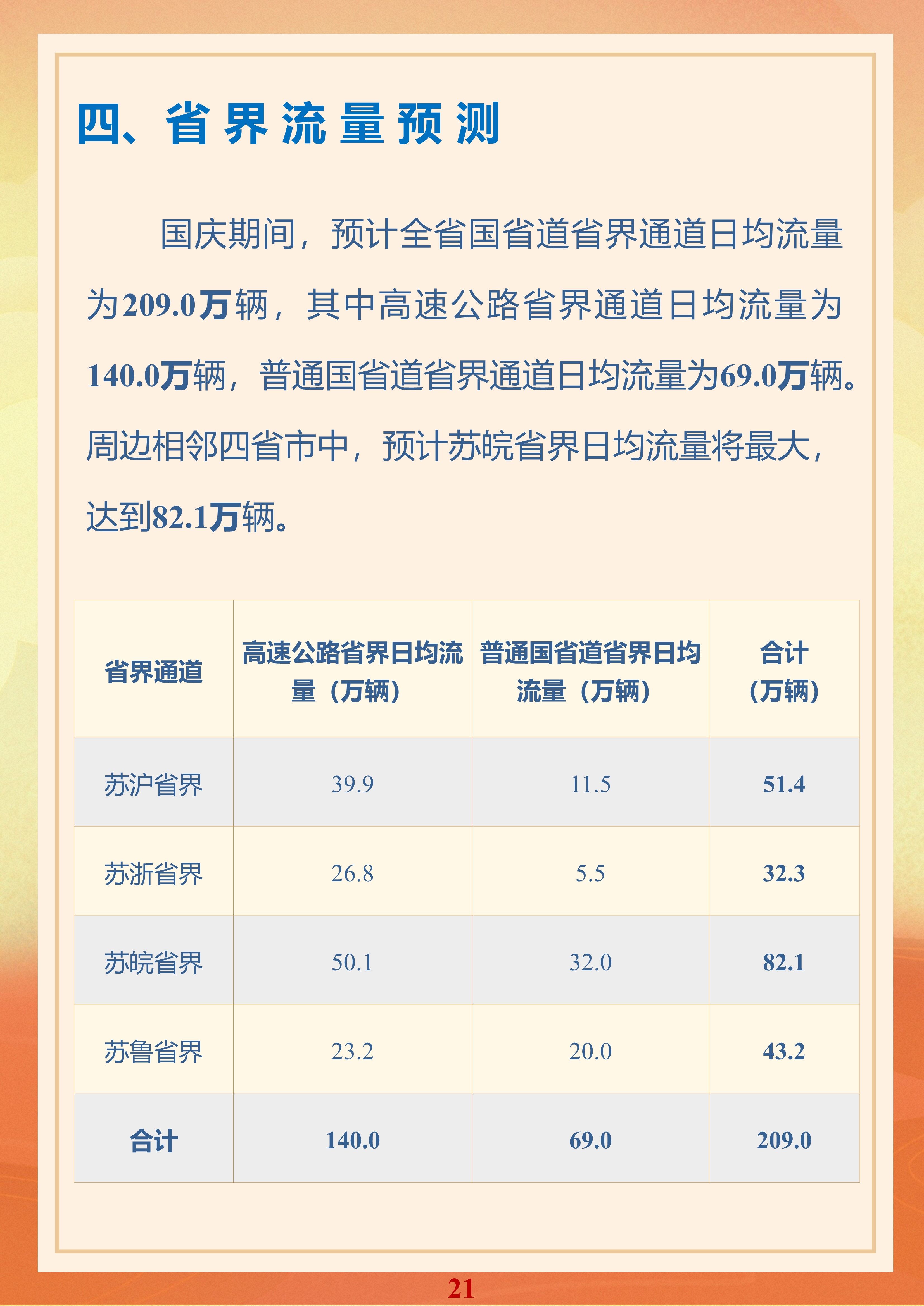 流量预测:预计全省高速公路日均出口流量424万-444万辆,普通国省道日均断面流量约为14130-14690辆,同比分别增长约7.5%、3%。高速公路、普通国省道流量最高日预计均为假期前一天(10月1日),流量分别达到457万-479万辆、16760-17430辆。