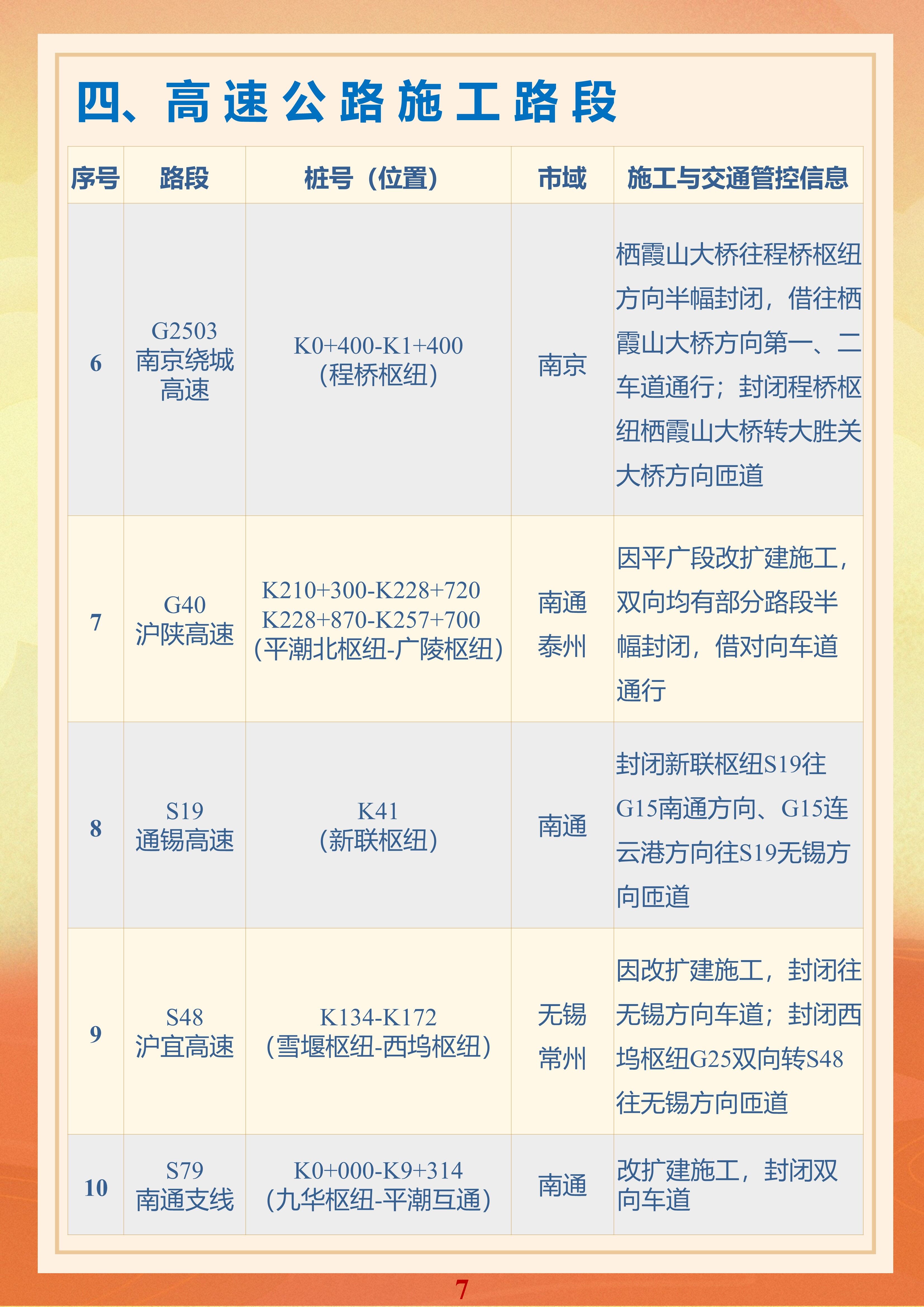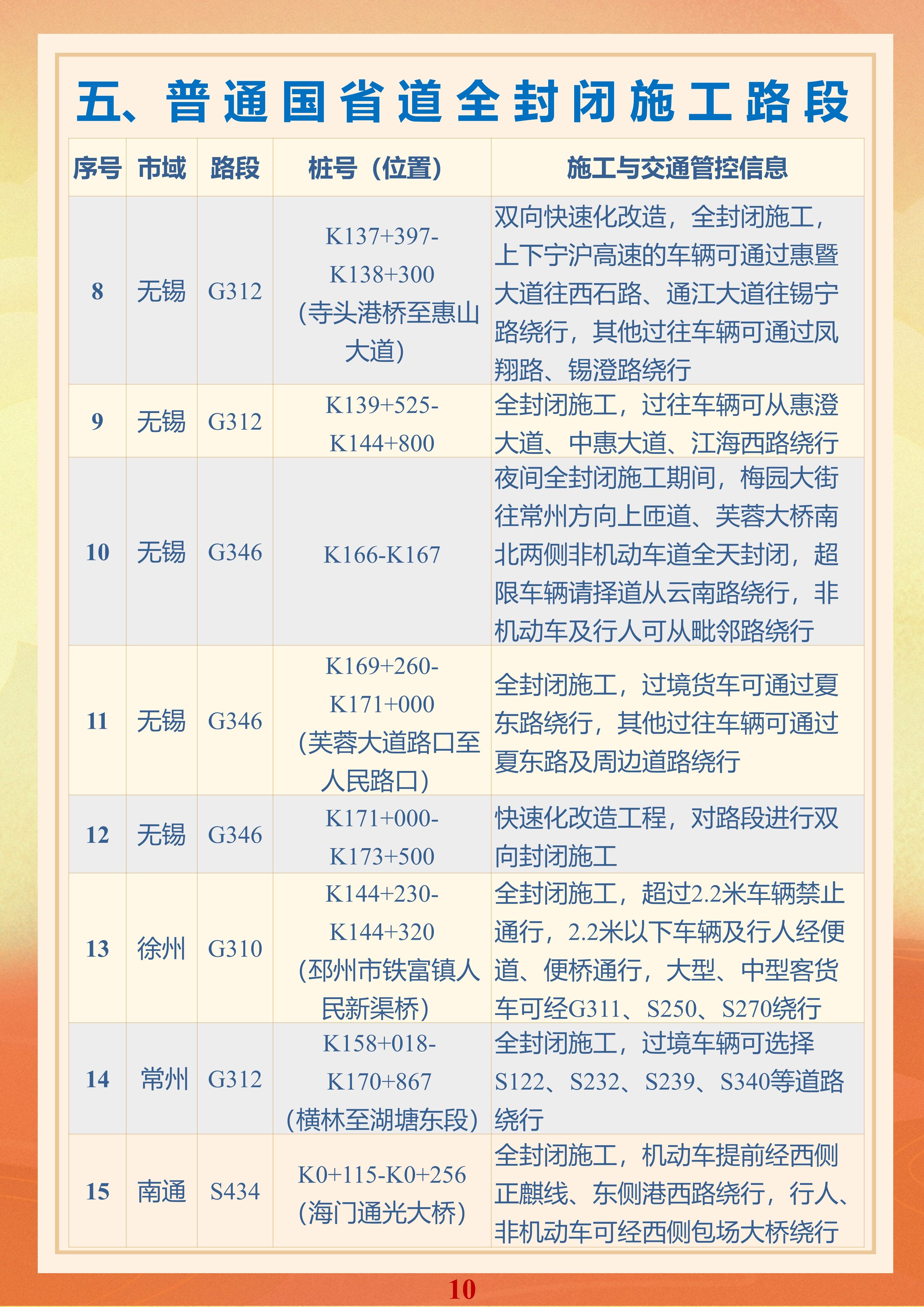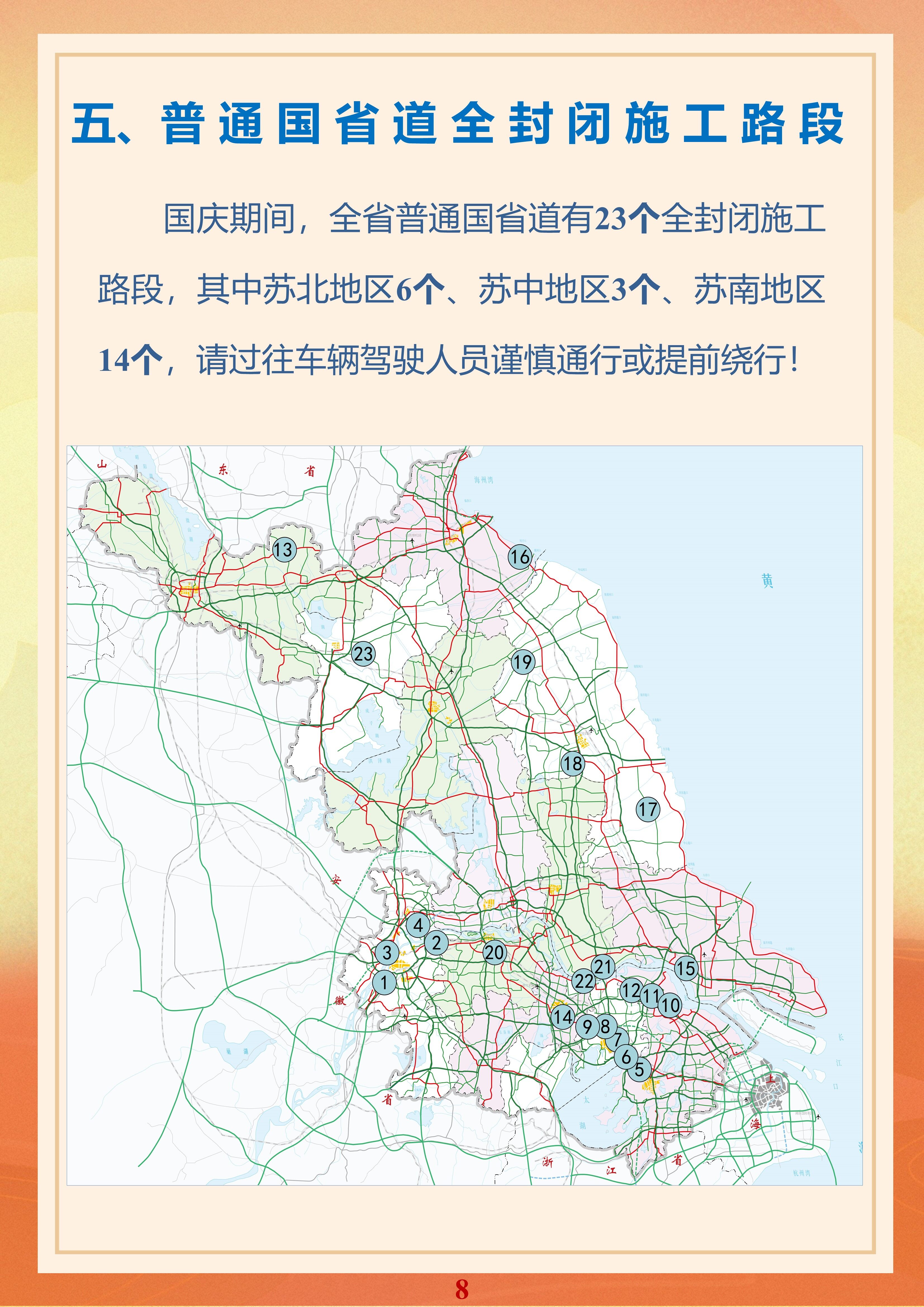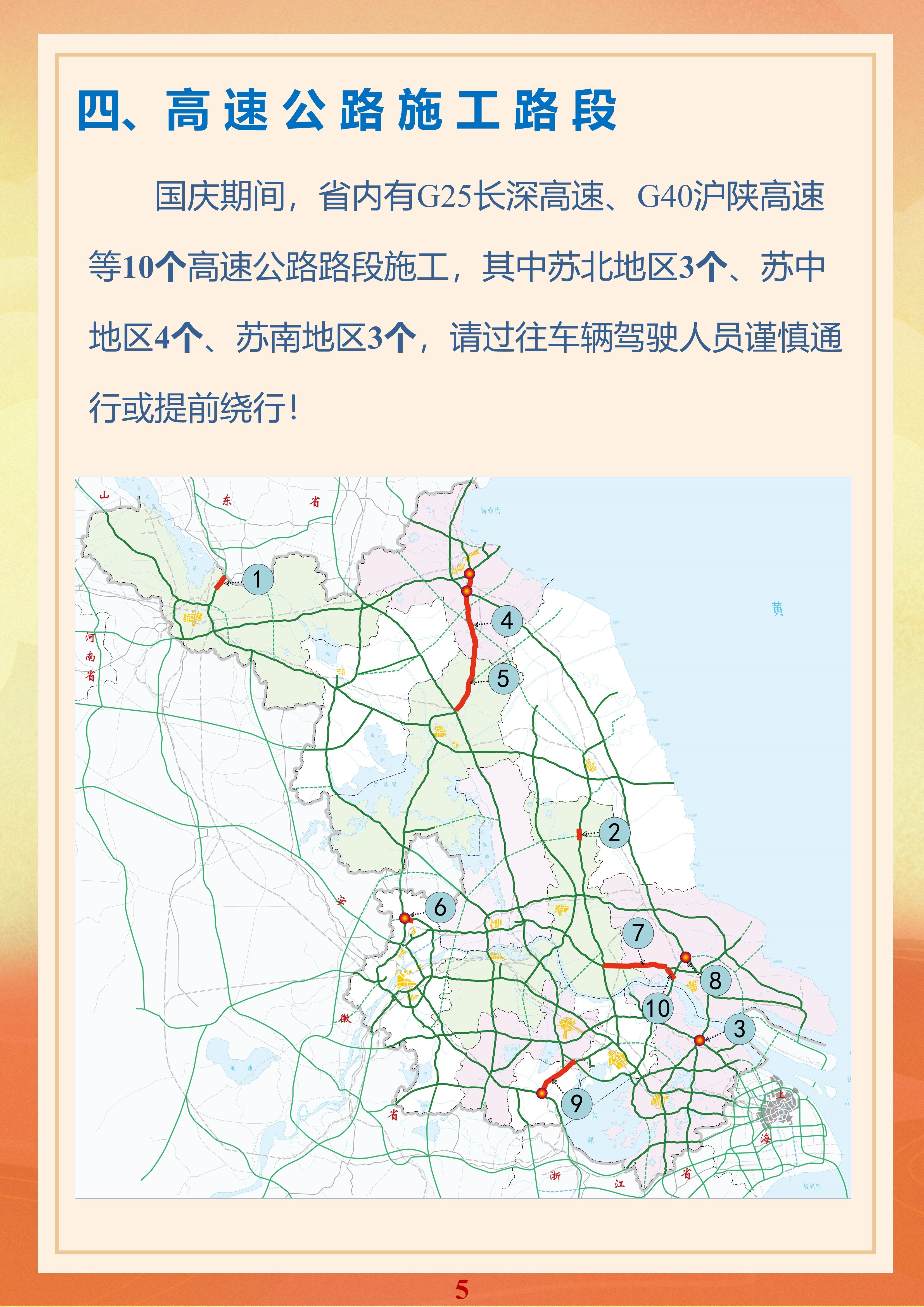 温馨提示:国庆期间,省内有G25长深高速、G40沪陕高速等10个高速公路路段施工,其中苏北地区3个、苏中地区4个、苏南地区3个,请过往车辆驾驶人员谨慎通行或提前绕行。