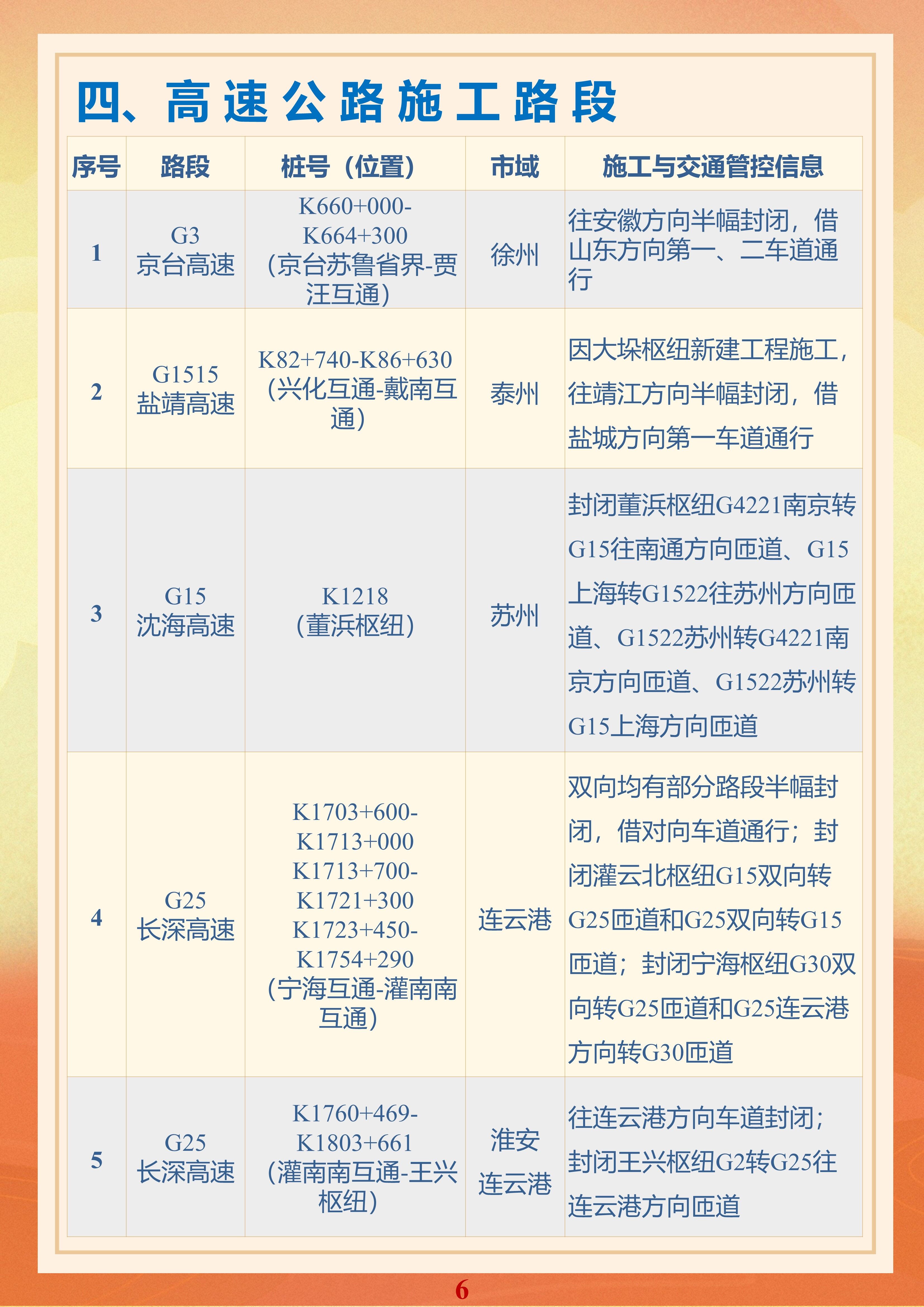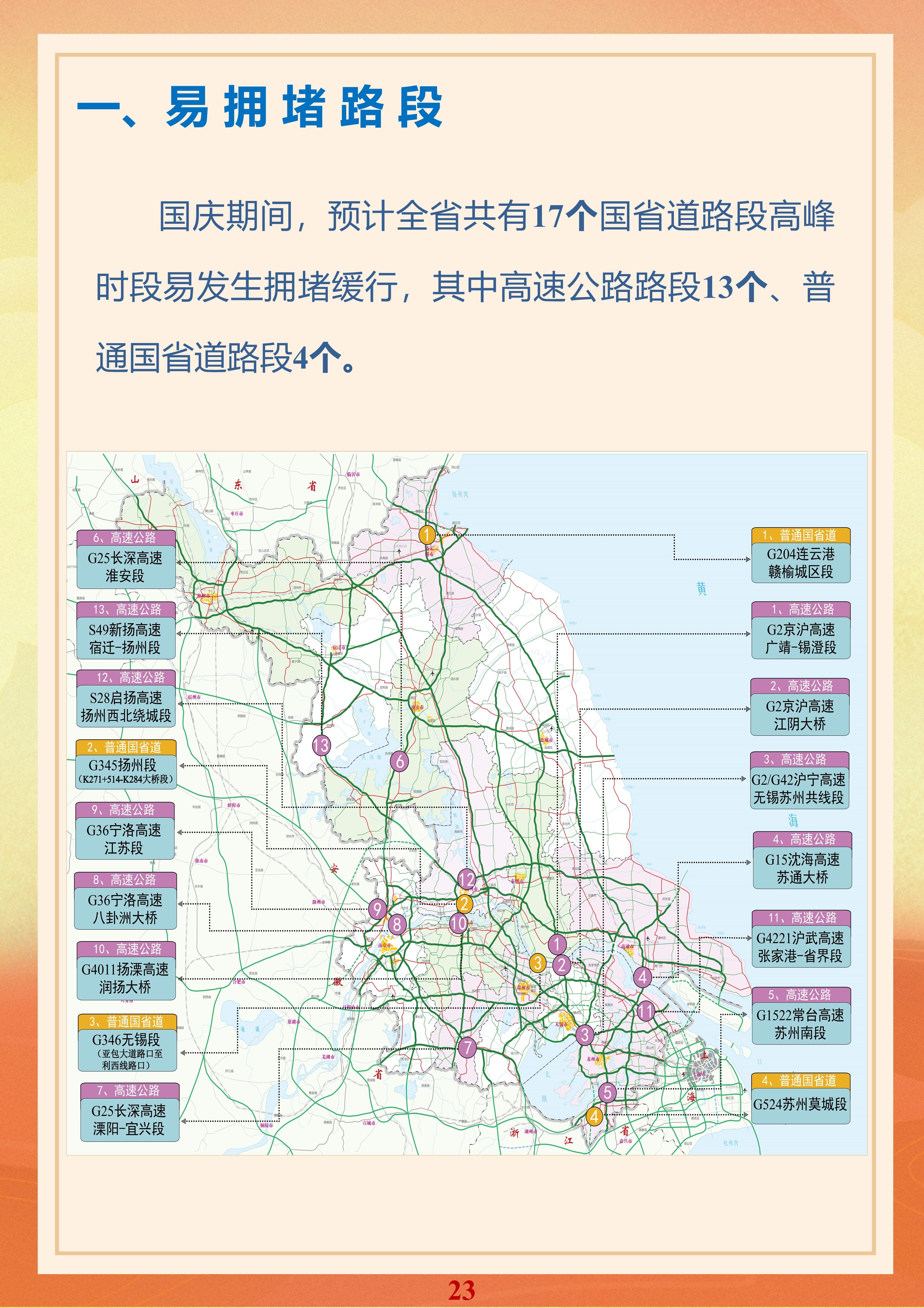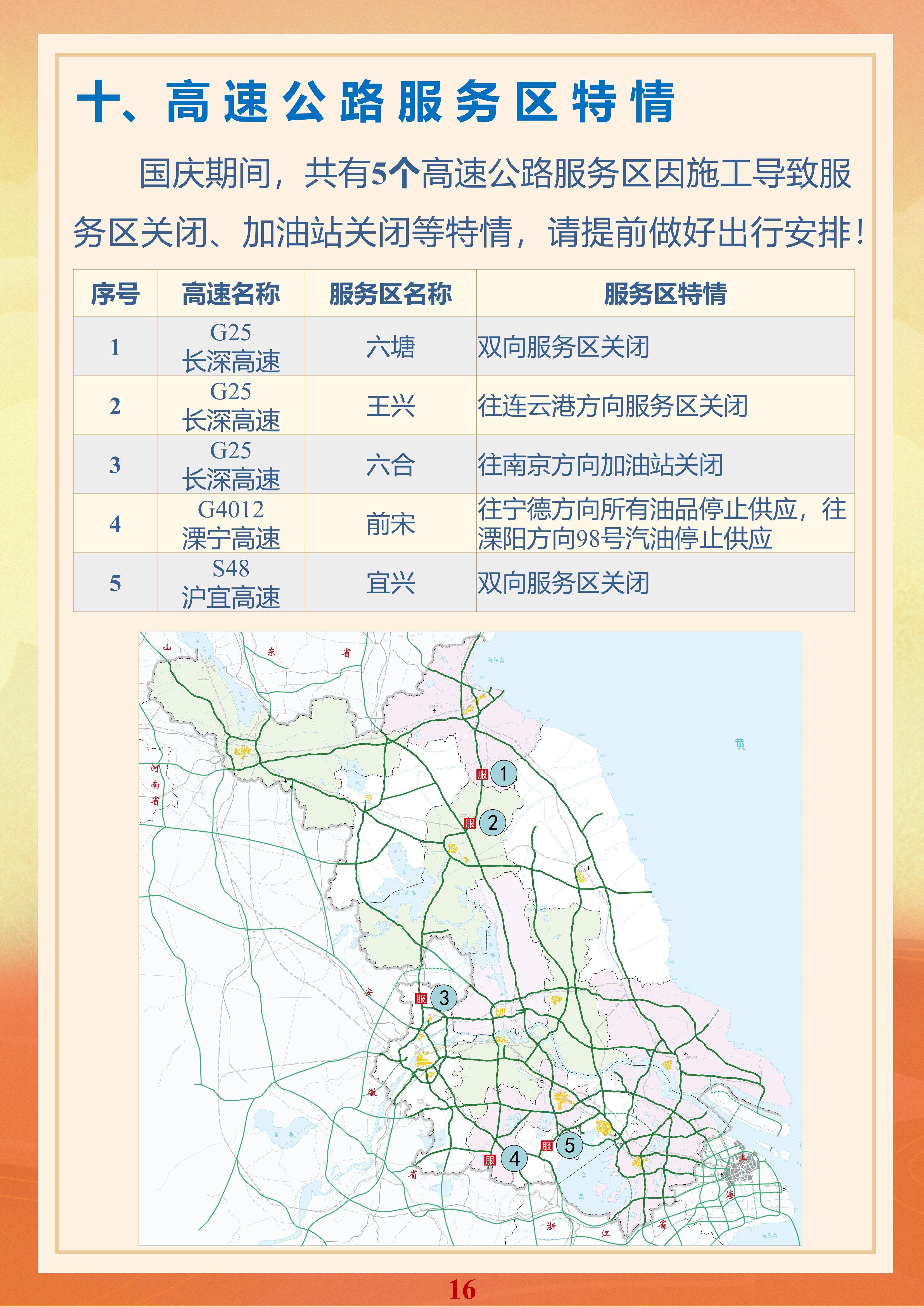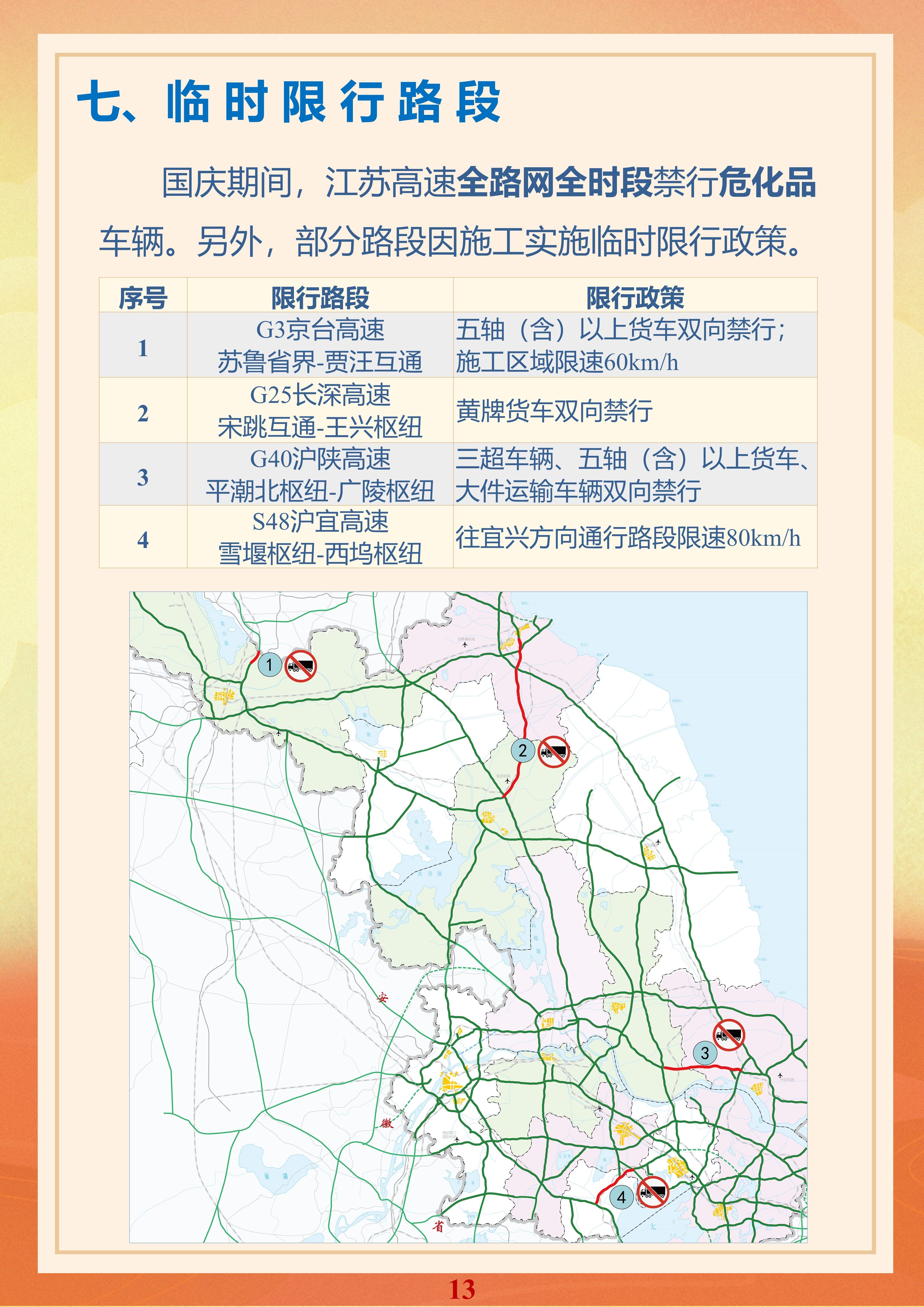 温馨提示:国庆期间,省内有G25长深高速、G40沪陕高速等10个高速公路路段施工,其中苏北地区3个、苏中地区4个、苏南地区3个,请过往车辆驾驶人员谨慎通行或提前绕行。