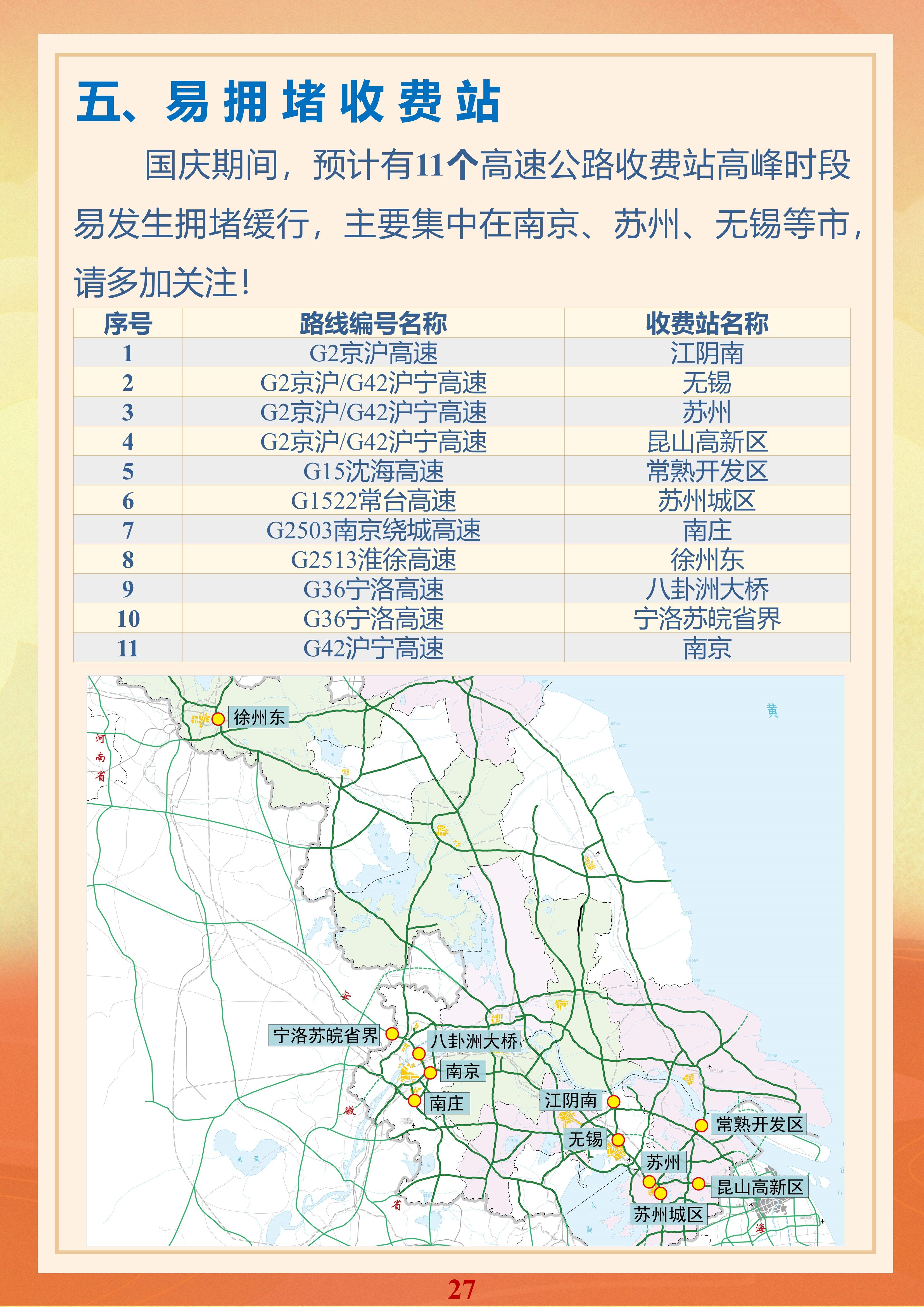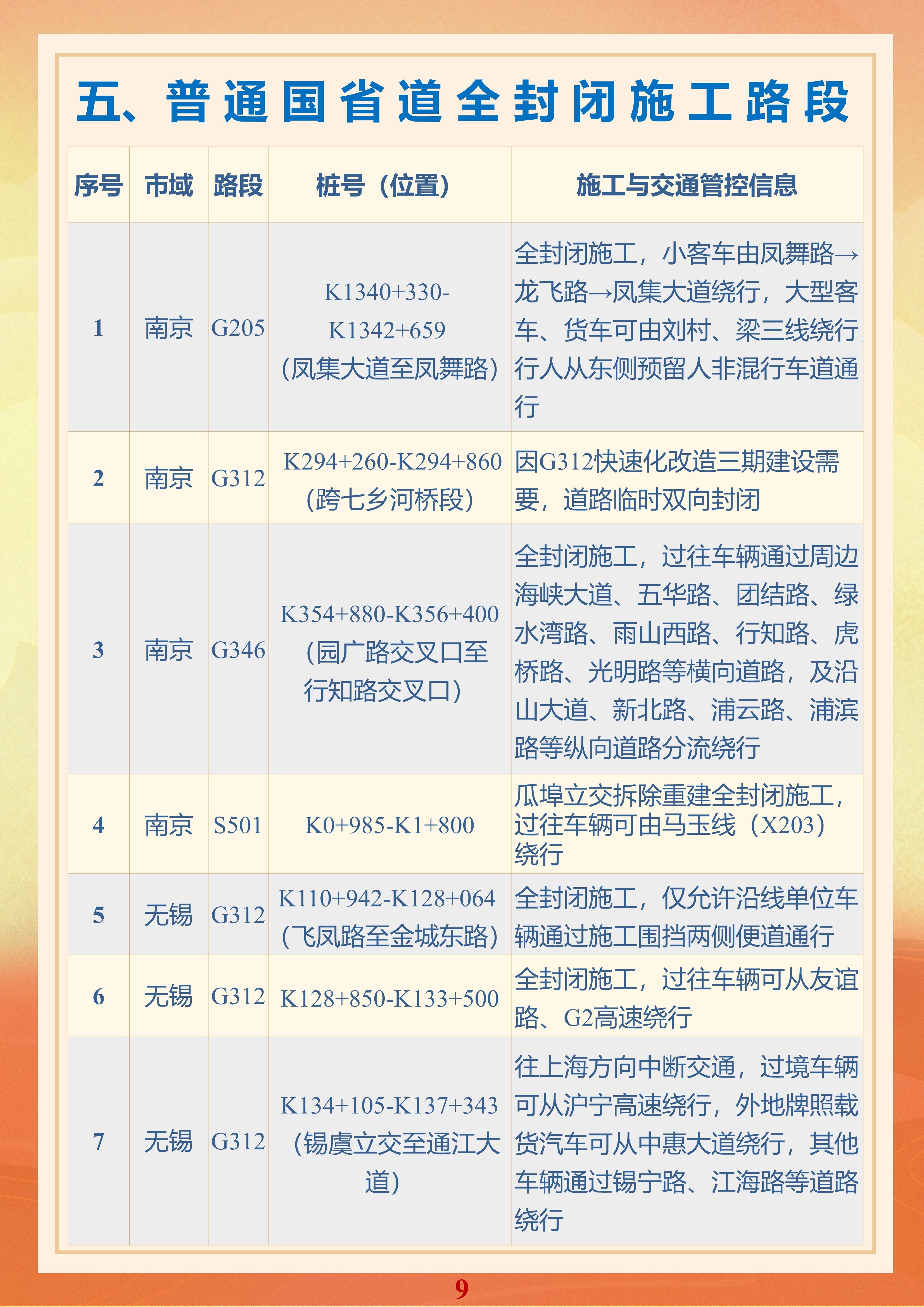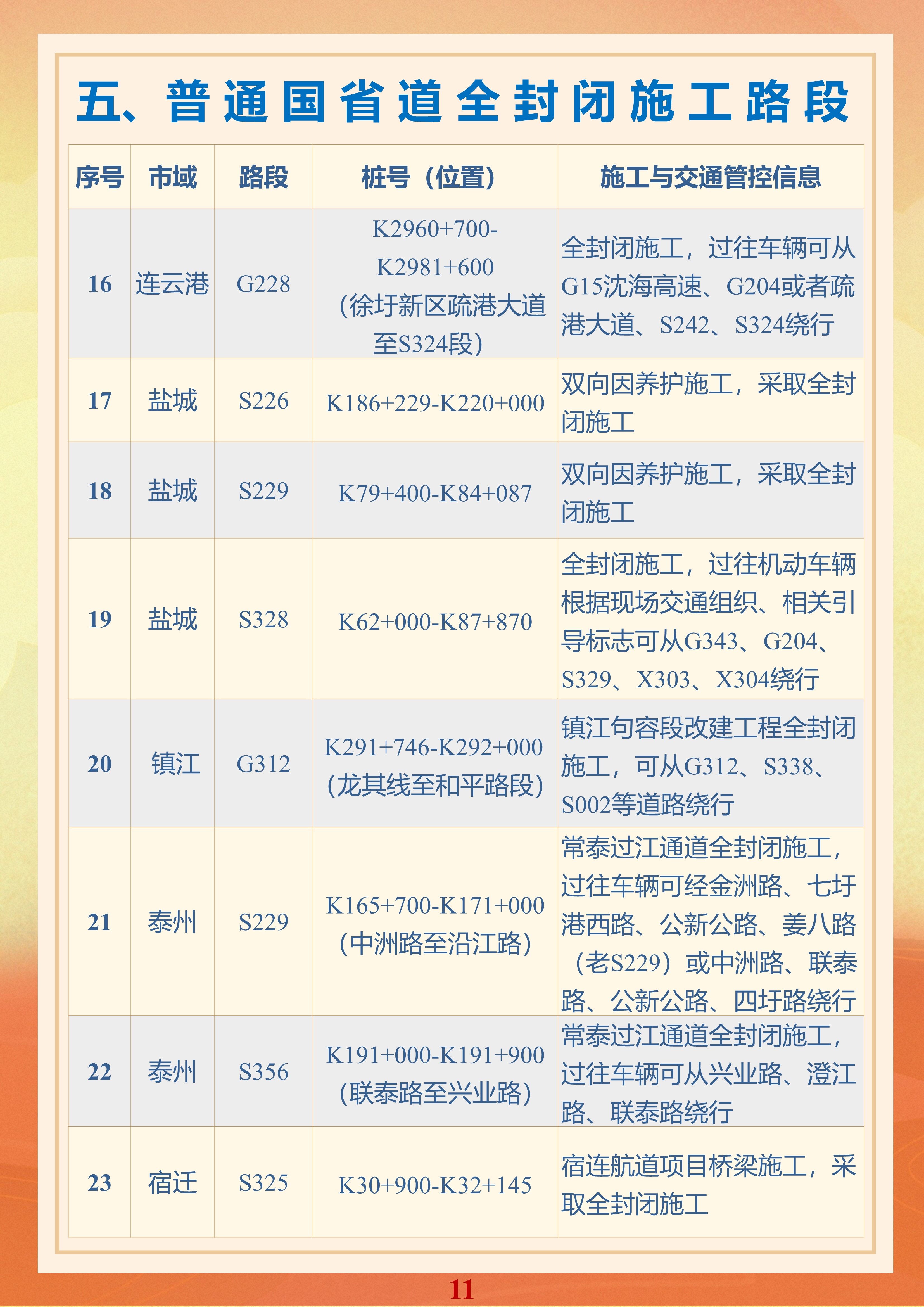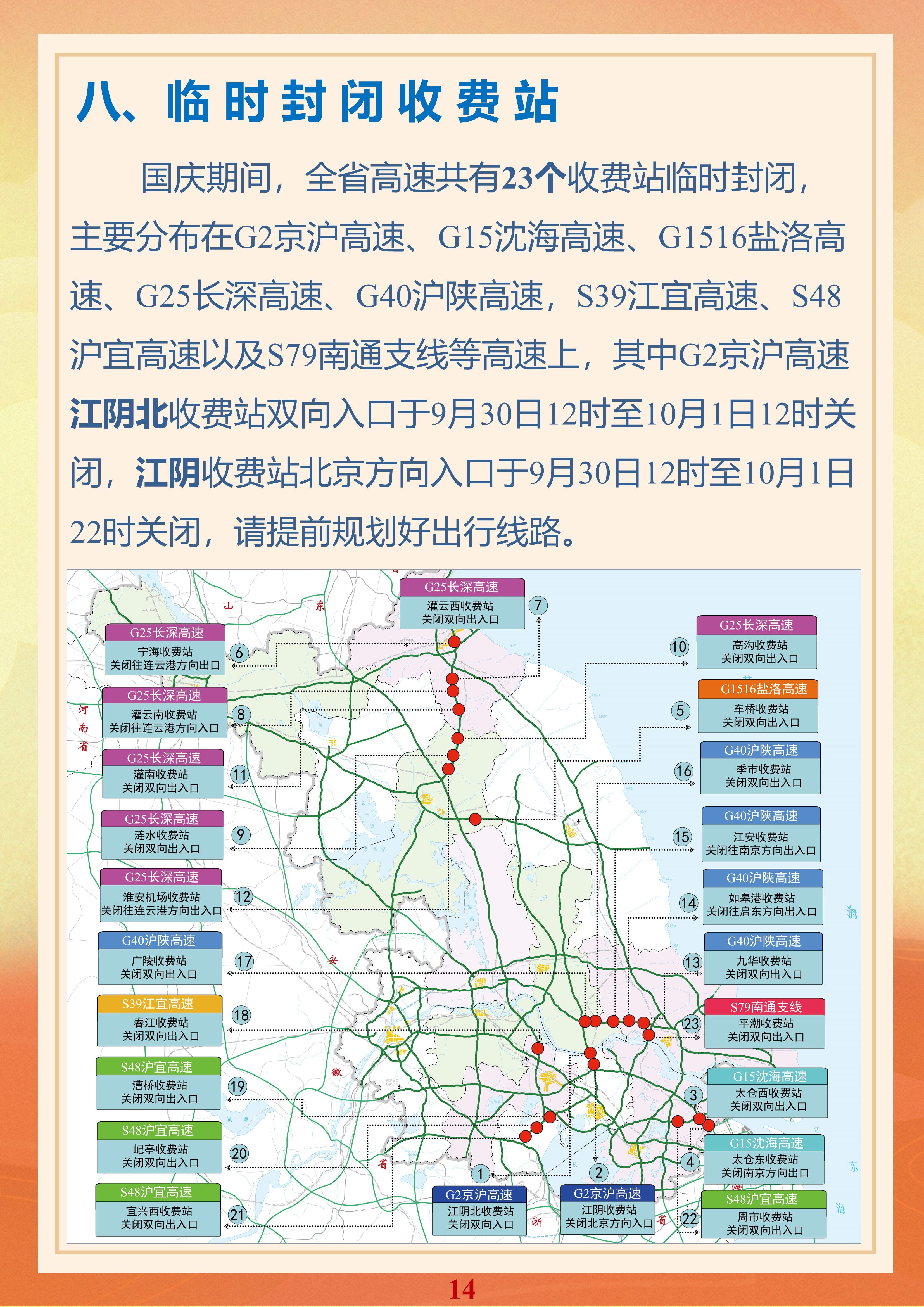 温馨提示:国庆期间,省内有G25长深高速、G40沪陕高速等10个高速公路路段施工,其中苏北地区3个、苏中地区4个、苏南地区3个,请过往车辆驾驶人员谨慎通行或提前绕行。