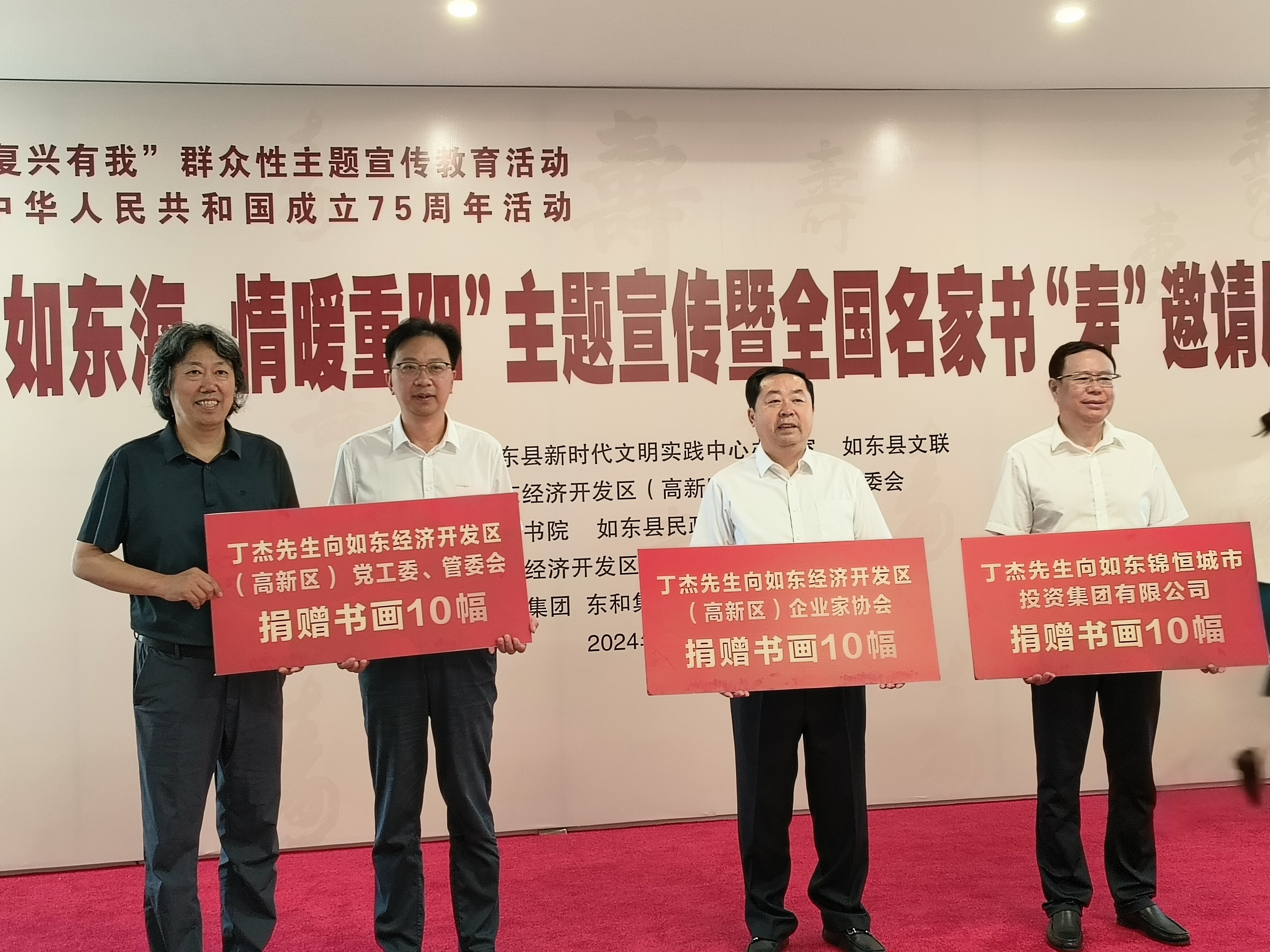 “三角洲头接海江,如东五彩绘重阳;长轴一卷收奇景,案上桑梓带墨香。” 中国艺术研究院原院长、非遗中心原主任、著名书法家连辑即兴赋诗一首,赞扬丁杰艺术回赠家乡的情怀。丁杰先生作为如东籍知名艺术家,有着浓厚的家乡情结,欣然受聘如东经济开发区(高新区)企业家文化俱乐部顾问,倾情创建如意书院,用心打造推动企业发展、惠及家乡人民的精神家园。“我们把这个活动放在重阳节前夕开展,旨在进一步推介‘千年扶海 、寿乡如东’的长寿文化,让优秀传统文化成为我县营商环境的‘金字招牌’,通过文化搭台、经济唱戏,不断提升企业文化软实力,赋能高质量发展硬实力,向着‘百年名企’阔步前进。”如东县委常委、如东经济开发区(高新区)党工委书记蔡东说。