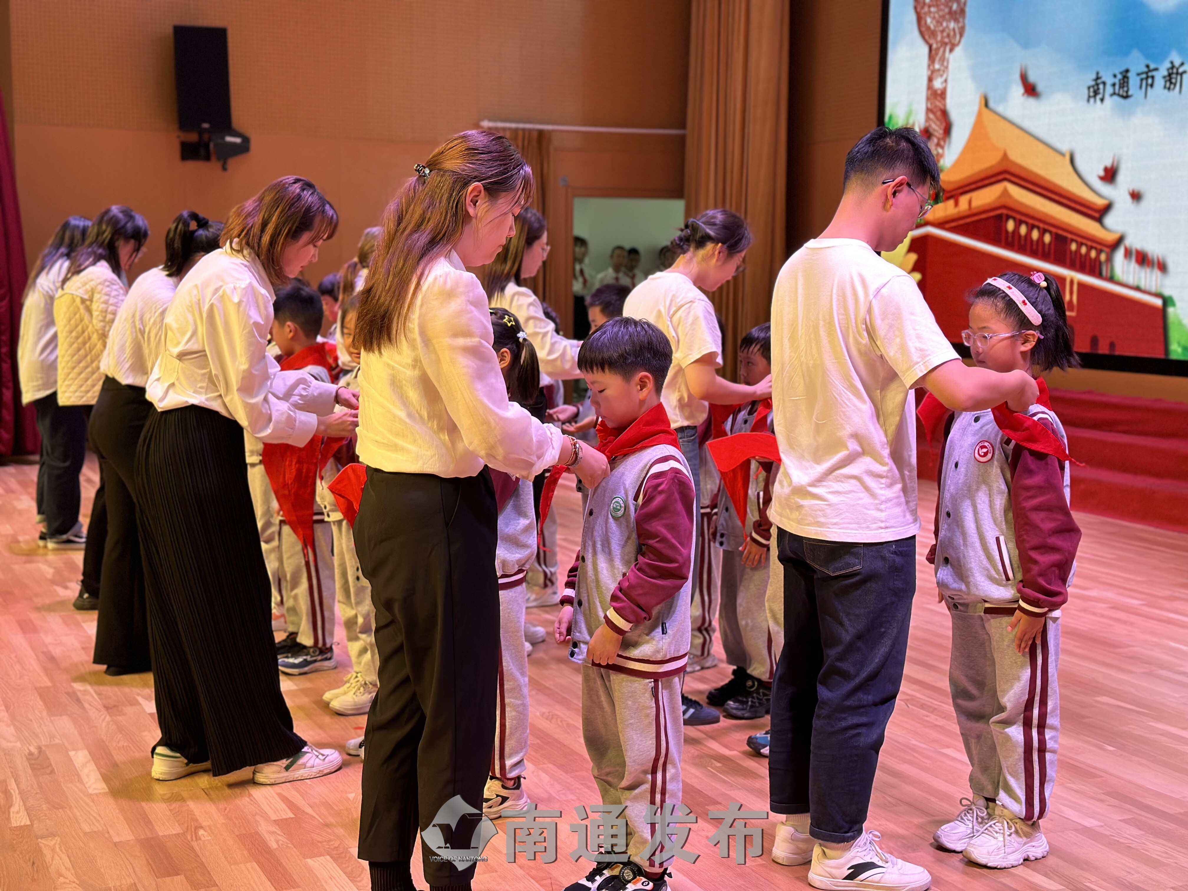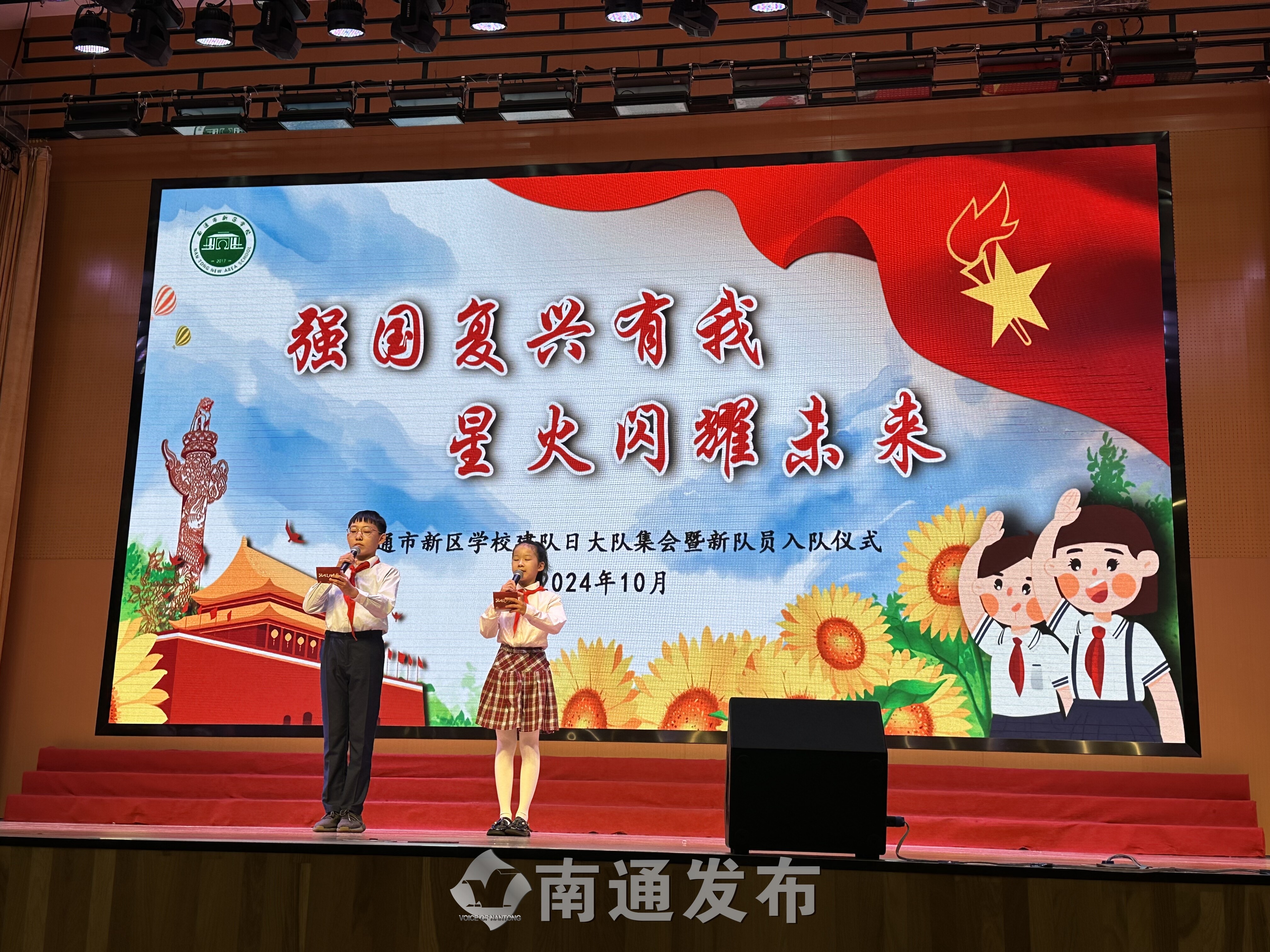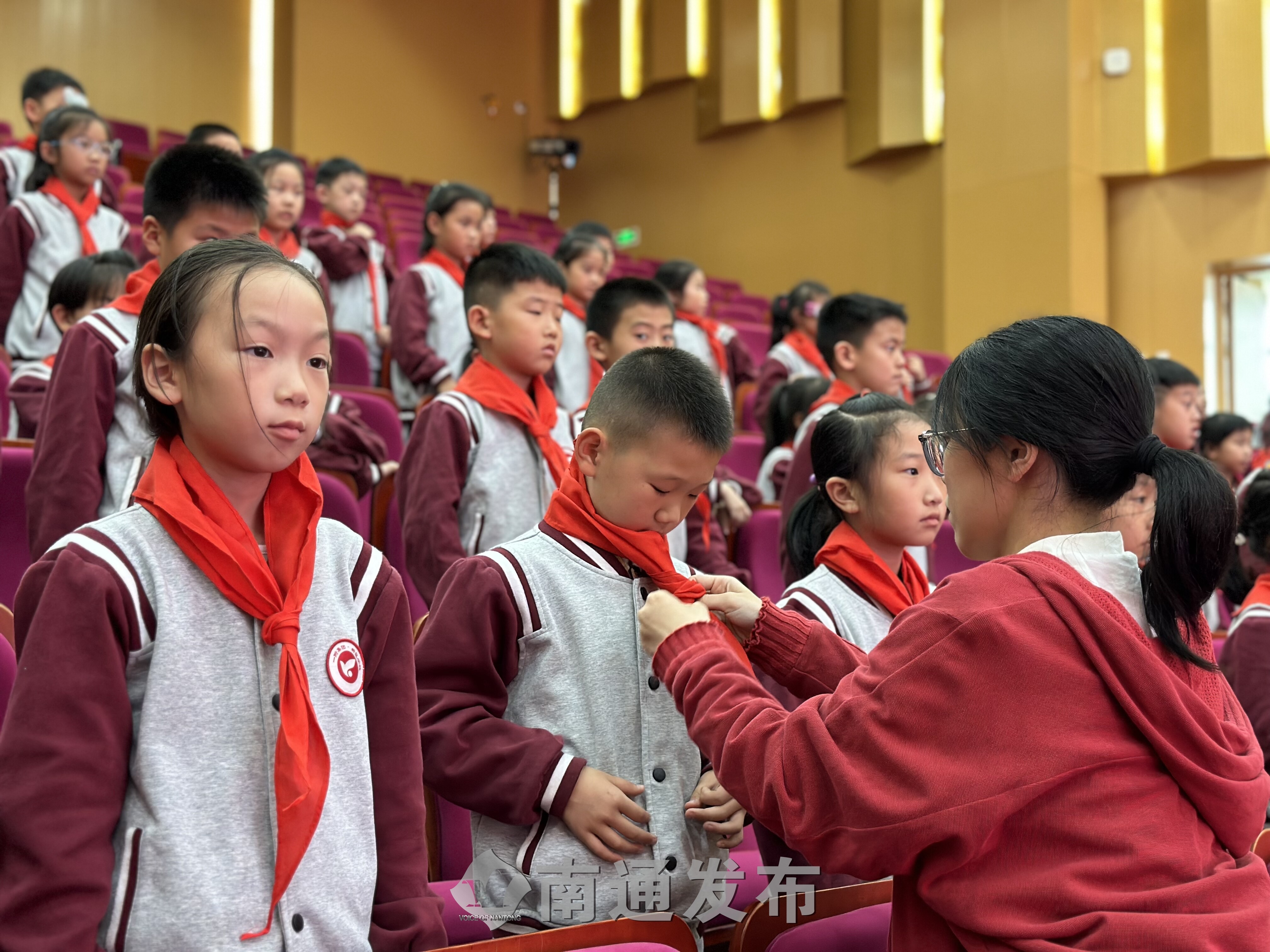 当天下午,新区学校举行少先队新队员入队仪式,三名校外党员红色宣讲员走上讲台,为该校二年级352名新队员讲述了江海英烈和战斗功臣的动人故事,见证这一庄重而光荣的时刻。同时,活动面向全校师生直播,共上一堂特殊而难忘的思政课。