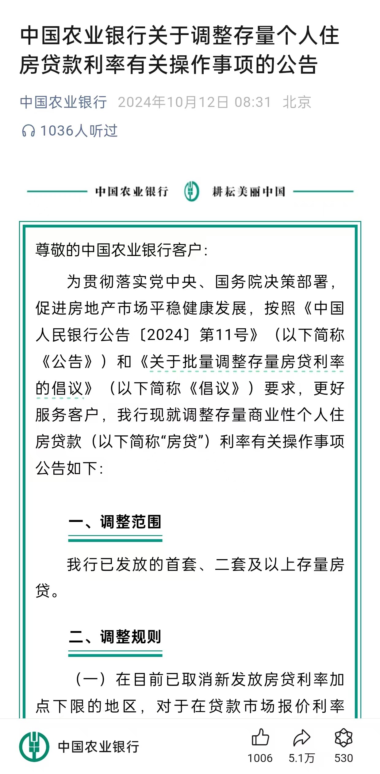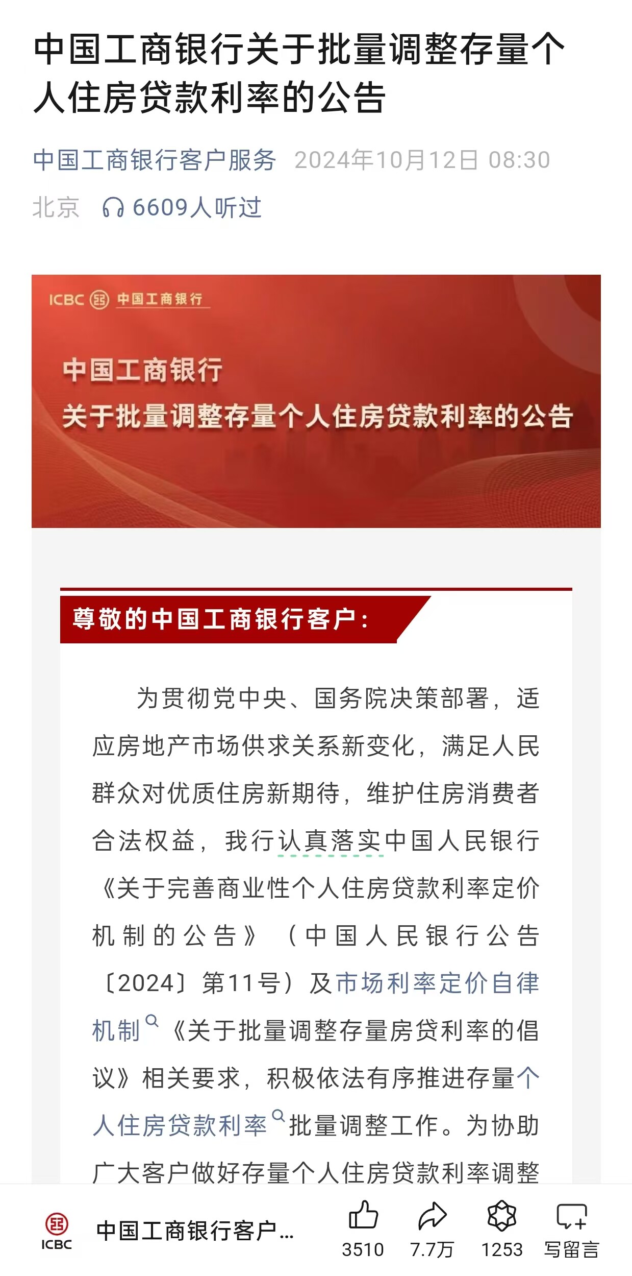 值得关注的是,部分银行还发出提示:个人商业用房(含商住两用房)贷款、公积金个人住房贷款;利率水平在LPR基础上加点幅度不高于-30BP的贷款;2024年10月25日仍采用基准利率定价的贷款、固定利率贷款,不纳入本次批量调整范围内。