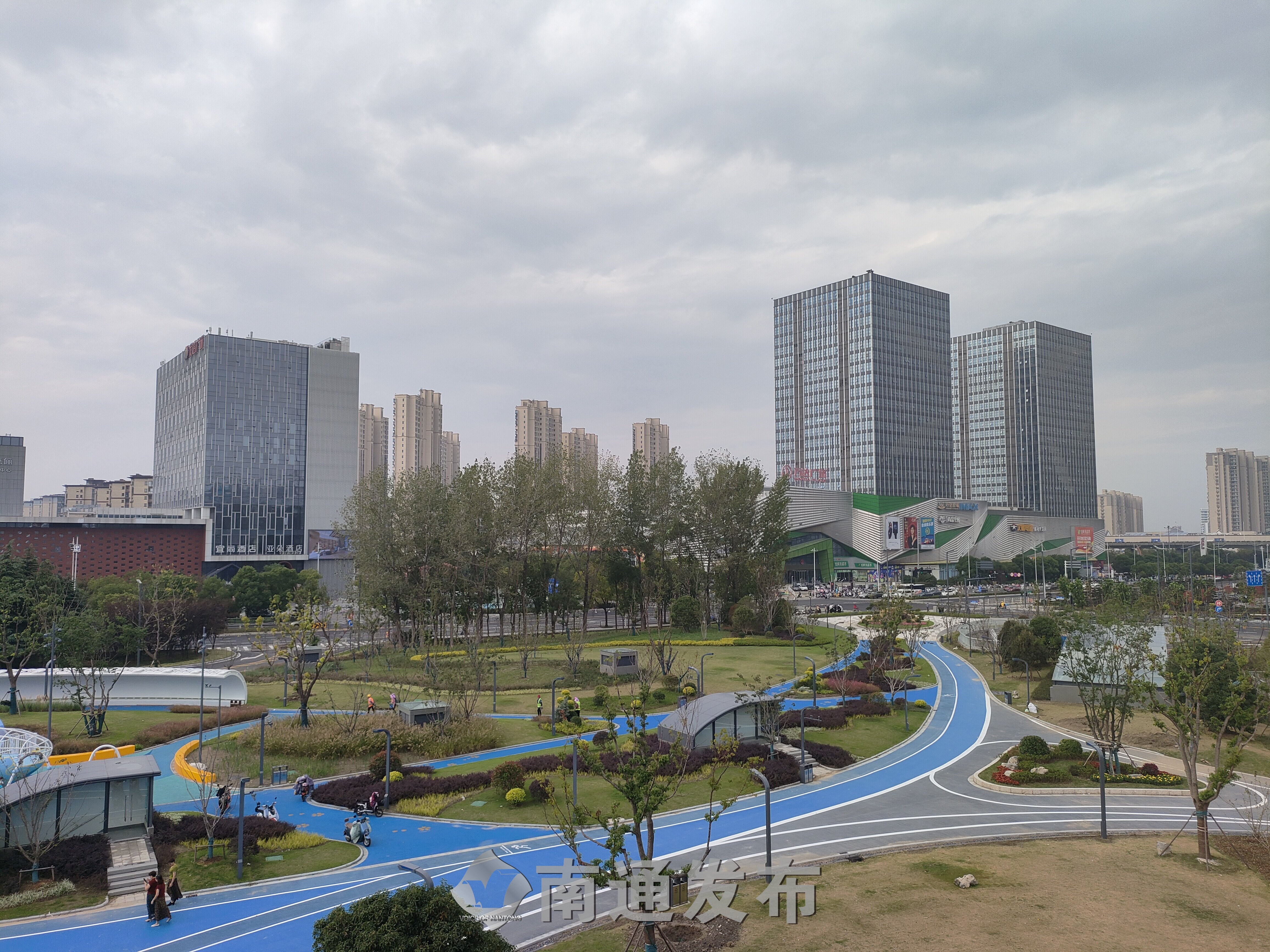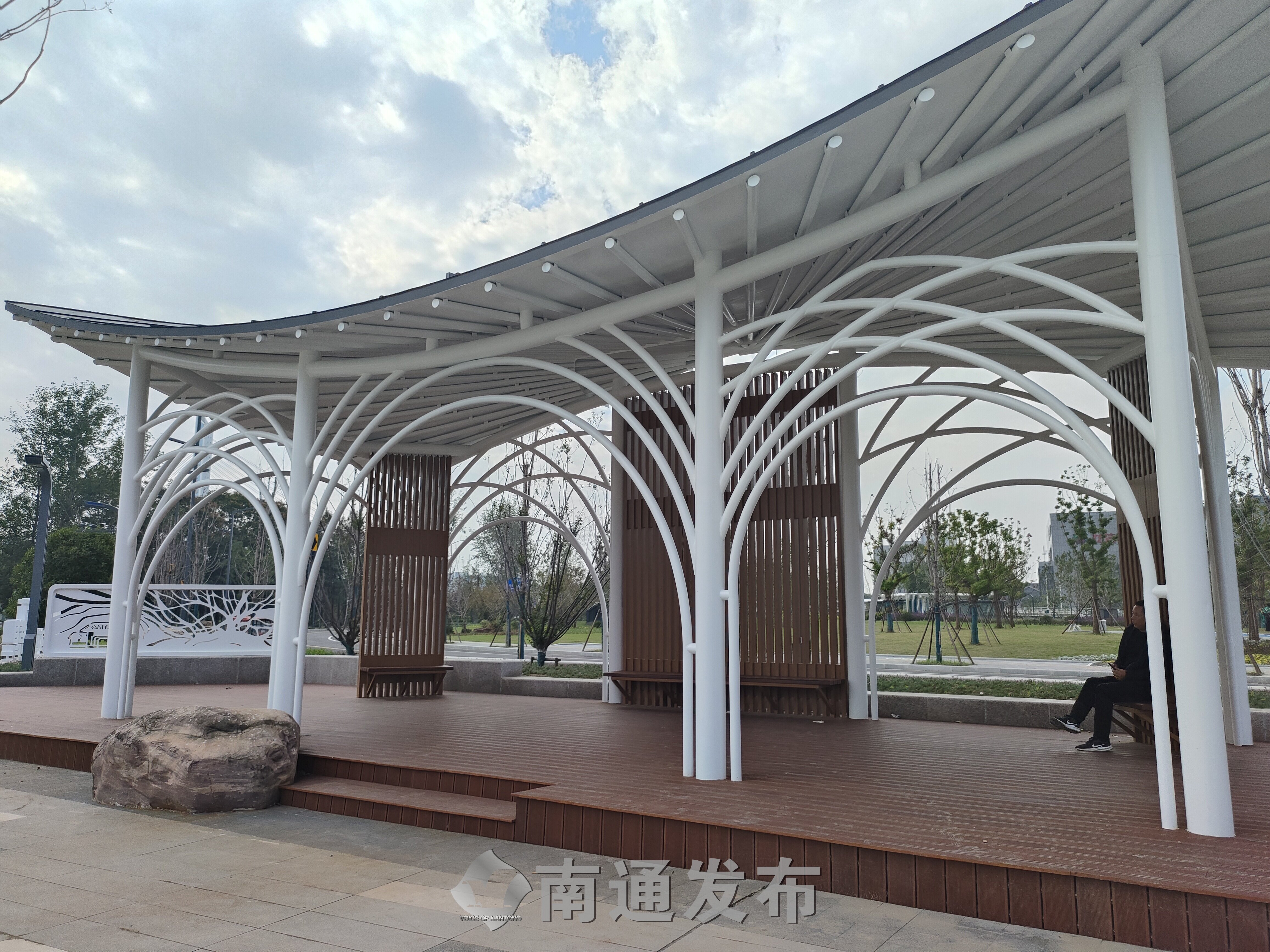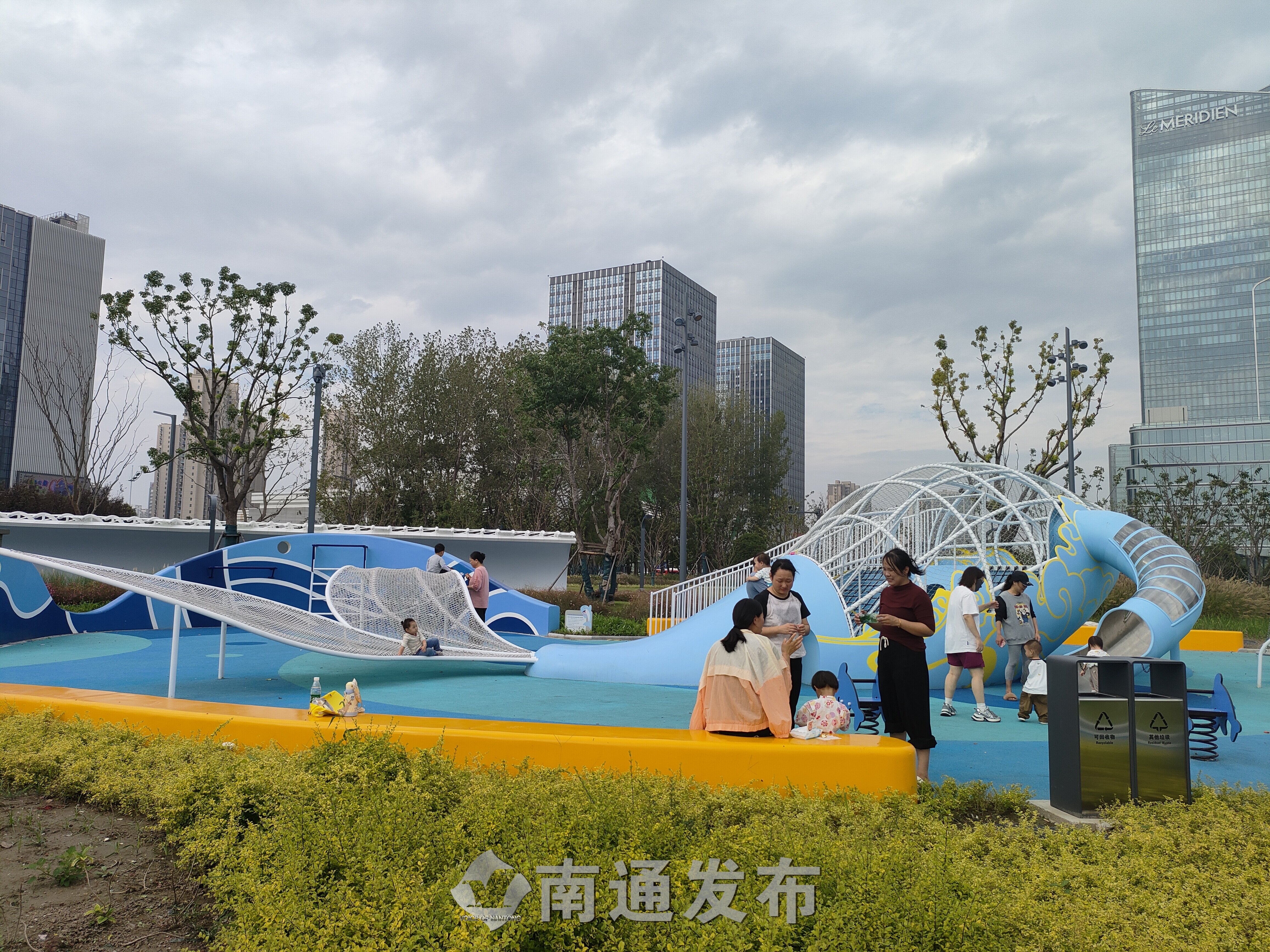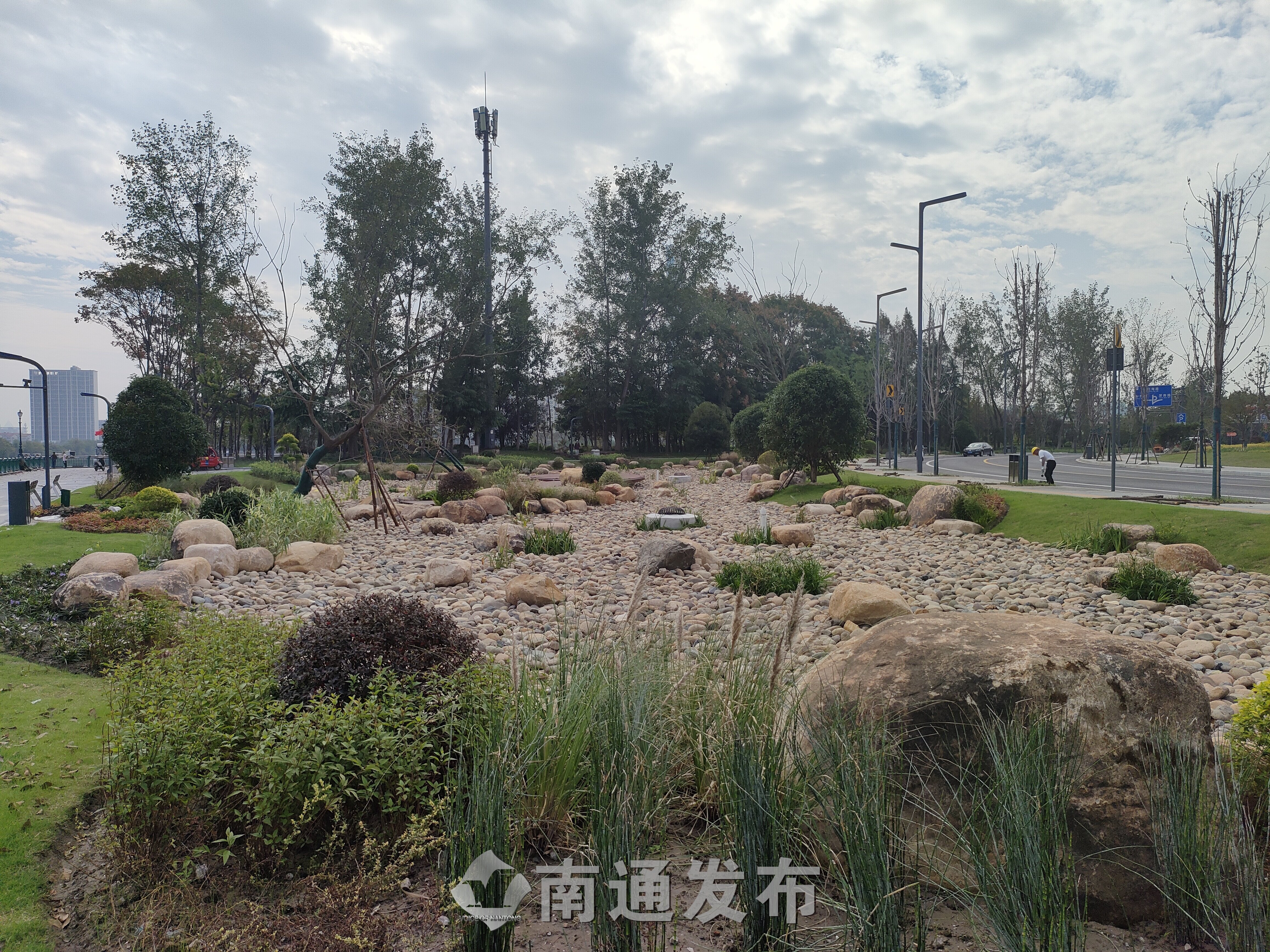 “‘梦幻童趣’是儿童活动区,设立大鱼滑梯、浪花秋千、儿童攀岩景墙等设施;‘玫樱漫语’为活力中心北侧婚礼草坪,结合樱花、雕塑、湖面等景观要素,营造浪漫温馨的氛围;‘绿芯聚场’为活力中心南侧大草坪,主要为游客提供露营、野餐、放风筝游憩功能;‘雨水花园’面积约2000平方米,不仅以河滩卵石为基底,以乌桕、朴树、中山杉为骨架树,中层点植观赏草及耐水湿地被,搭配大小灌木球组合及大型景石,体现植物的多样性及景观性,还设计了一条蜿蜒的景观栈道,增强游客对生态之美的亲近性和体验性。”崇川区市政和绿化管理局局长曹建军介绍,公园地下空间也被充分利用了起来,建设了1.9万平方米的停车场,设置了606个机动车车位和182根充电桩,为市民游客前来游玩提供停车便利。
