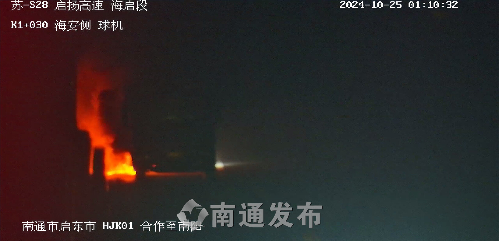 当日凌晨1时许,南通交警高速八大队接到司机报警称,在启扬高速海安方向启东段1公里处,自己驾驶的重型自卸车轮胎起火了,需要救援。民警迅速通过视频监控锁定求助人具体方位,只见在启扬高速海安方向1公里的应急车道上,一辆重型自卸车右侧冒着熊熊烈火,情况十分危险。交警、消防、高速清障部门立即赶赴事发位置,对现场进行临时交通管控,利用锥桶封锁车辆右后方,形成了一条警戒导流线,摆放警告标志,提醒过往车辆注意安全,并提示驾驶人到护栏外等待救援。