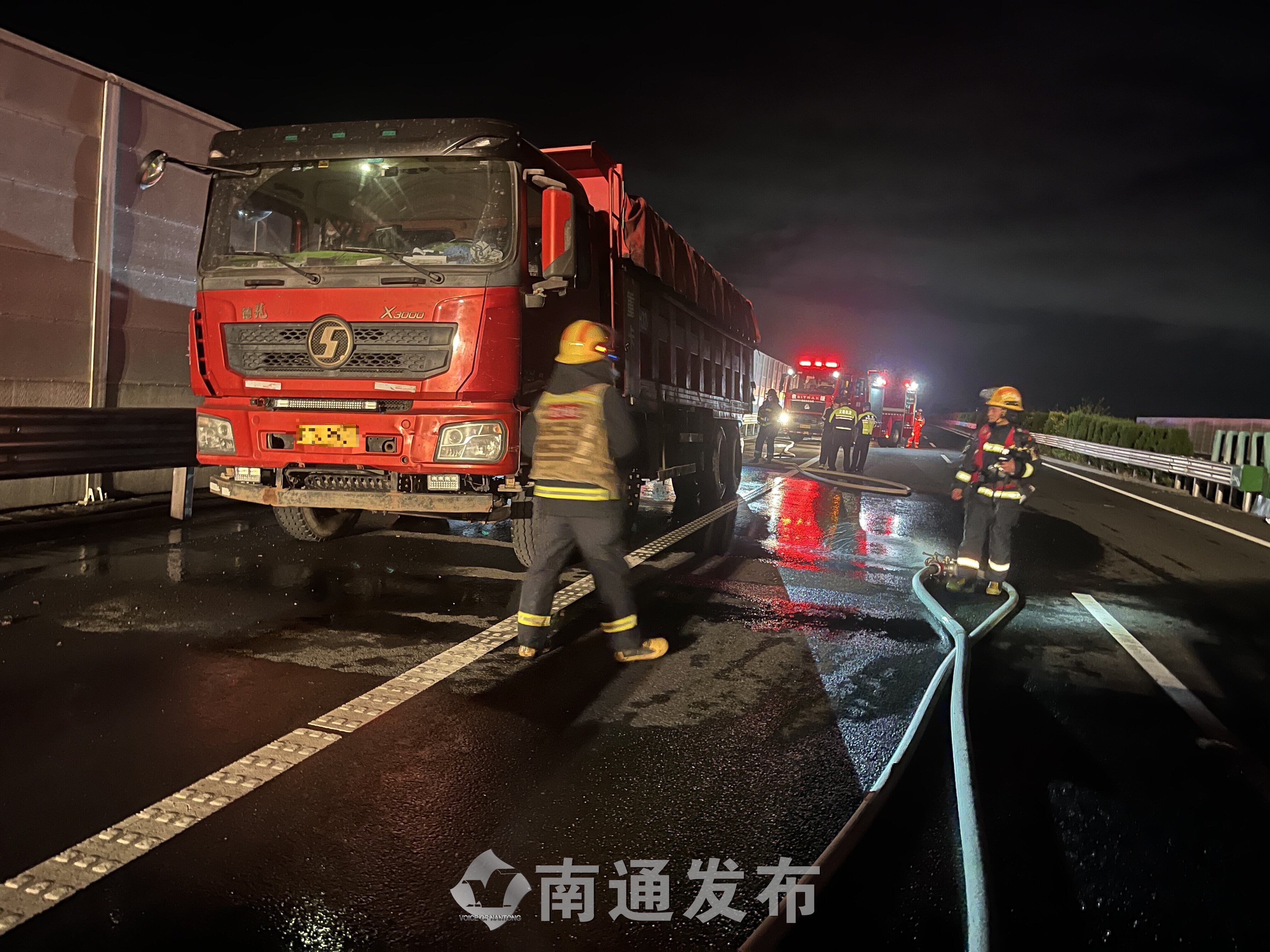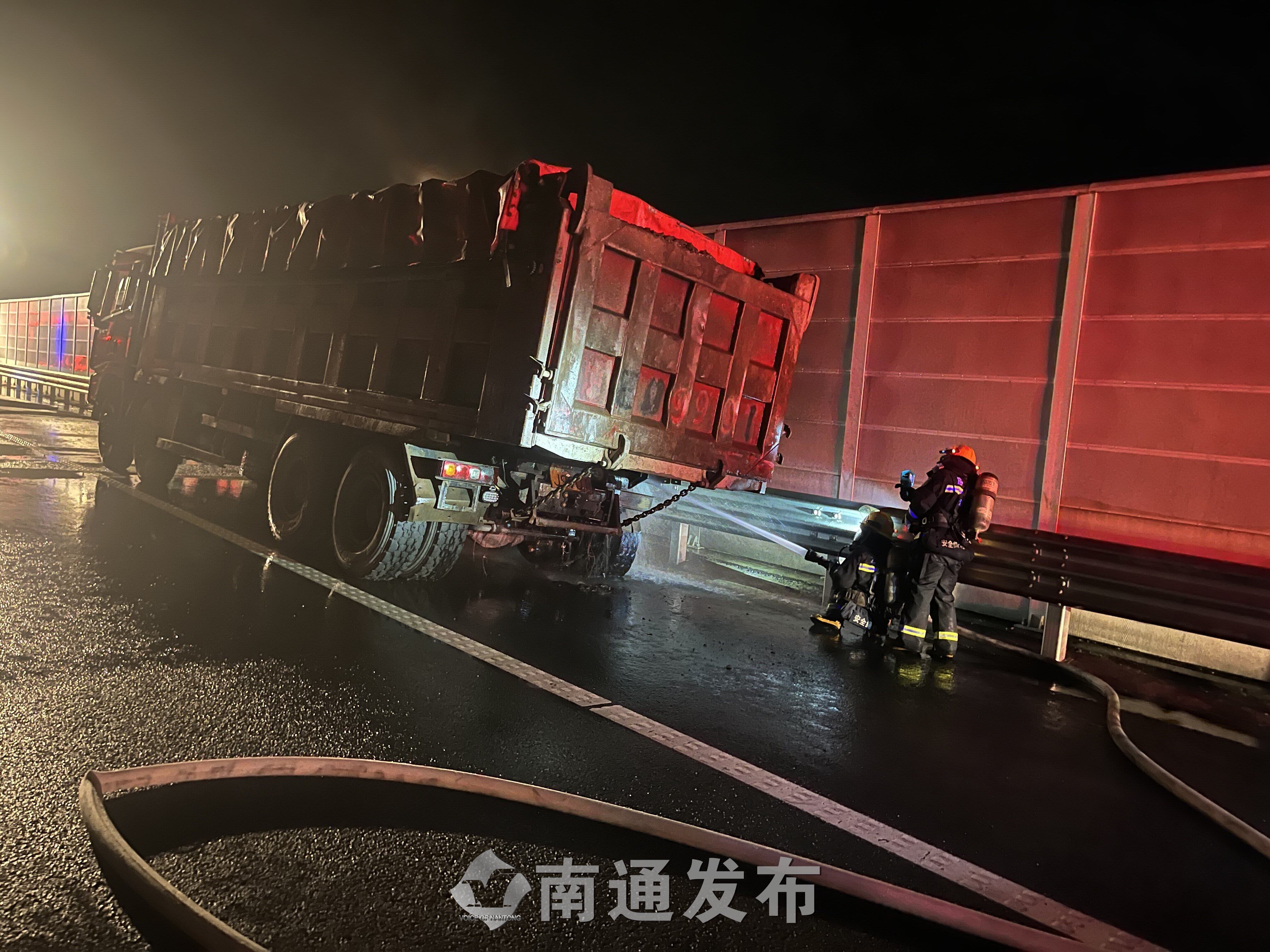 据报警人介绍,他凌晨从上海上高速,准备运一车渣土至南通通州湾,刚过匝道转向启扬高速没多久,就听到车右侧有声响,遂停车检查,发现右侧轮胎爆胎起火,于是立即使用车载灭火器进行灭火,但没能扑灭,火势迅速蹿上了车厢,见火势控制不了便立即报警求助。