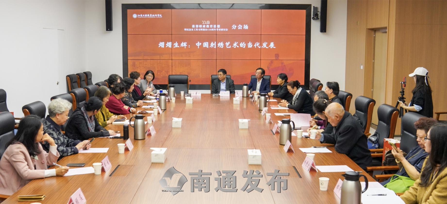 研讨会由江苏工院艺术设计学院教授、苏绣(仿真绣)传承人张蕾在张謇企业家学院会议室主持。江苏工程职业技术学院党委书记秦志林,江苏省工艺美术协会常务副会长兼秘书长宋建根,行业代表吴元新、陈水琴、吕存、牟志红等大师,清华美院杨阳、吕元,中国美术馆周佳等专家出席并发言,内容涵盖中国刺绣艺术当代发展、美育教育、社会对刺绣艺术的精神需求、传承与创新做法、沈寿贡献以及刺绣艺术发展难题等。