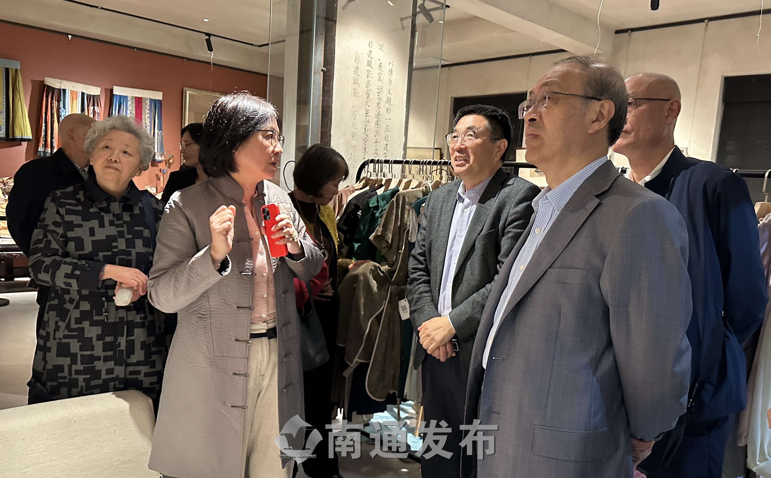 会后,与会大师专家调研了大生众创园仿真绣一庄非遗空间。江苏省社科联党组书记、常务副主席张新科,江苏省张謇研究会会长管向群等参与讨论南通仿真绣作品。南通女工传习所是张謇职教思想的生动实践,其留存作品见证时代、传承刺绣文化。张蕾教授介绍了江苏工院师生设计创作的仿真绣非遗创新系列作品,如获全国或省级工美大奖的《水韵江苏》《品茶图》《索句图》刺绣作品和《繁花系列紫藤花开》文创产品等。这些作品融合刺绣艺术与现代多领域,拓展刺绣表现力、推动风格多元化,为刺绣传承开辟市场实践路径。专家一致认为,这些作品是践行张謇职教理念“学必期于用,用必适于地”的典范,展现了东方美学的魅力。