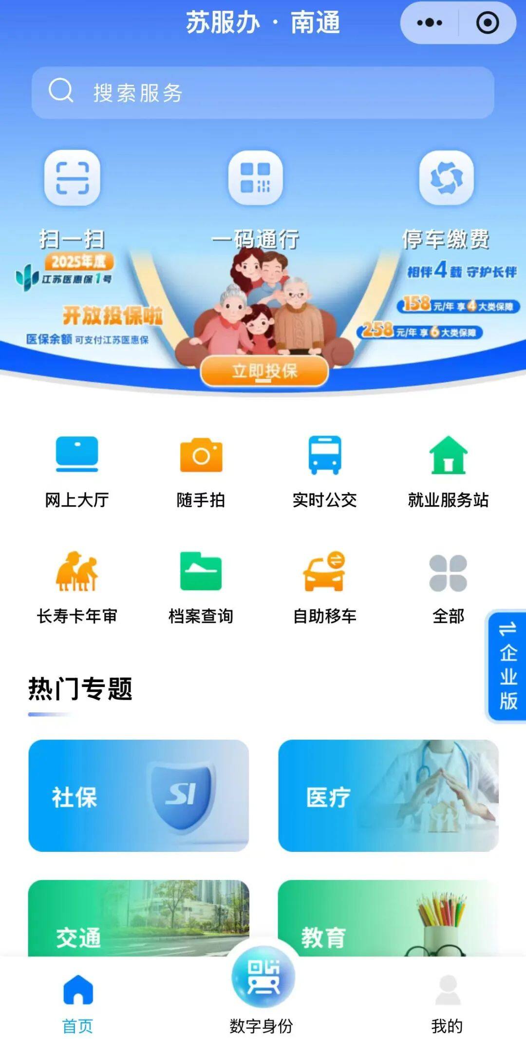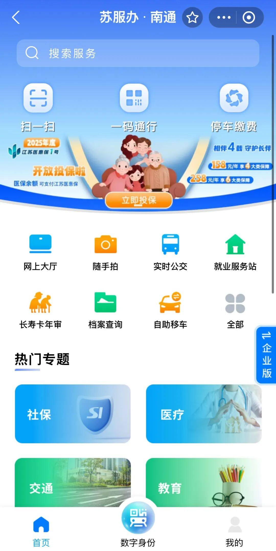 今年年初,“南通百通”正式更名为“苏服办·南通”。此次上线的小程序,关注高频热门应用服务,整合21个部门的97个程序,覆盖就业、医疗、教育、出行和政务服务等多个领域,极大扩展了服务范围。小程序分个人版、企业版和适老版,提供水电煤缴费、公积金社保查询、交通出行和医疗健康等服务,全面满足市民的日常生活需求;为企业提供惠企政策查询和企业信息管理等服务,真正实现“让数据多跑路,群众少跑腿”。长辈关怀模式下,除了字号放大,更是突出了老年人常用的出行、健康、养老等服务。