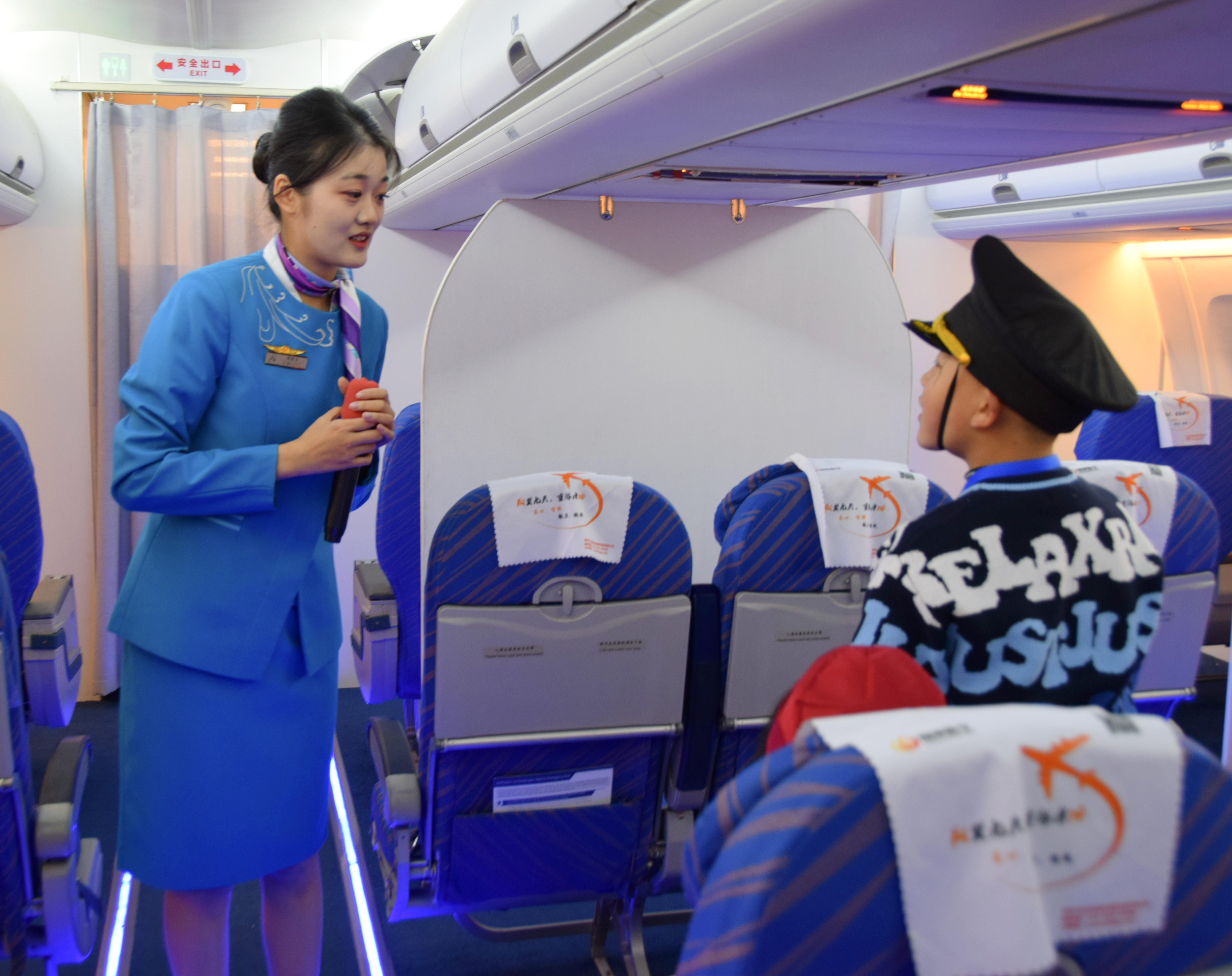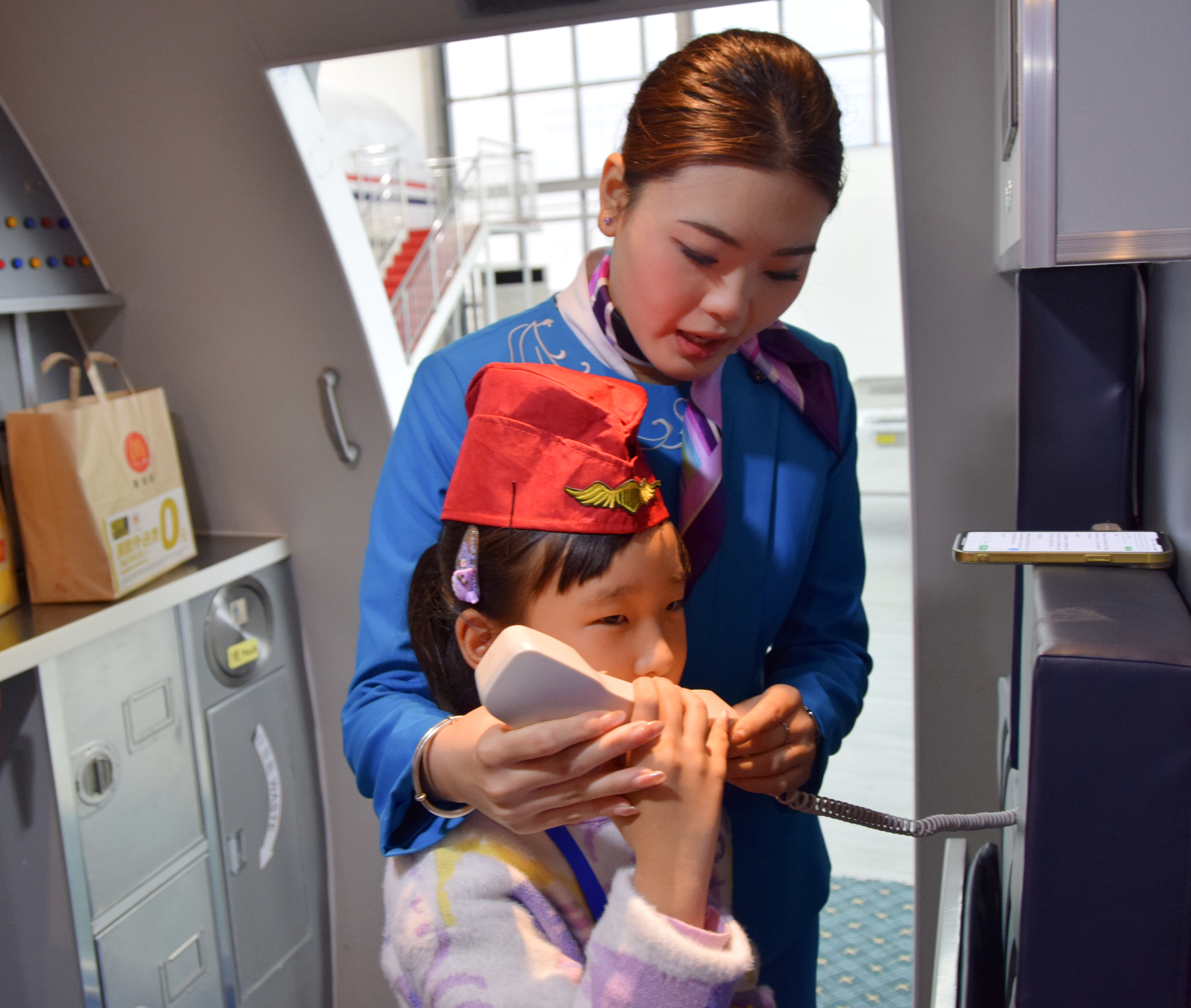 活动中,该校工商管理学院空乘专业师生志愿者为小记者们戴上一顶顶空乘帽,细致介绍了地勤机场实训区的功能和分类,让小记者们对值机柜台、安检门、登机口等机场设施有了更深刻的认识。小记者们在领取了体验中心为他们专门定制的特色“登机牌”后,手持“登机牌”,秩序井然地通过安检,走进模拟机舱,根据“登机牌”上的指示,寻找自己的座位。“我的座位是06A。”“我的座位是08F。”“我找到自己的座位啦!”只见正确找到座位的小记者,高兴地叫出声来,现场气氛热烈。