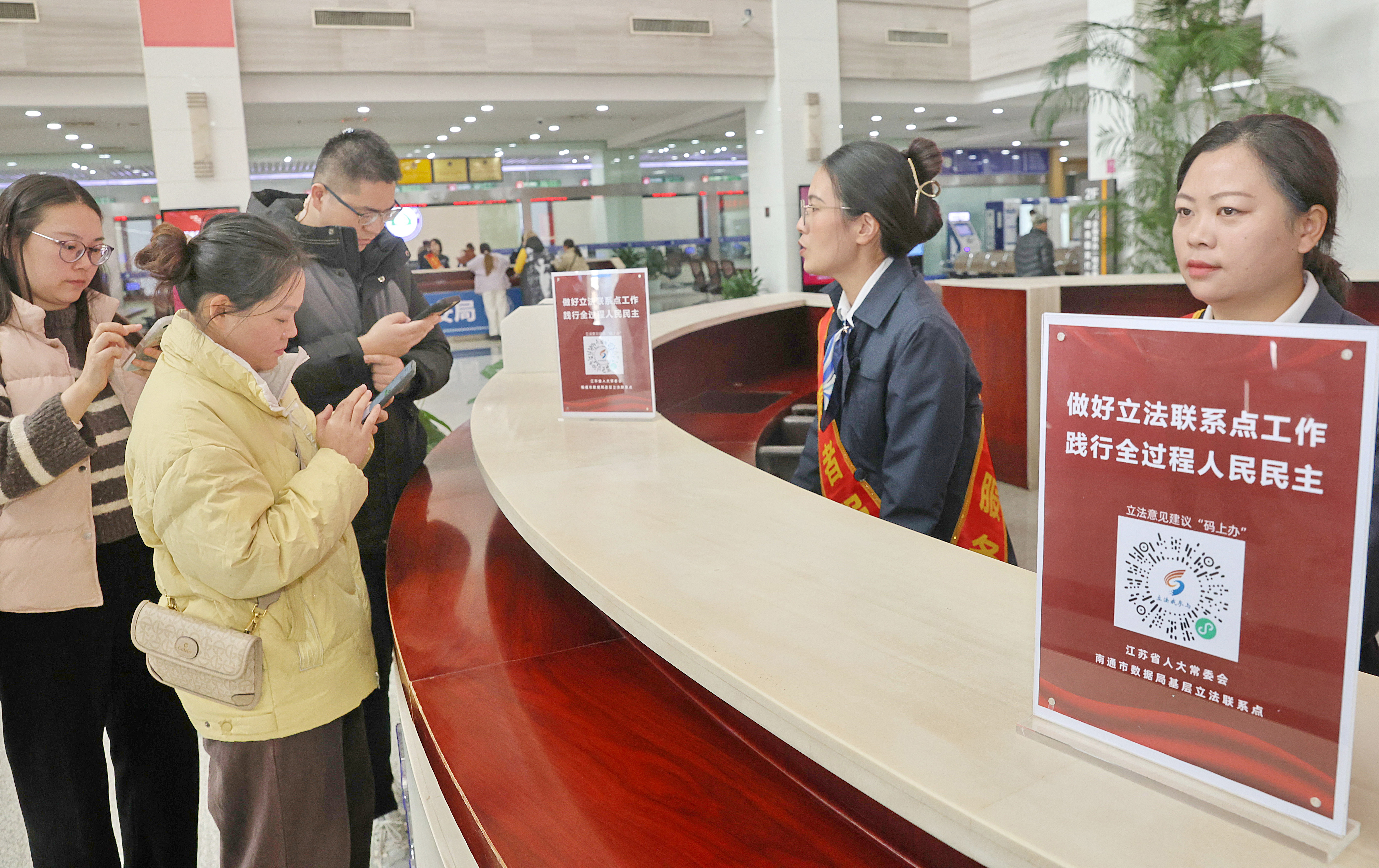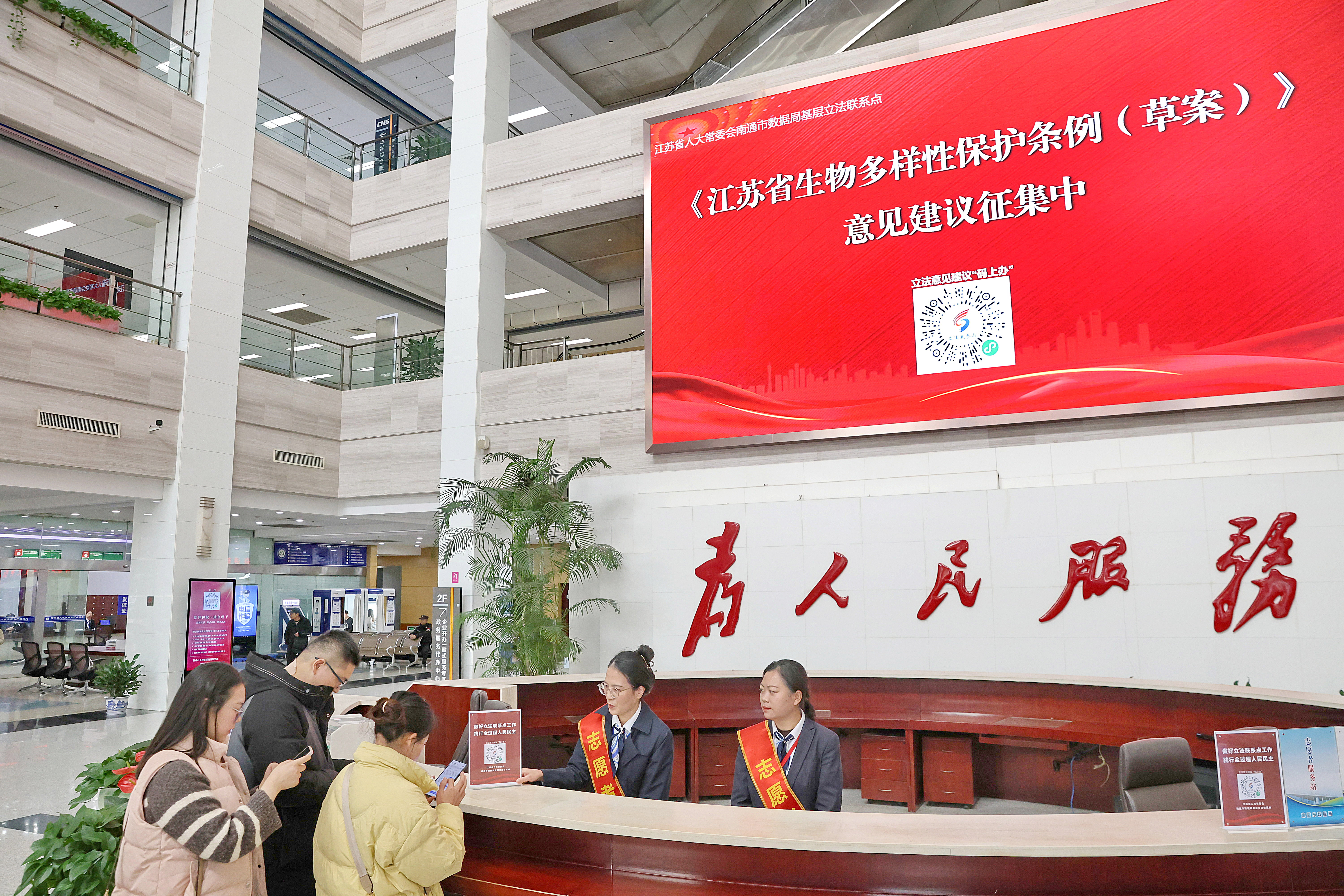 在江苏省南通市政务服务中心一楼大厅巨大的电子显示屏前,办事群众现场可通过扫“立法我参与”二维码,直接对正在征求意见的《江苏省生物多样性保护条例(草案)》提出修改完善建议,实现了立法意见建议“码上办”。