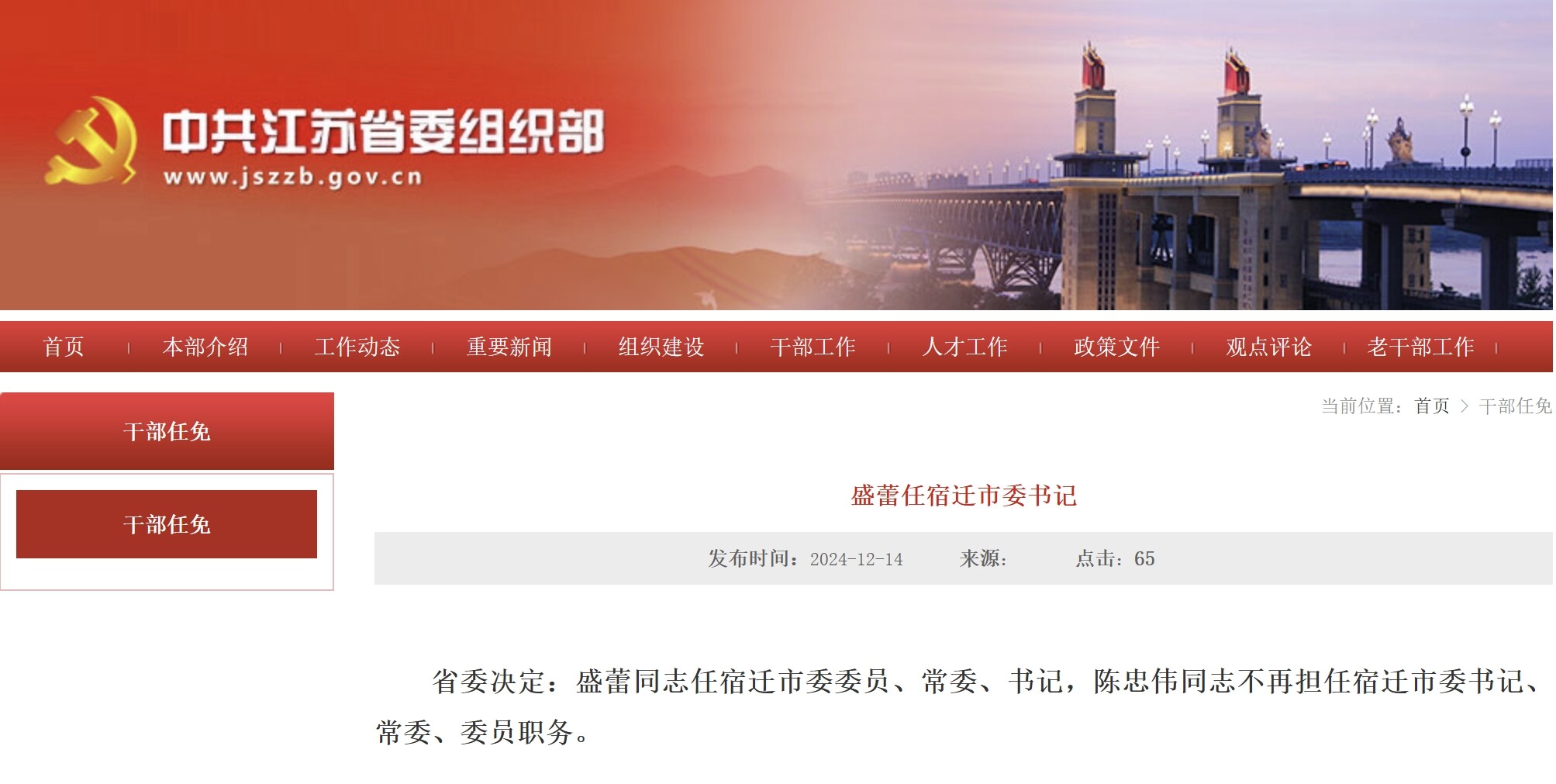 省委决定:盛蕾同志任宿迁市委委员、常委、书记,陈忠伟同志不再担任宿迁市委书记、常委、委员职务。