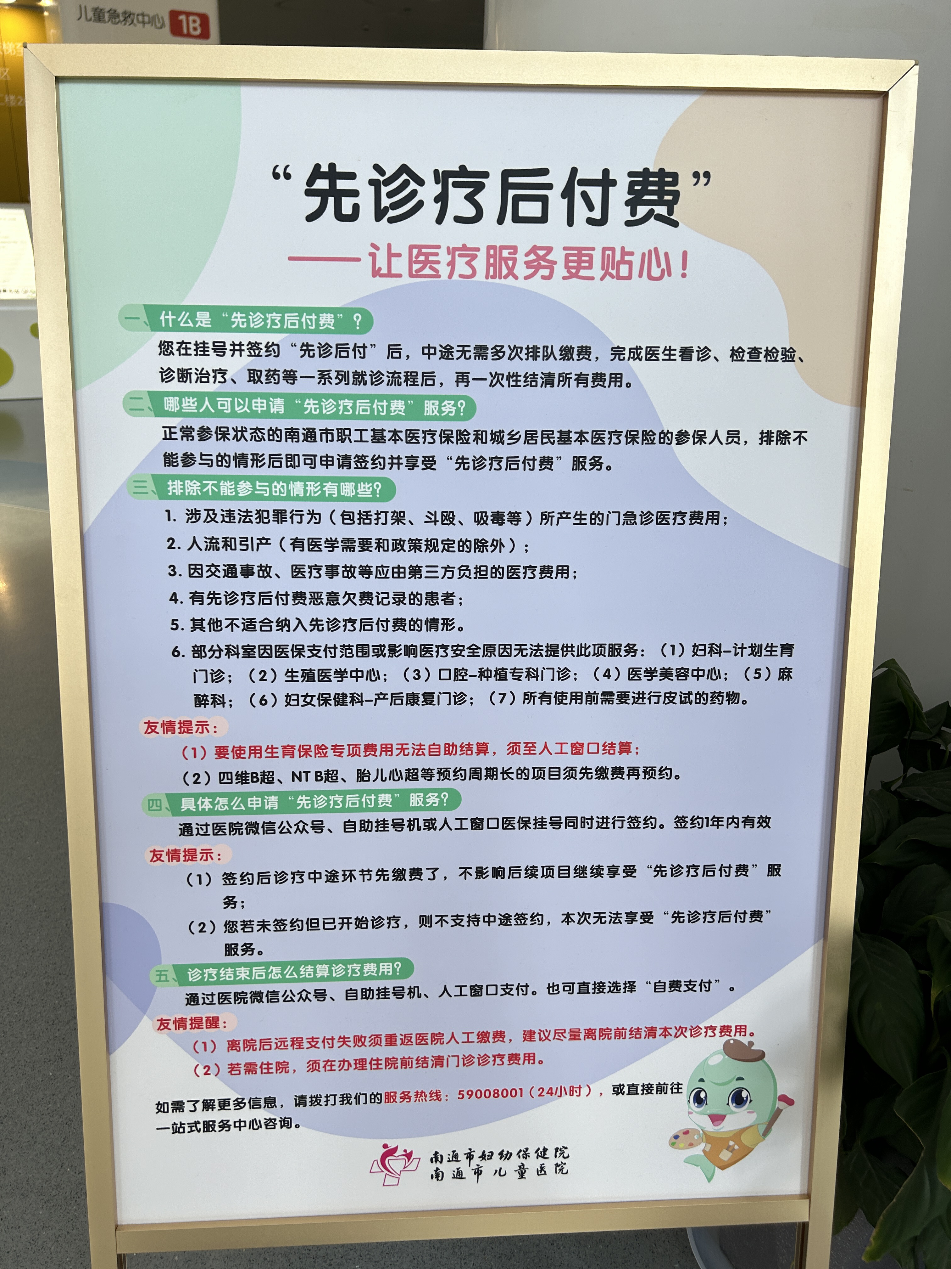 市妇幼保健院门诊部主任曹春裕提醒,为保障诊疗秩序,确保使用顺畅,建议患者在挂号时就完成授信签约步骤,并在完成诊疗离院前结清费用,以免远程支付失败还需返回医院人工窗口处理。目前在通大附院和市属8家医院,患者均可在人工窗口进行签约,或通过医院自助挂号机、医院微信小程序、支付宝等进行医保挂号时,将自动跳出“先诊疗后付费”签约弹窗进行签约。一次签约当年有效,本年度内再次就诊均可使用“先诊疗后付费”,无需再次签约。