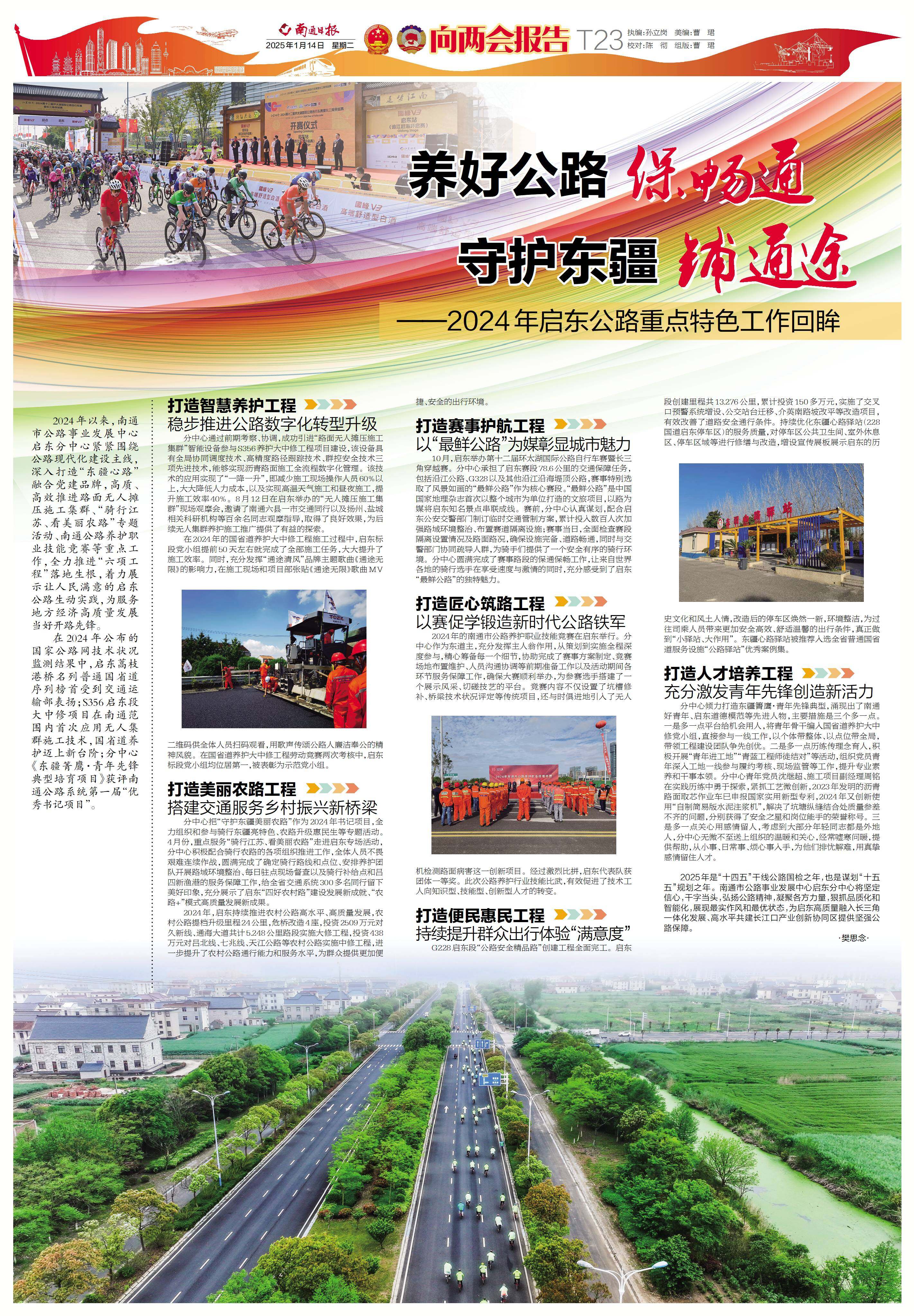 2024年,启东持续推进农村公路高水平、高质量发展,农村公路提档升级里程24公里,危桥改造4座,投资2509万元对久新线、通海大道共计5.248公里路段实施大修工程,投资438万元对吕北线、七兆线、天江公路等农村公路实施中修工程,进一步提升了农村公路通行能力和服务水平,为群众提供更加便捷、安全的出行环境。