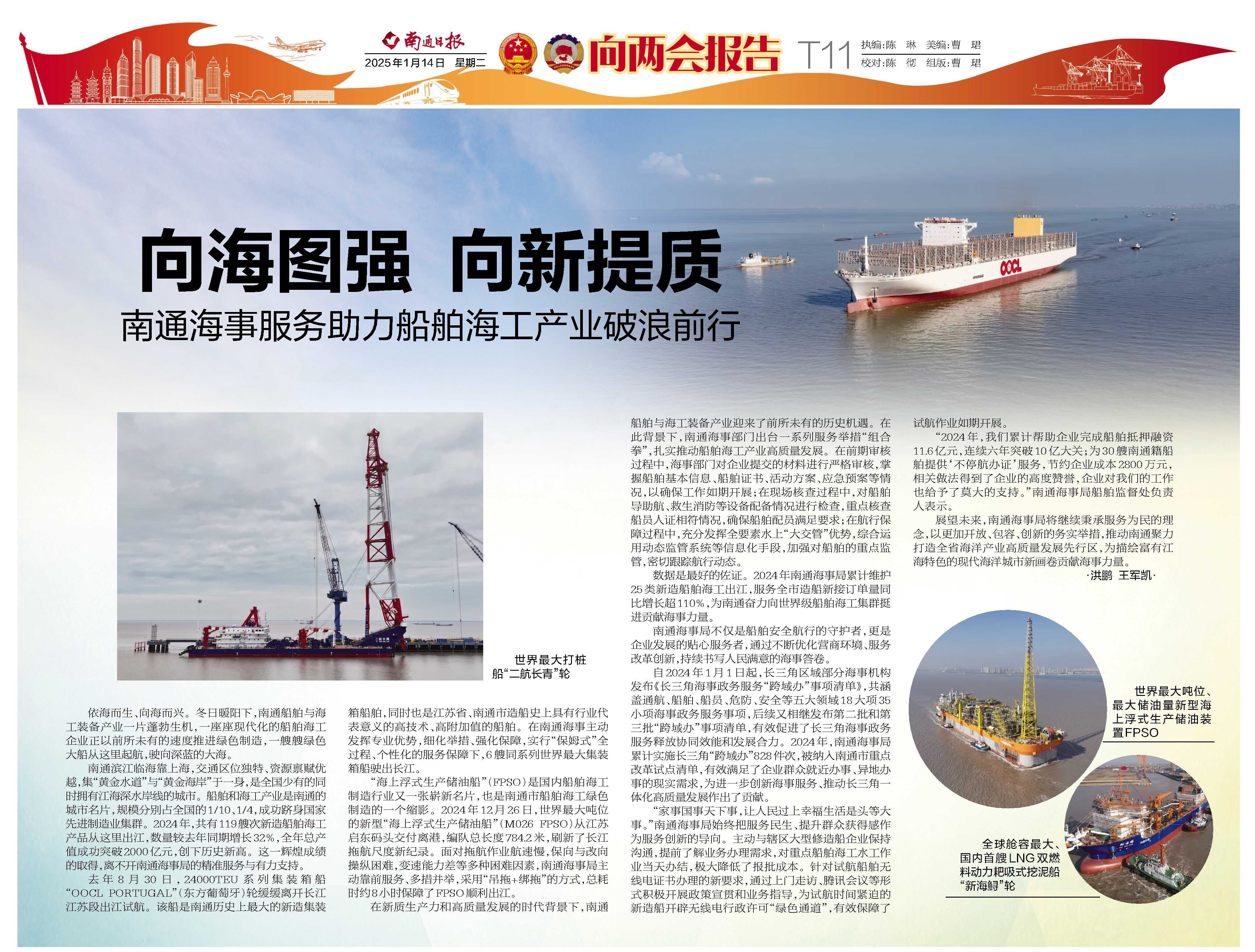 数据是最好的佐证。2024年南通海事局累计维护25类新造船舶海工出江,服务全市造船新接订单量同比增长超110%,为南通奋力向世界级船舶海工集群挺进贡献海事力量。