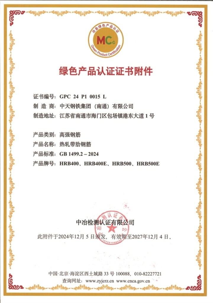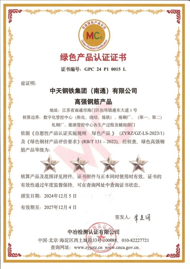 11月底,中天钢铁集团(南通)有限公司的HRB500E等高端绿色精品钢顺利通过“绿色产品”现场评价,荣获《绿色钢材产品评价要求》四星绿色产品标准。同时,HRB400E(B)、HRB500E(B)系列也顺利斩获MC冶金产品认证证书,标志该公司在绿色钢铁与高品质产品制造领域取得了里程碑式突破。