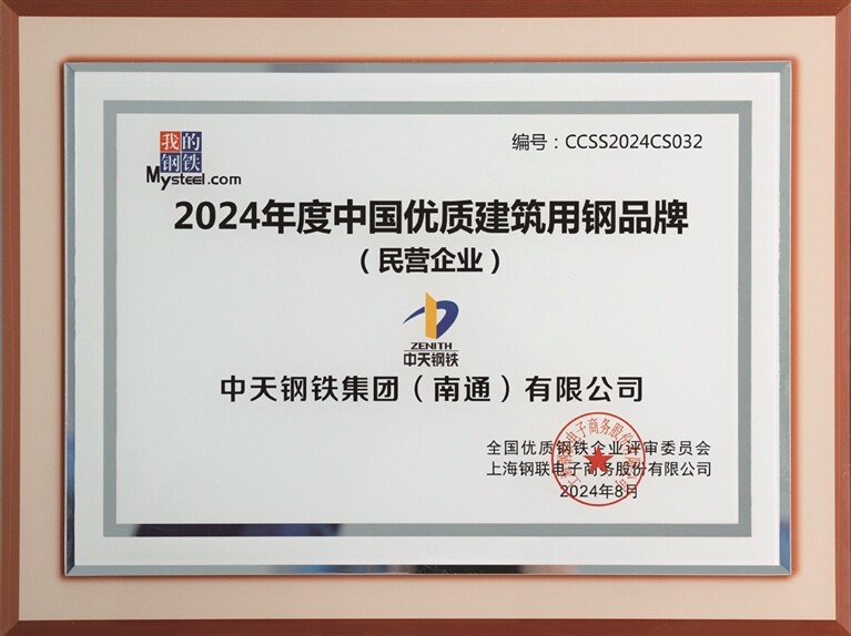 8月,中天钢铁集团(南通)有限公司荣获由全国优质钢铁企业评审委员会颁布的“2024年度中国优质建筑用钢品牌”称号。