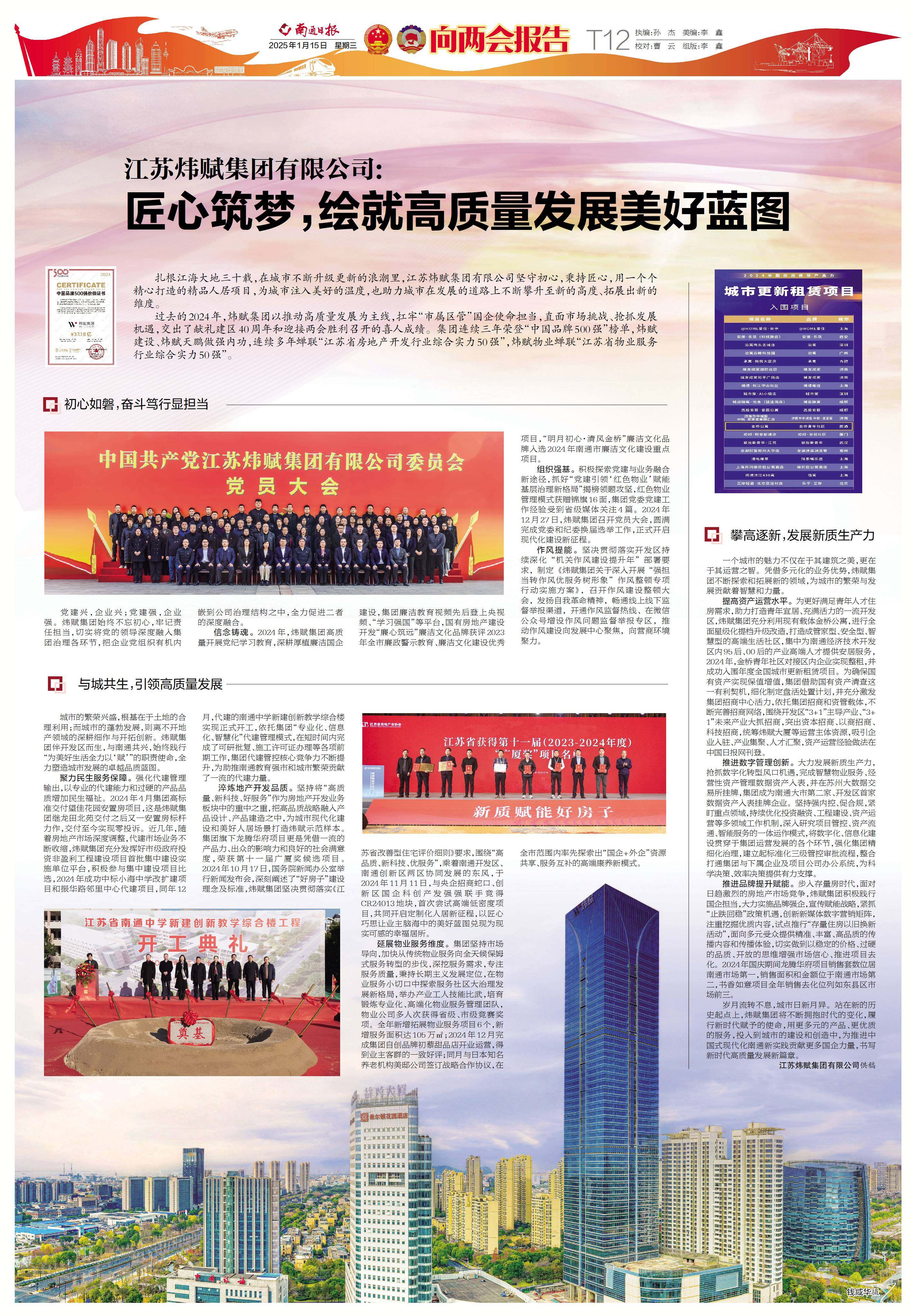过去的2024年,炜赋集团以推动高质量发展为主线,扛牢“市属区管”国企使命担当,直面市场挑战、抢抓发展机遇,交出了献礼建区40周年和迎接两会胜利召开的喜人成绩。集团连续三年荣登“中国品牌500强”榜单,炜赋建设、炜赋天鹏做强内功,连续多年蝉联“江苏省房地产开发行业综合实力50强”,炜赋物业蝉联“江苏省物业服务行业综合实力50强”。