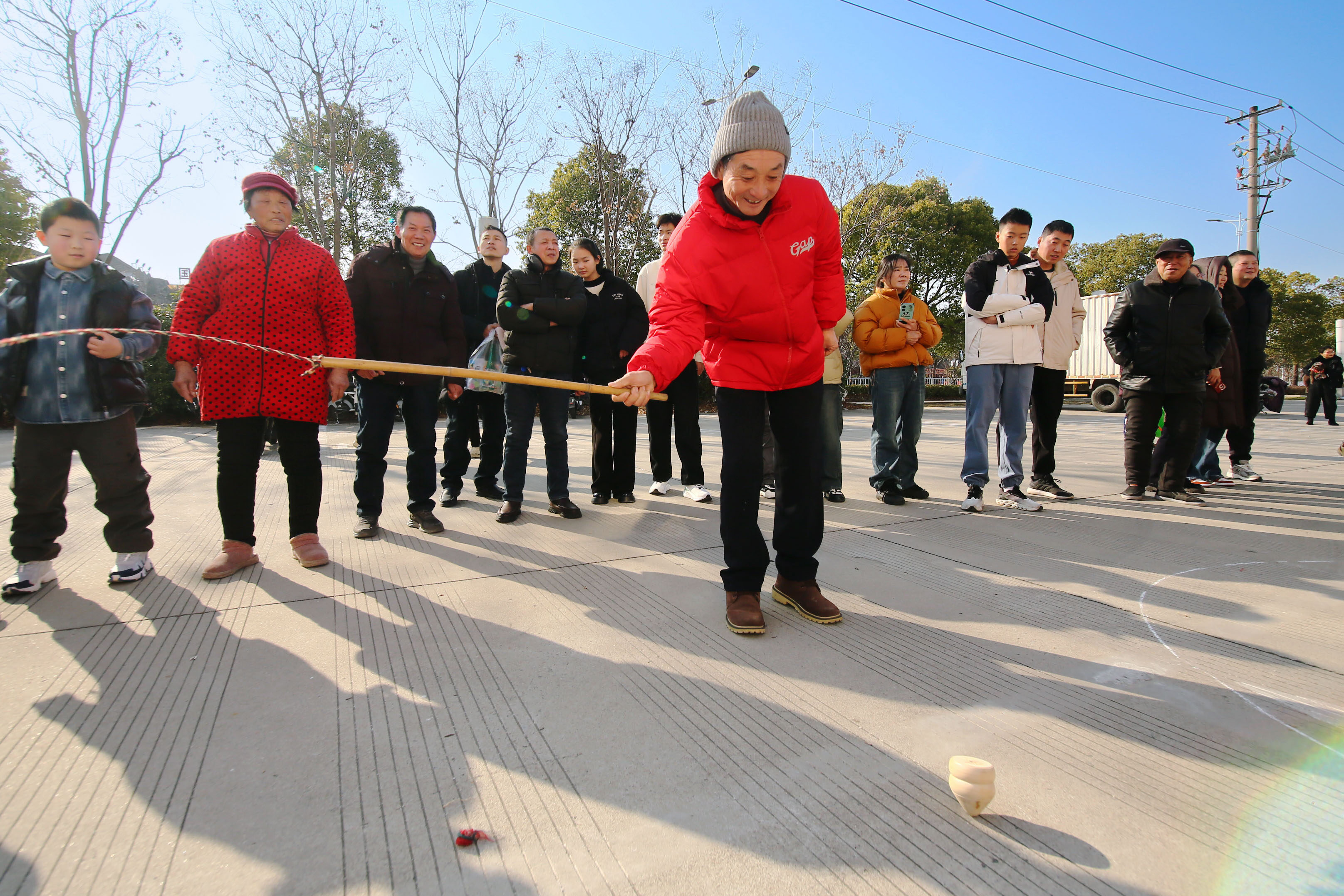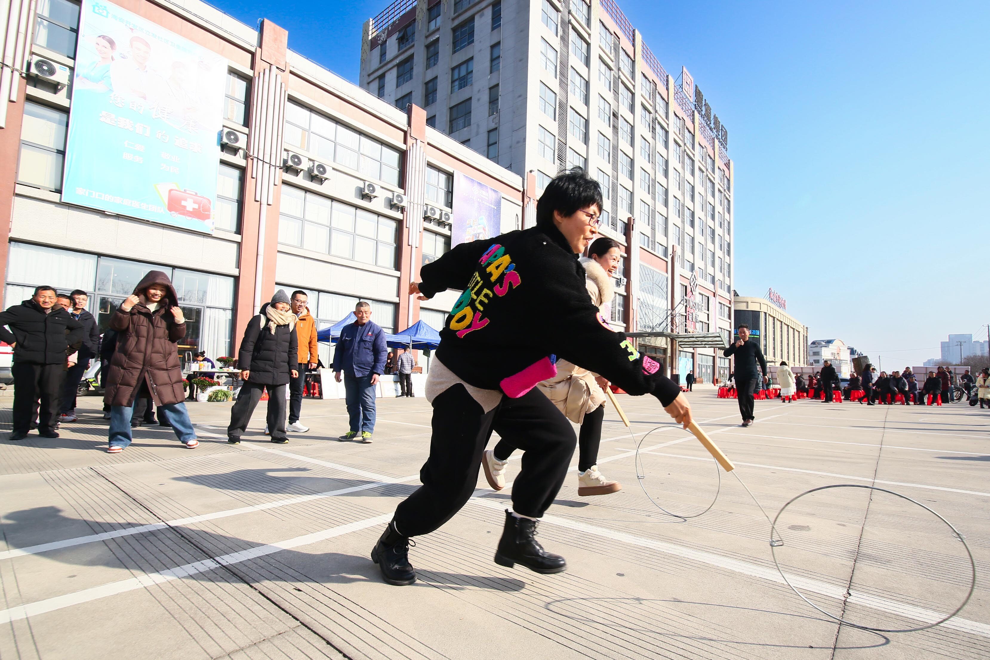 滚铁环、斗鸡、抽陀螺等传统游戏吸引不少市民带领孩子一起参加,欢度新春佳节。