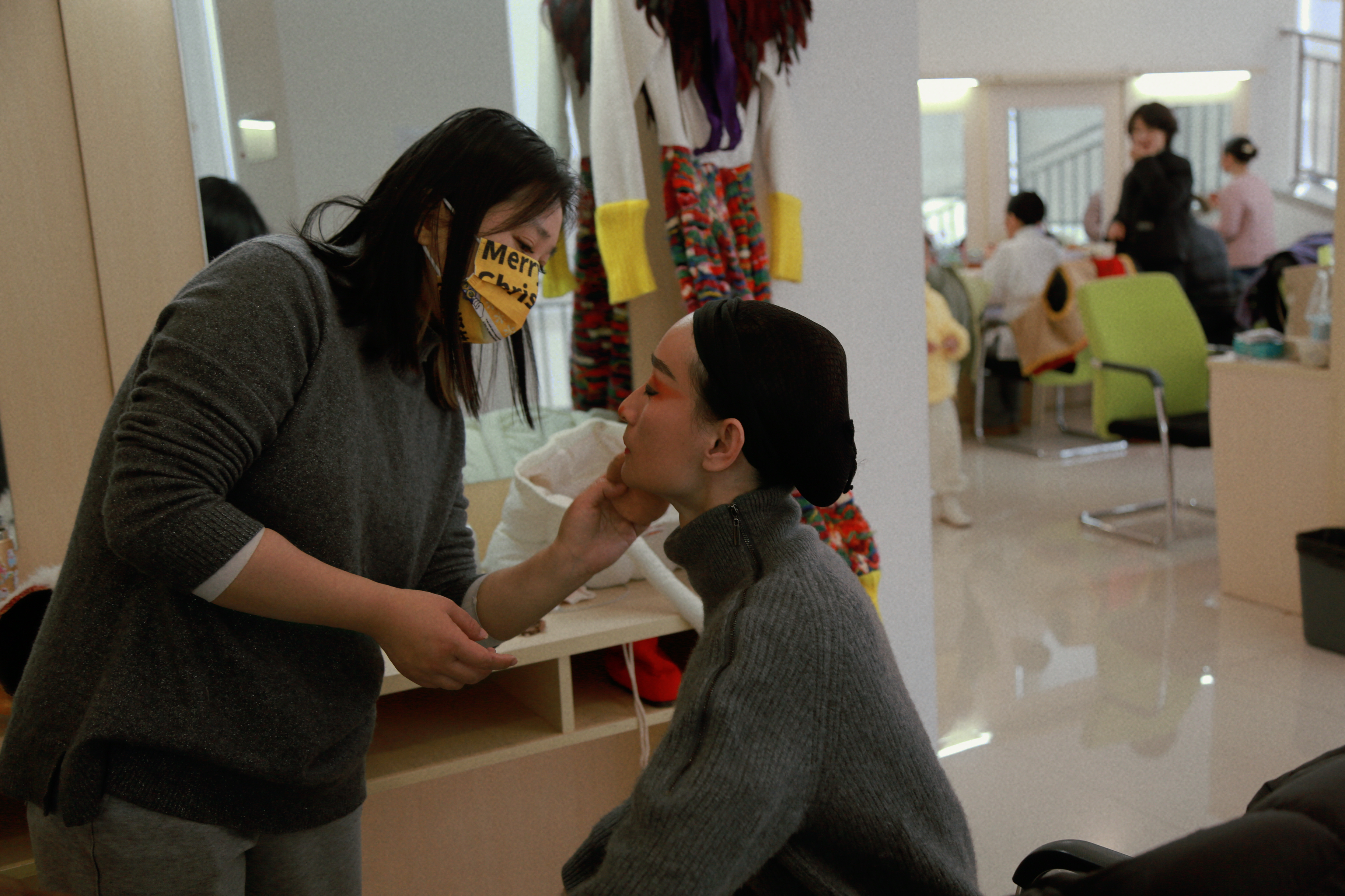 下午3点半,在持续不断的掌声中,第一场演出谢幕。演员们回到后台短暂休整。同为浙江老乡的何宣蓉和洪馨怡一边补妆一边聊着过节返通的经历。何宣蓉是正月初四中午12点从家出发的,父亲开车4小时送她到了南通,而老家在温州的洪馨怡也是前一天坐动车回来的,6个小时的车程,到南通已经是晚上11点。洪馨怡对着镜子补着汗湿的眼线,“这个年就算过完啦,看到孩子们这么喜欢这个剧,再辛苦也觉得值得。”