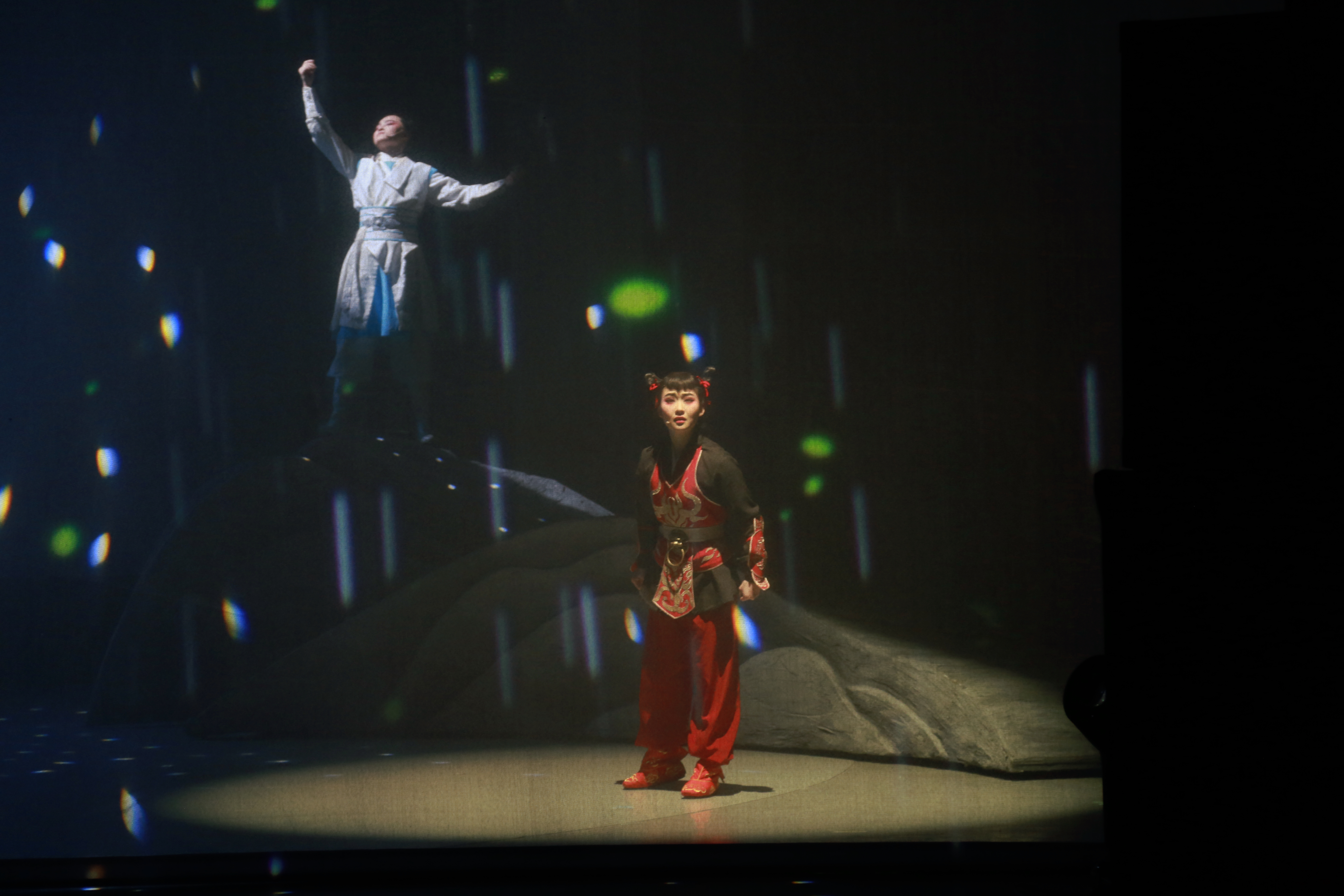 下午2点,第一场演出如期举行。故事讲述了哪吒邂逅乔装垂钓的姜子牙,获赠法宝《太公兵法》,然而因为“疏忽”,兵书被顽劣的红孩儿偷走,哪吒一路追至火云洞,就此展开了一场奇趣横生、惊心动魄的冒险。舞台上,演员们倾心表演,纱幕、多媒体、灯光、音效等技术营造出了激烈紧张、充满国风韵味的打斗场面,牢牢吸引着小观众的注意力。在侧台候场的江周楠微微探出脑袋观察着观众席的入座情况,长吁了一口气,“本来有点担心大过年的没人来看,没想到人还挺多的呀!”