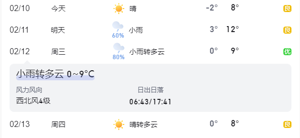 2月12日,小雨转多云,0~9℃。交警提示:元宵节期间,车流、物流和人流高度集中,请广大交通参与者提高安全意识,出行请关注天气变化和路况信息,合理安排出行时间和行驶路线。