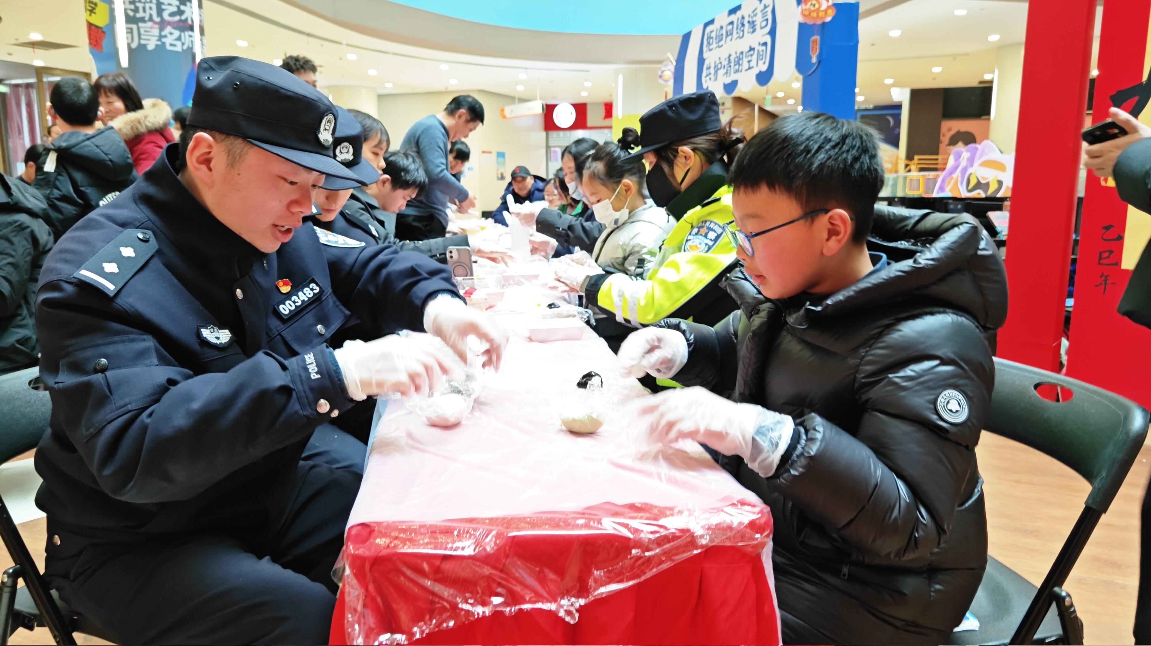 在猜灯谜区域,长航南通公安南通派出所民警搭建起普法摊位,将反诈知识融入元宵节传统猜灯谜活动,鼓励大家积极作答,居民们纷纷驻足,踊跃参与。元宵制作区域同样热闹,民警与居民们一齐动手,揉糯米团、包香甜馅料、品尝元宵,感受美食传递的团圆寓意。