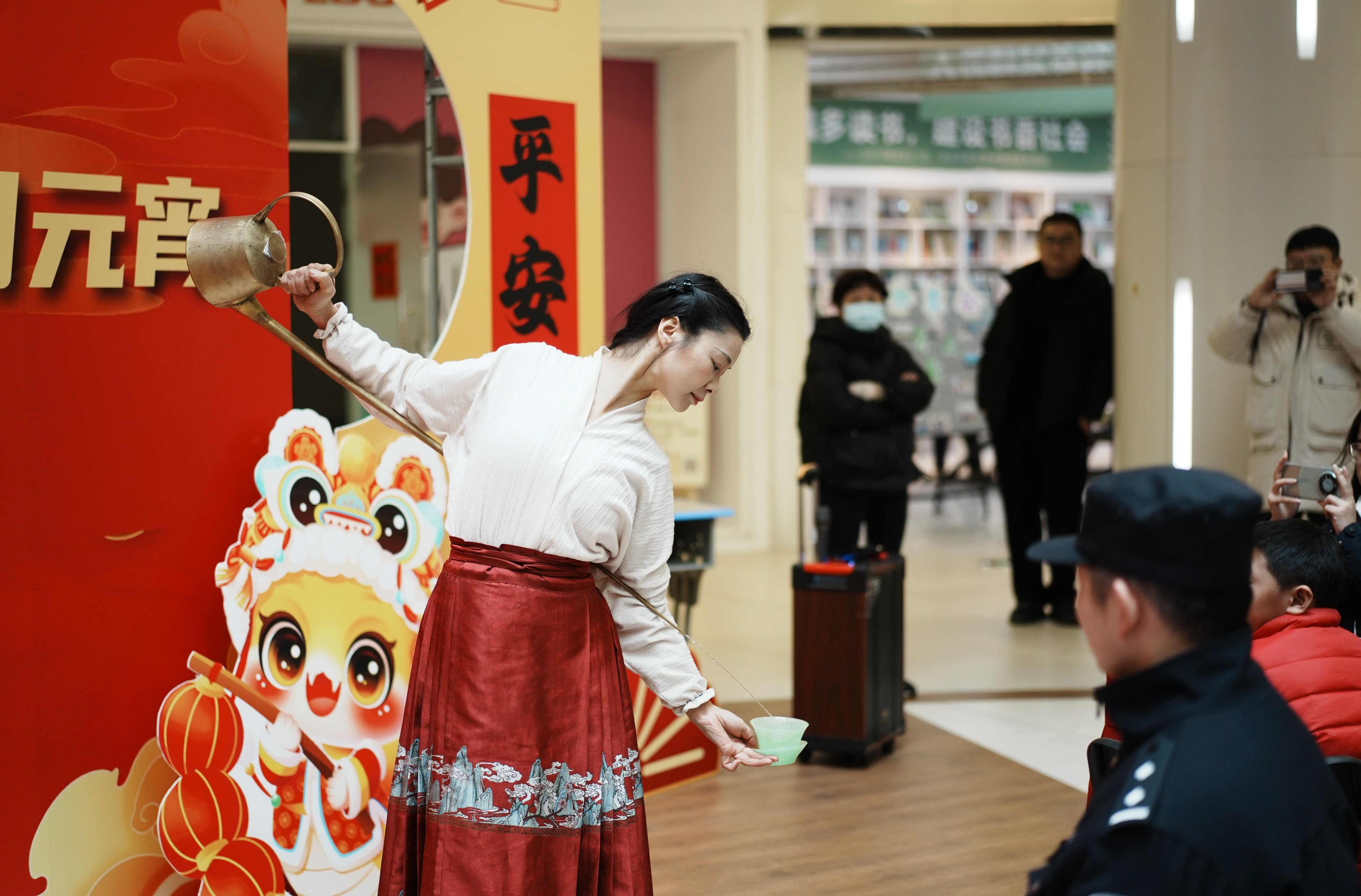 南通市全民阅读推广人成然化身“文化引路人”,带领大家开启了一场穿越时空的诗词之旅。国家级高级茶艺师、长嘴壶非遗传承人张金文一展非遗技法,手中的长嘴壶犹如灵动的蛟龙,细长的水柱从壶嘴飞泻而出,精准地落入杯中。