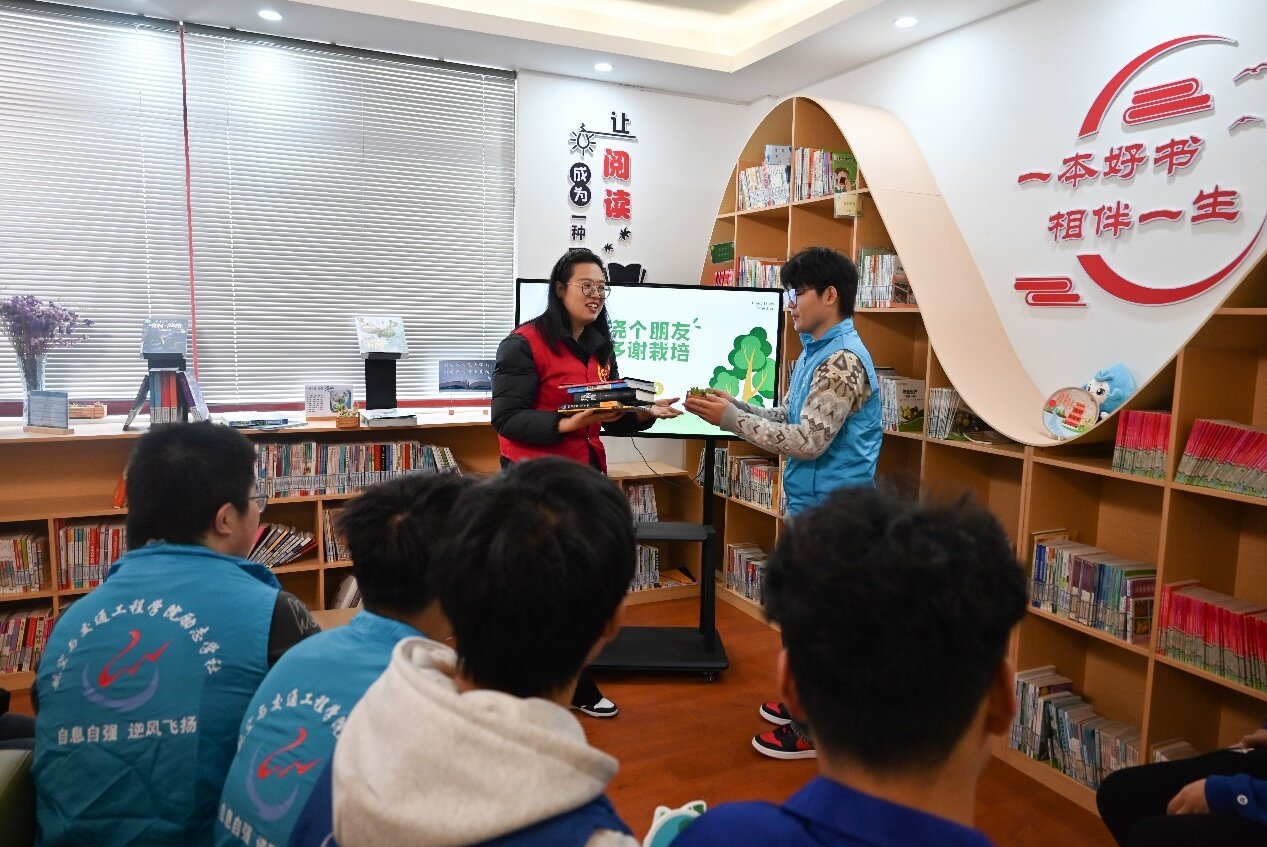在港新村法治文化广场,学院志愿者们现场演示科学种植技巧,与村民齐心协力种下新树苗,以实际行动践行绿色发展理念。大家围坐共读,朗读环保书籍选段,并结合“树木固碳”与生态保护理念展开讨论。在海韵书舍,志愿者们组织开展“以书换绿”公益行动,鼓励村民和学生捐赠闲置书籍,每捐一本书,可兑换一盆多肉植物。所募书籍将统一捐赠至港新村农家书屋,为乡村孩子带去更多阅读资源,促进乡村文化建设。