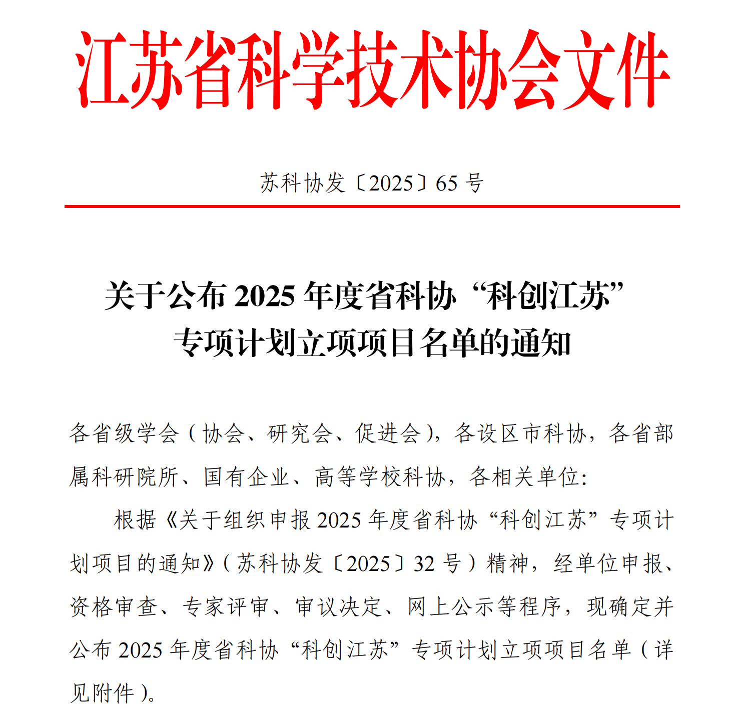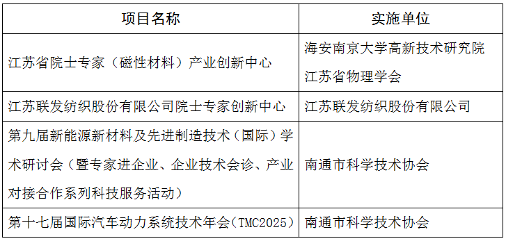 记者21日从市科协获悉,江苏省科协发布《关于公布2025年度省科协“科创江苏”专项计划立项项目名单的通知》,我市4个项目获立项资助,分别是江苏省院士专家(磁性材料)产业创新中心、江苏联发纺织股份有限公司院士专家创新中心、第九届新能源新材料及先进制造技术(国际)学术研讨会、第十七届国际汽车动力系统技术年会等。