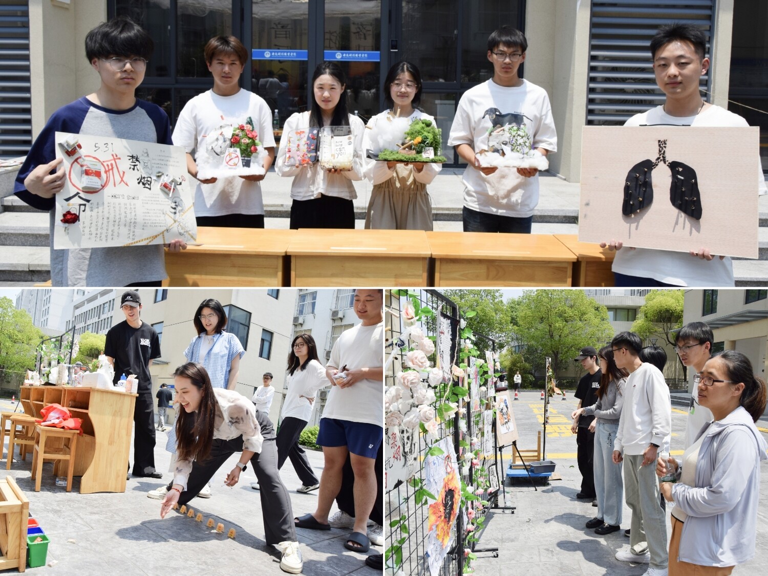 当天活动内容丰富多样,知识拓展区答题有奖活动颇受欢迎。只见师生们转动设置好的转盘抽取禁烟知识问答题目,题目涵盖烟草危害、二手烟影响、戒烟方法、控烟政策等多个方面。“这面签名墙是我们在废弃床单上涂鸦制作而成的。”“我承诺,我健康”禁烟签名墙别具一格,师生们纷纷在签名墙上郑重签下自己的名字,表达对无烟校园的支持与承诺。一旁的创意打卡点也吸引了众多师生拍照留念,打卡点配备的特色背景和用废纸盒制作的标语道具,也都充满了环保元素。