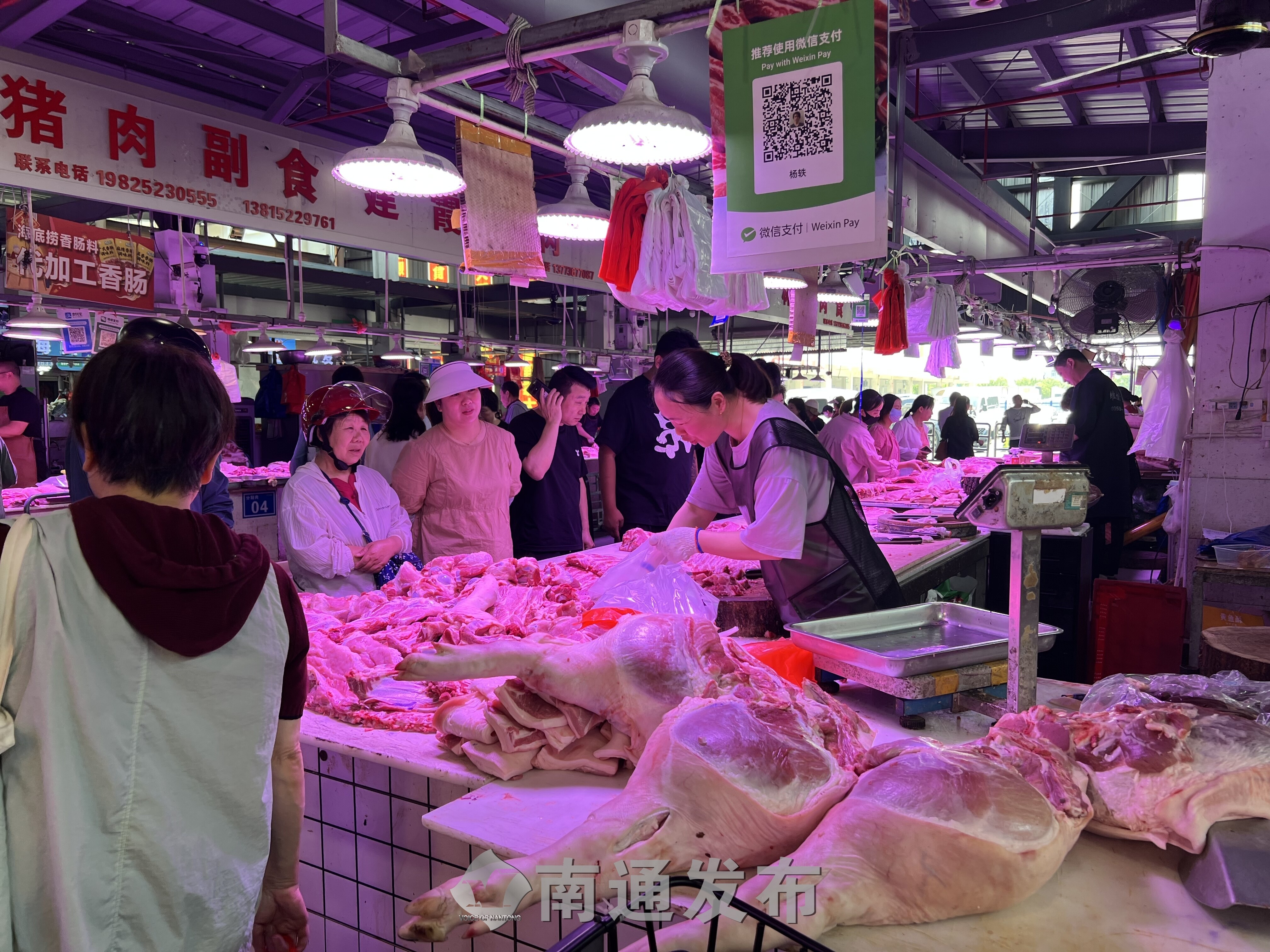 沪蔬通是南通地区重要的农副产品批发市场之一,集农副产品批发、加工、仓储、配送等服务于一体,是连接“田间”与“餐桌”的重要纽带。端午期间,沪蔬通水产肉类每日供应量充足,其中,猪牛羊肉52吨,光鸡鸭鹅31吨,鱼虾蟹等水产21吨,各类熟食16吨。此外,沪蔬通冷库内还仓储有冻品类2万吨、海鲜类5700吨、蔬菜类600吨、水果类1600吨,确保南通及周边地区物资供给稳定。