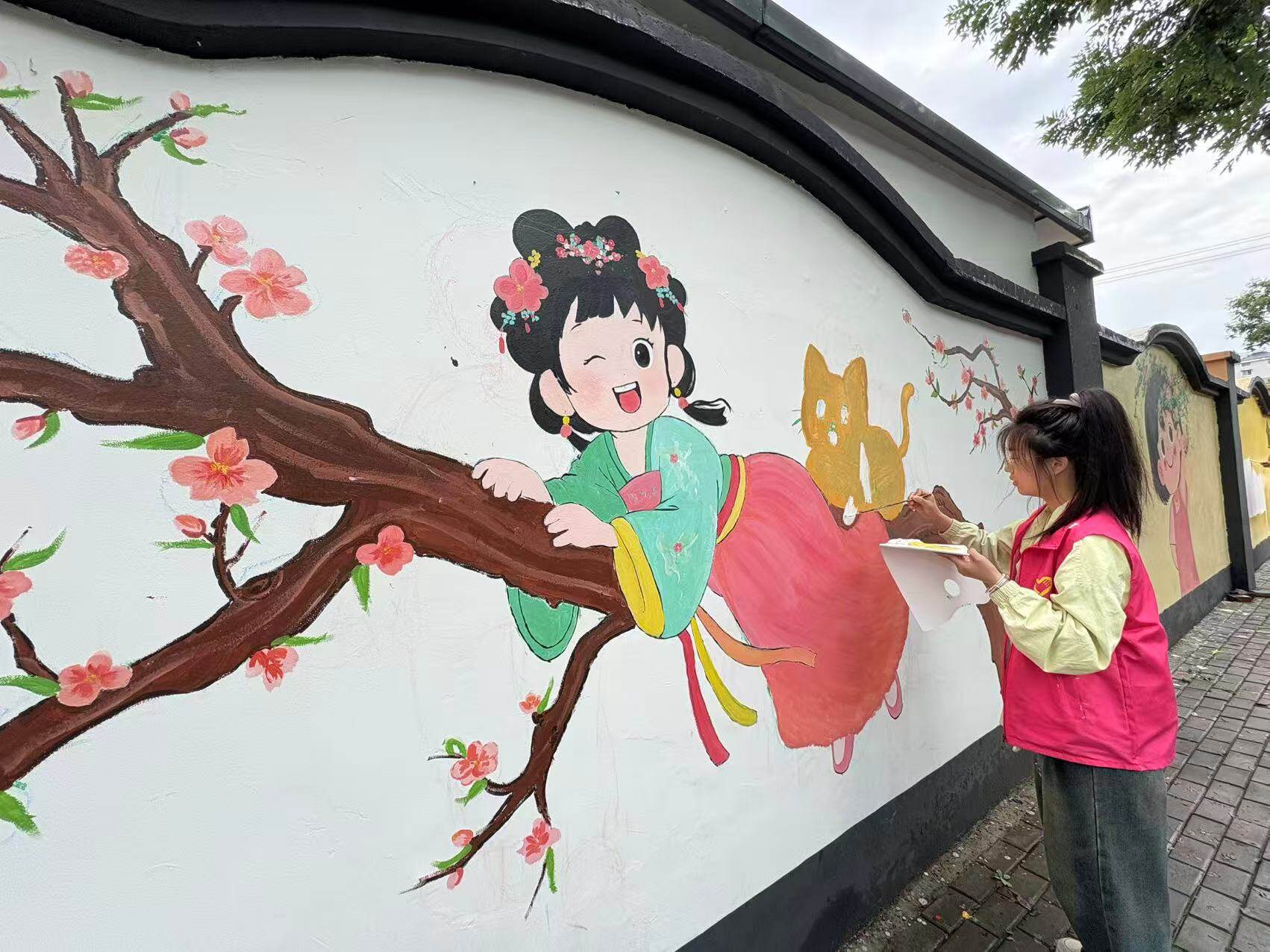 当传统笔触邂逅都市烟火,一面面水泥墙化身流动的艺术长卷。11日,市区鹤涛路在“艺绘幸福 青春同行”墙绘活动中焕新亮相,江苏商贸学院世博艺术与传媒学院师生组成的志愿服务团队联合幸福街道转水社区,以画笔为媒将国风元素与童趣创意融入墙体,打造四大主题艺术墙,让老街巷变身新晋“打卡地标”。