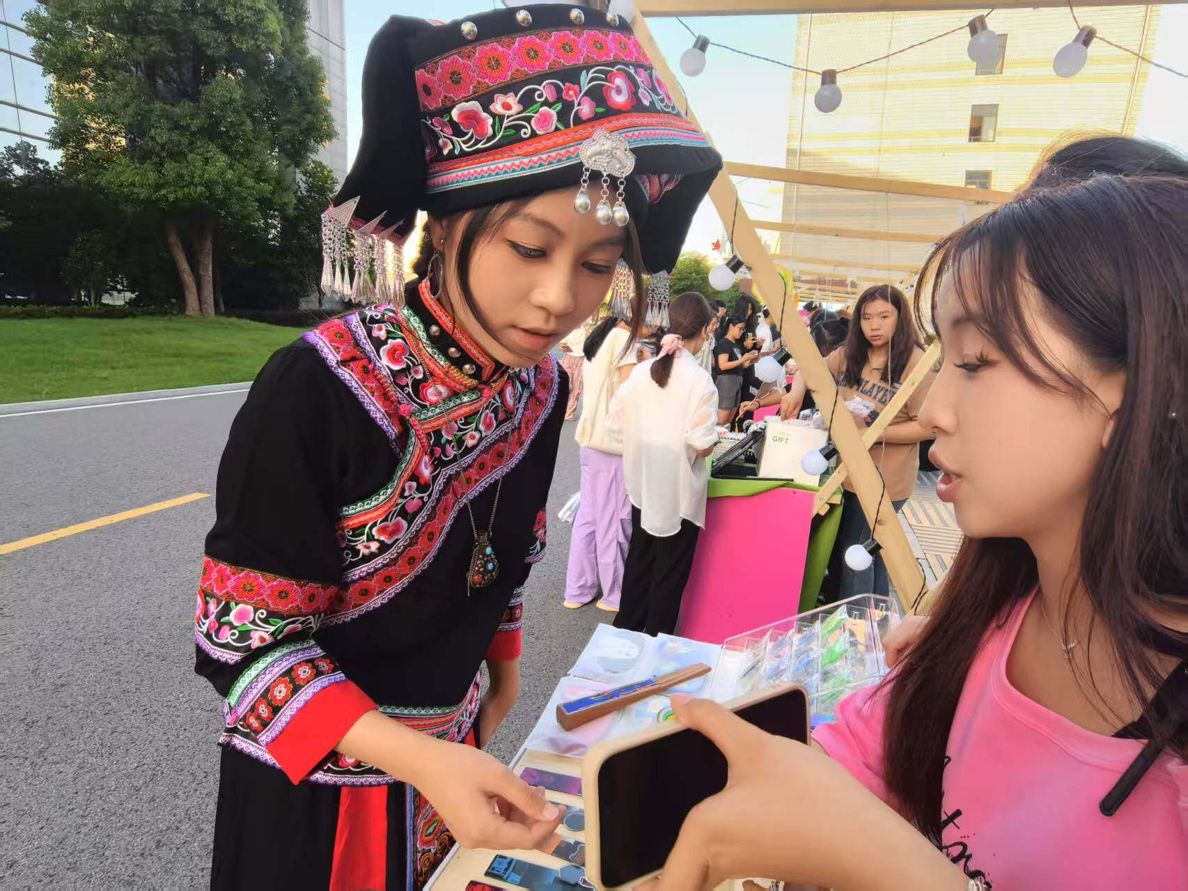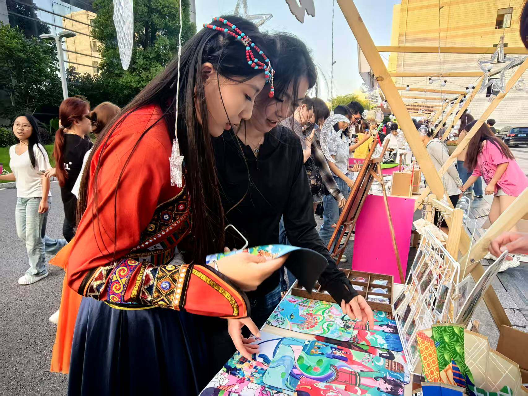 活动现场,张蕾大师工作室带来的刺绣香包作品格外引人注目。作品将传统蓝印技艺与刺绣完美融合,在保留非遗精髓的同时展现了时尚创意。李楠老师指导学生设计的手绘丝巾,以江海文化为核心创作灵感,将南通独特的江海风情与传统绘画完美融合。毕业生创业展区同样亮点纷呈。2025届毕业生、户金莹和潘静等同学的毕业设计,为“小物有物”工作室带来了富有生命力的文创产品,吸引众多参观者驻足体验。这些产品以非遗文化为底蕴,从非遗工作坊汲取灵感精心设计。每一件都承载着传统文化的厚重,也闪耀着同学们创新的光芒。