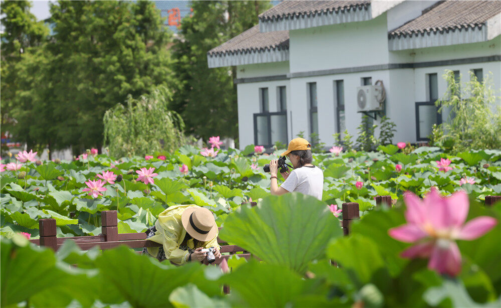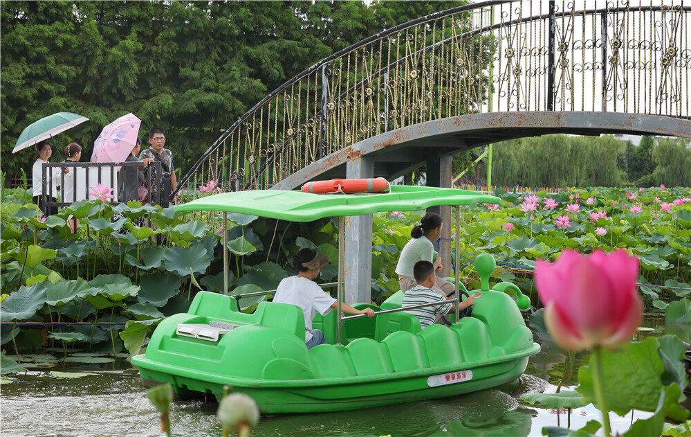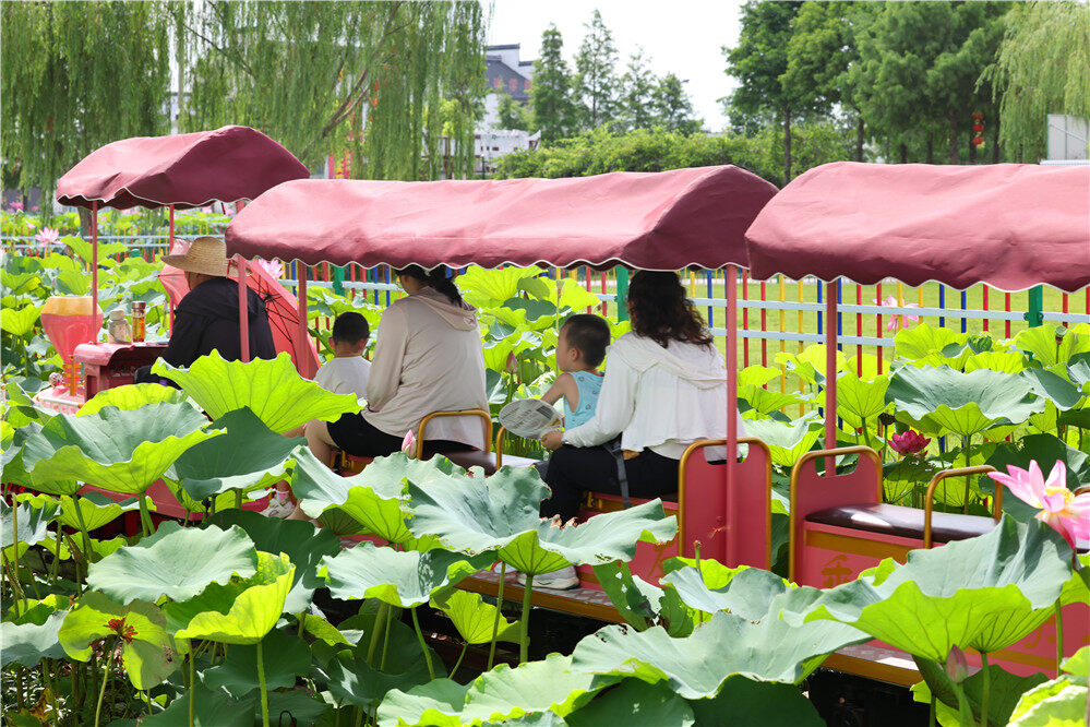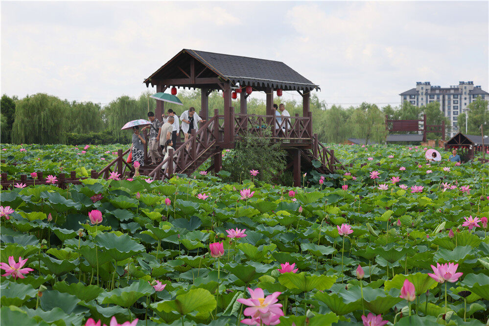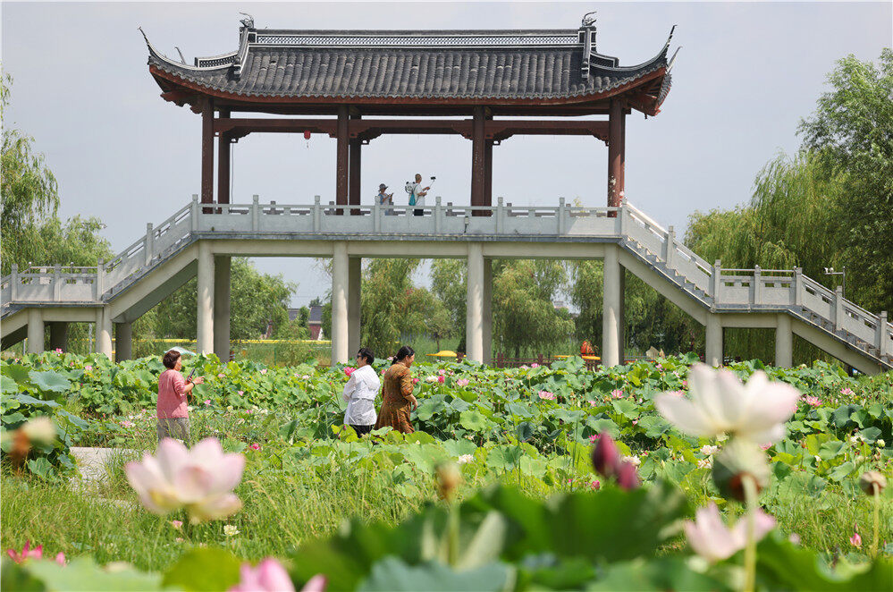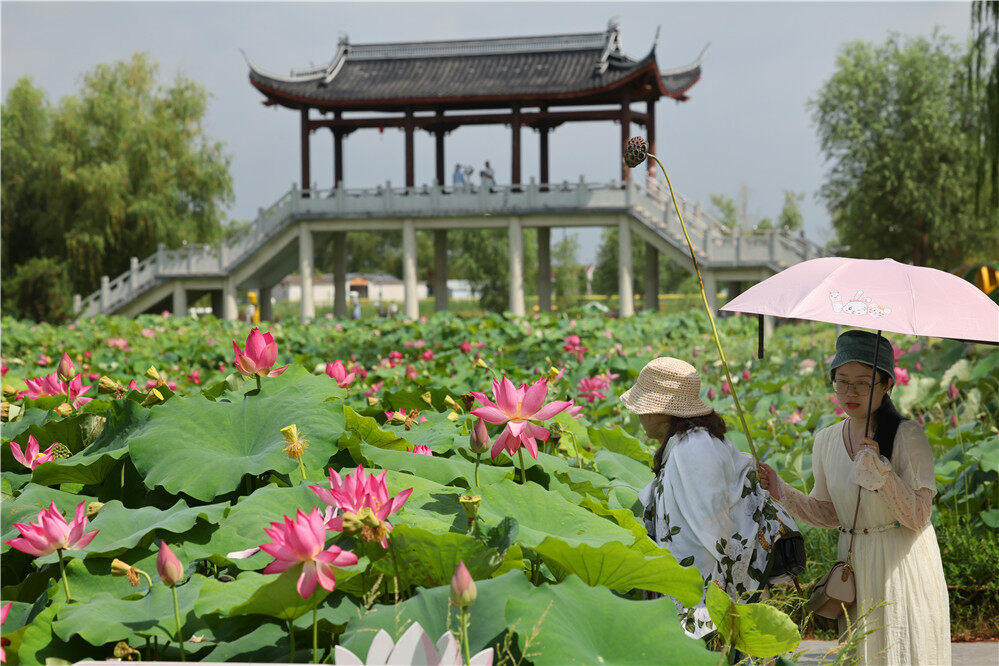 2025年7月19日,游客在如皋市平园池村千亩藕池文化园赏荷游览。