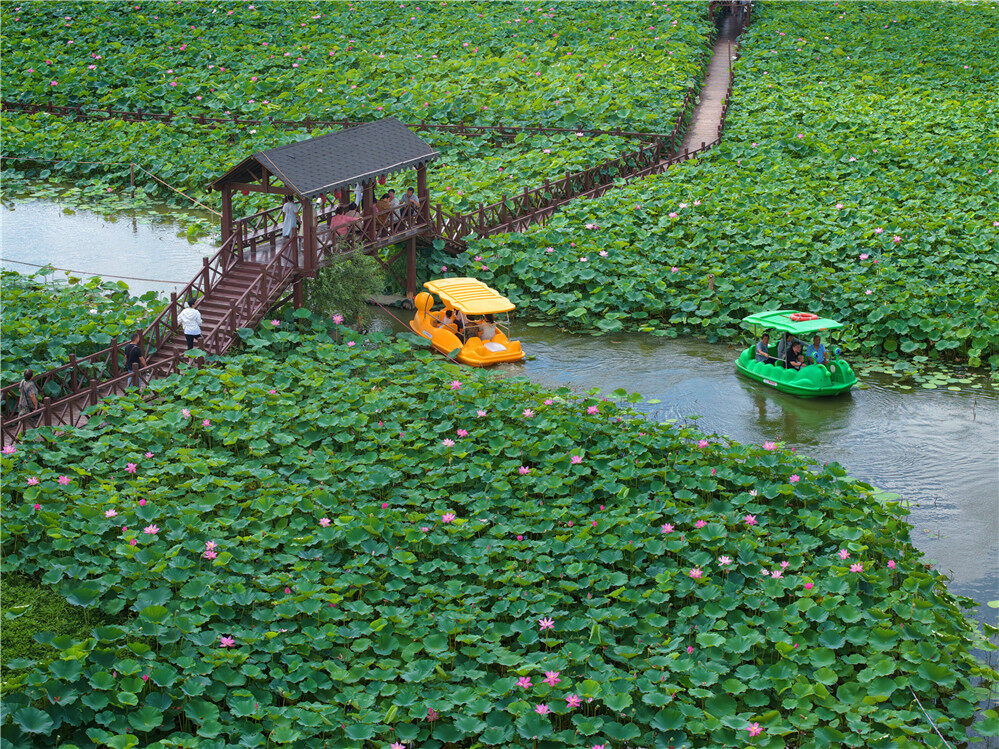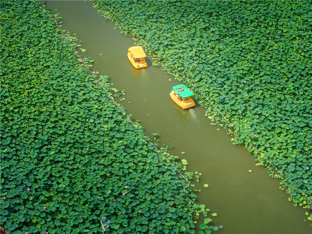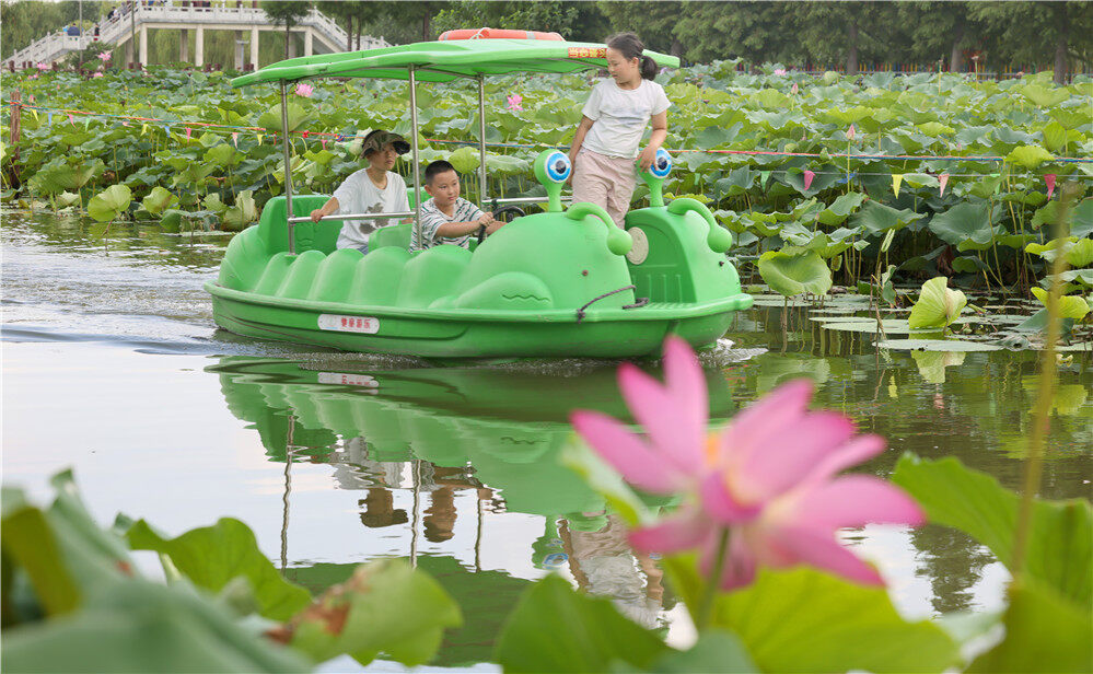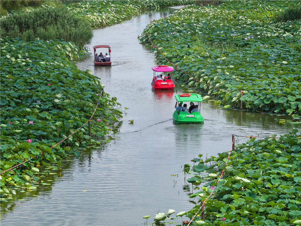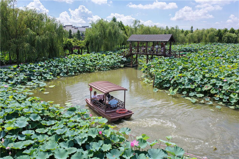 2025年7月19日,游客在如皋市平园池村千亩藕池文化园赏荷游览。