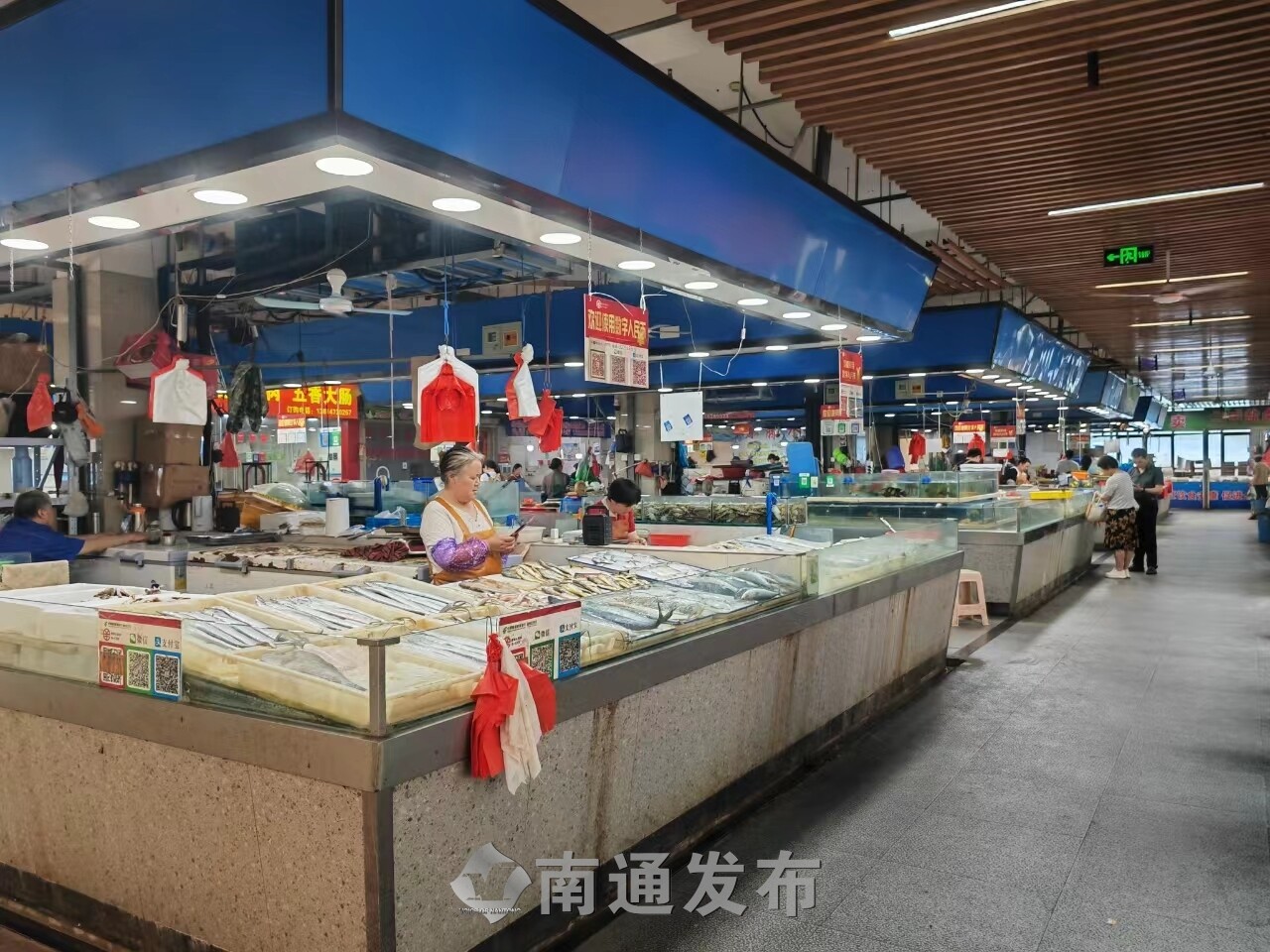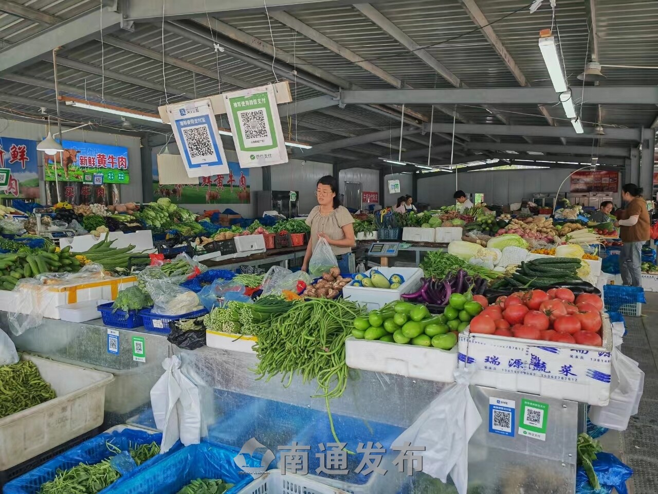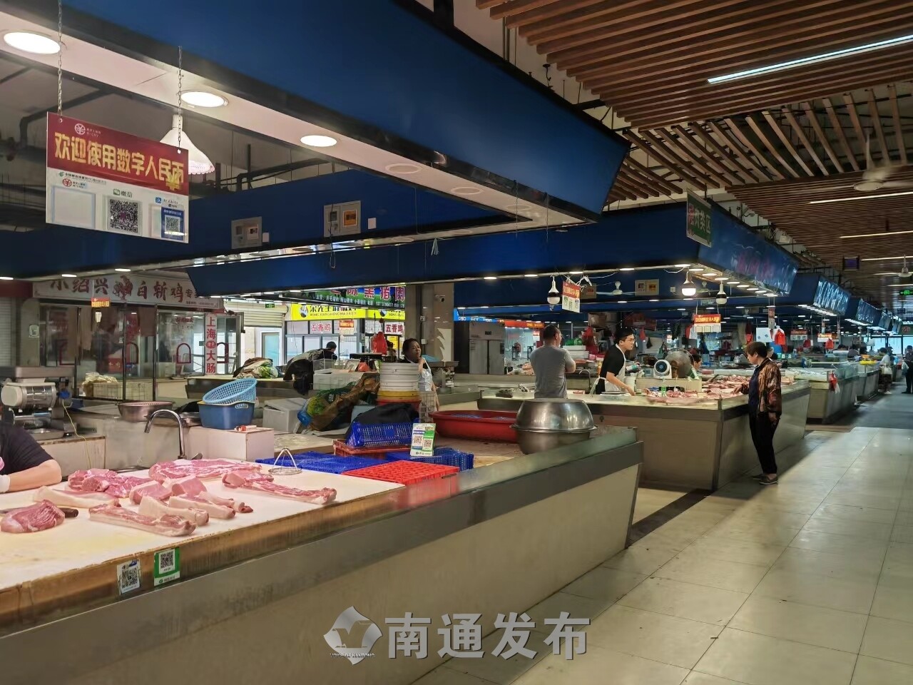 走进南通腾众农贸市场,首先映入眼帘的是排列整齐的摊位与干净整洁的地面。与传统市场夏日闷热的氛围不同,该市场棚顶下方安装了多台风扇,让整个市场清爽舒适。此外,市场还根据蔬菜、畜禽肉、水产等品类进行分区,让顾客可以轻松找到所需商品。“我就住在附近,所以经常来这个菜市场买菜。这里干净、卫生、方便,菜也比较新鲜。”市民朱先生笑着说。