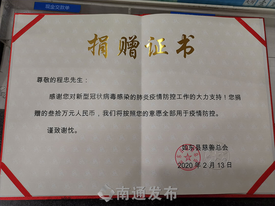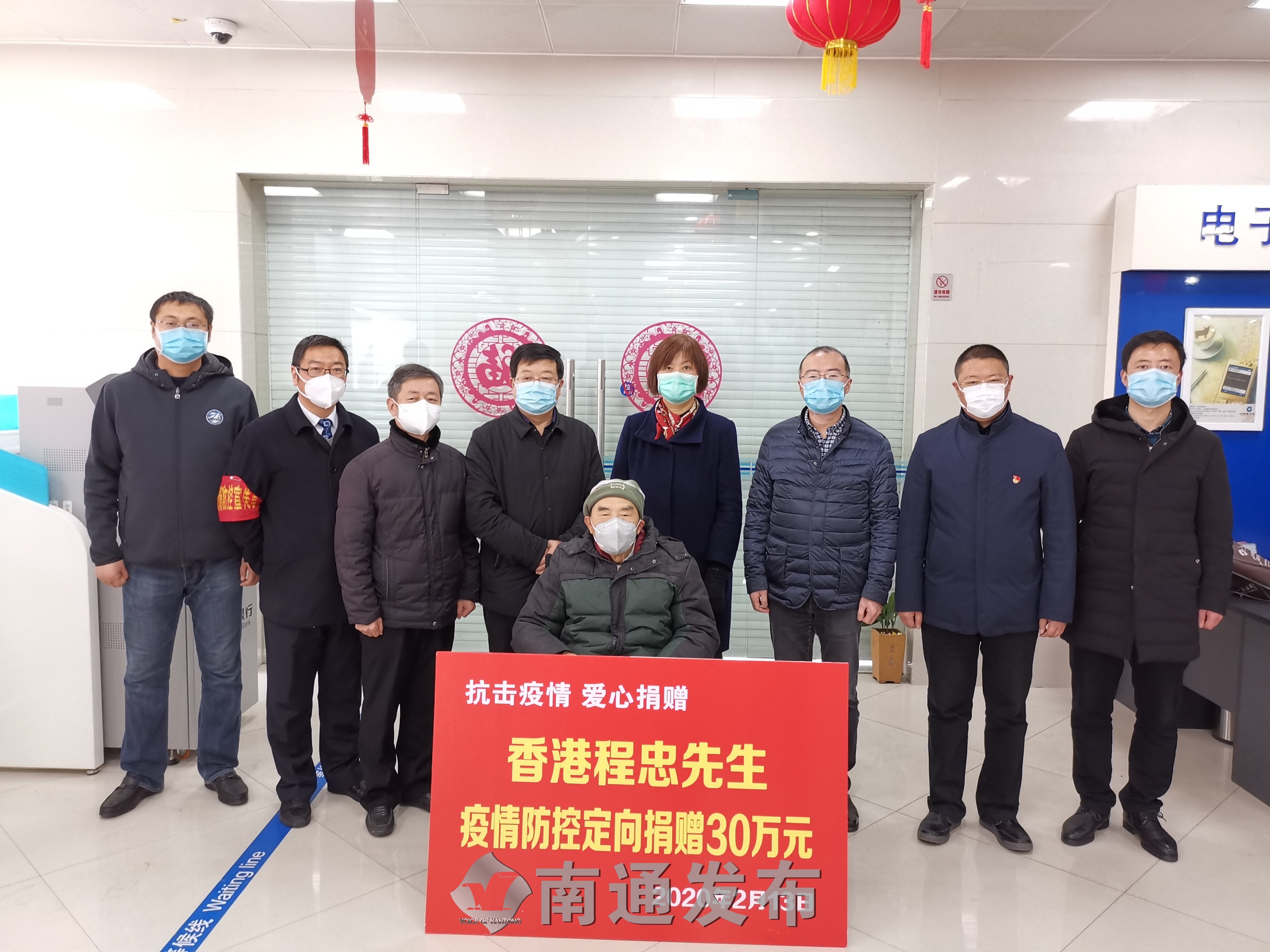 2月7日一大早,香港同胞程忠先生(祖籍如东栟茶)给如东县侨联负责同志打电话,他说,这些天,我一直睡不好觉。武汉和全国的疫情紧紧揪住了心,坐在家里,寝食不安。我能做些什么呢?说到这里,他毅然决定捐款300万元,用于新冠肺炎疫情防控。2月13日,程忠把爱心款项已汇至县慈善总会专用慈善账户。他动情地说,我在香港从事了钳工、水电工、计程车司机等职业,也没有多少积蓄,能帮多少是多少。去年,程忠先生还向栟茶镇人民政府和阳光福利中心捐款30万元。
